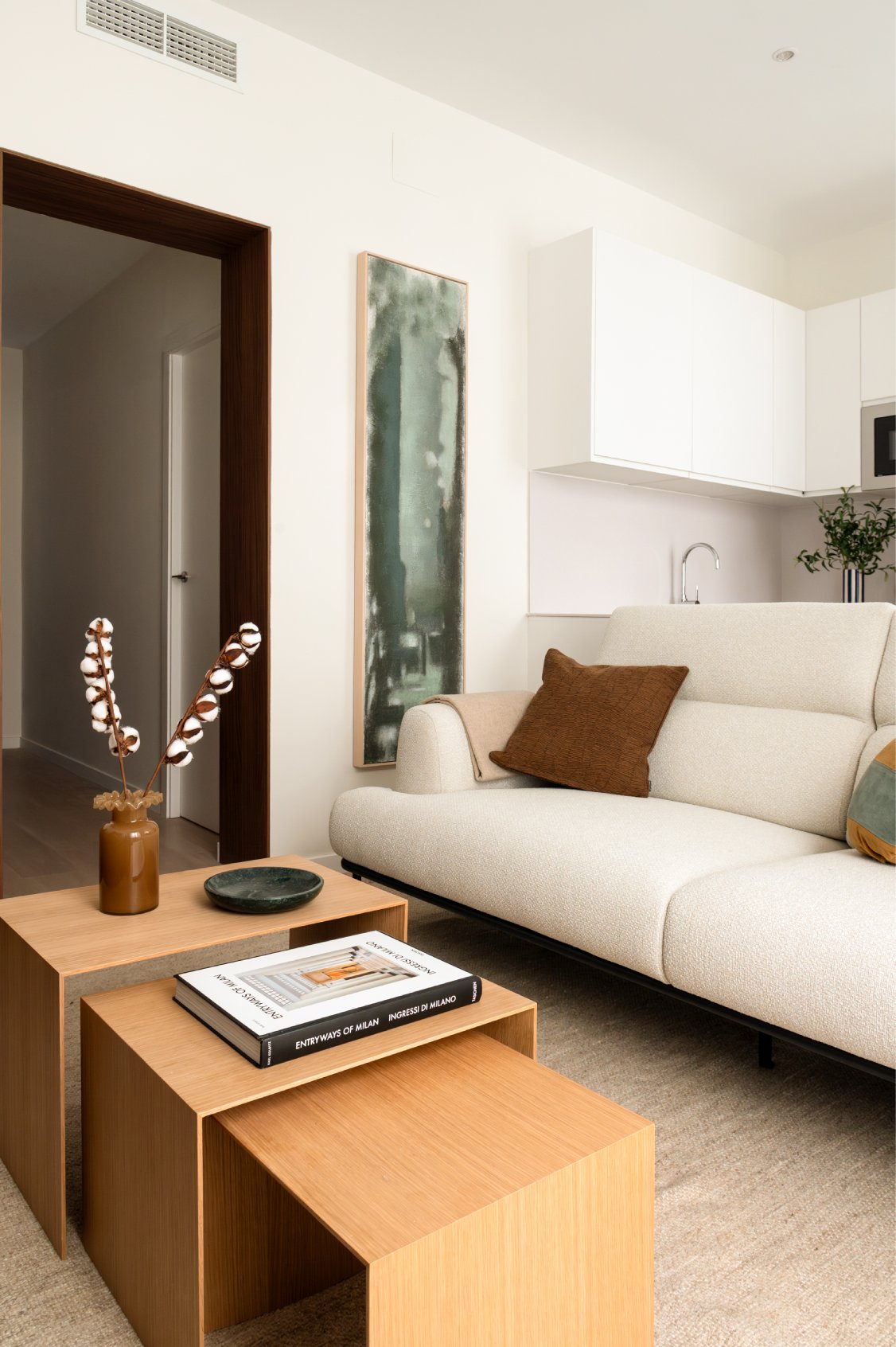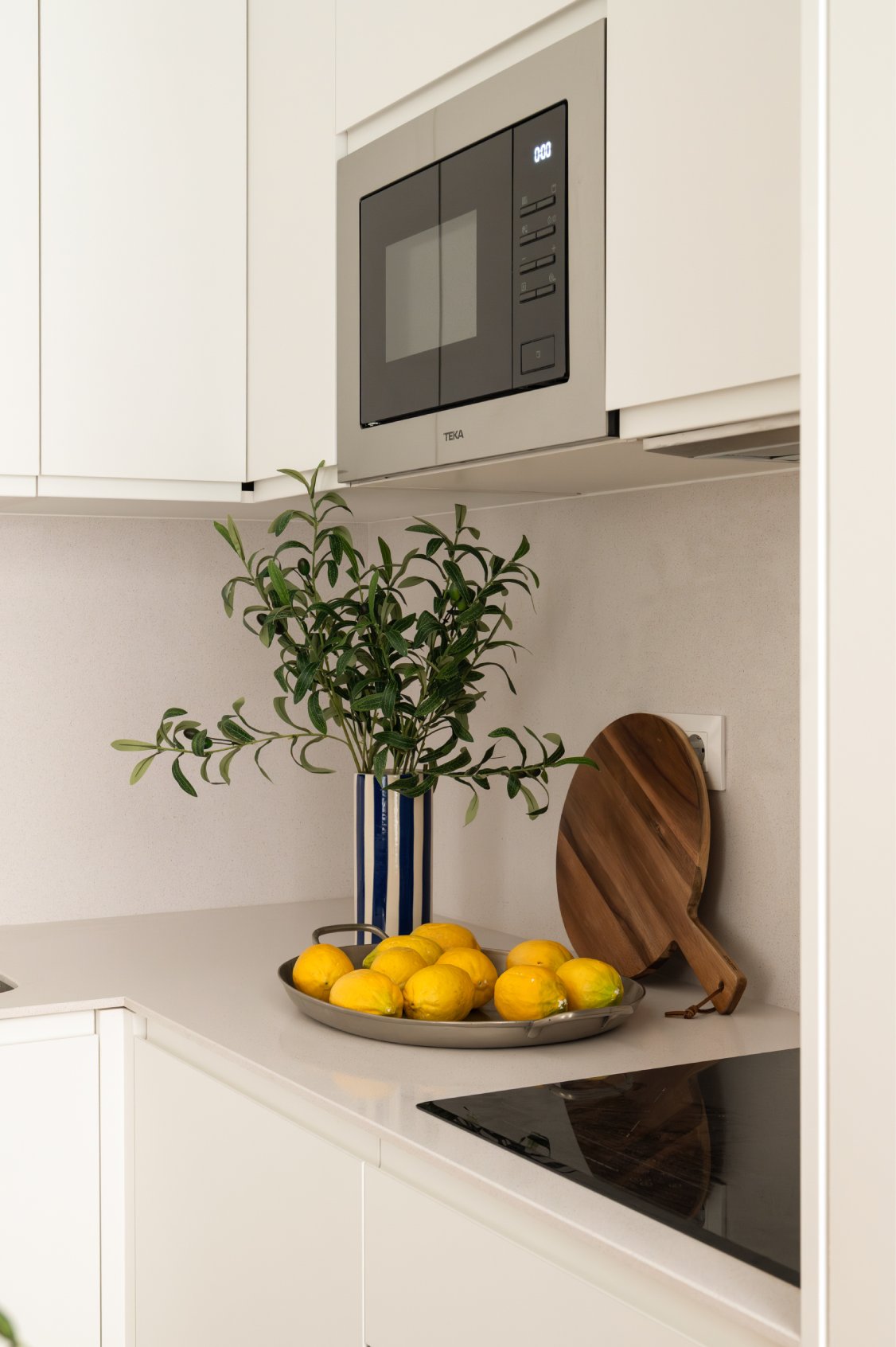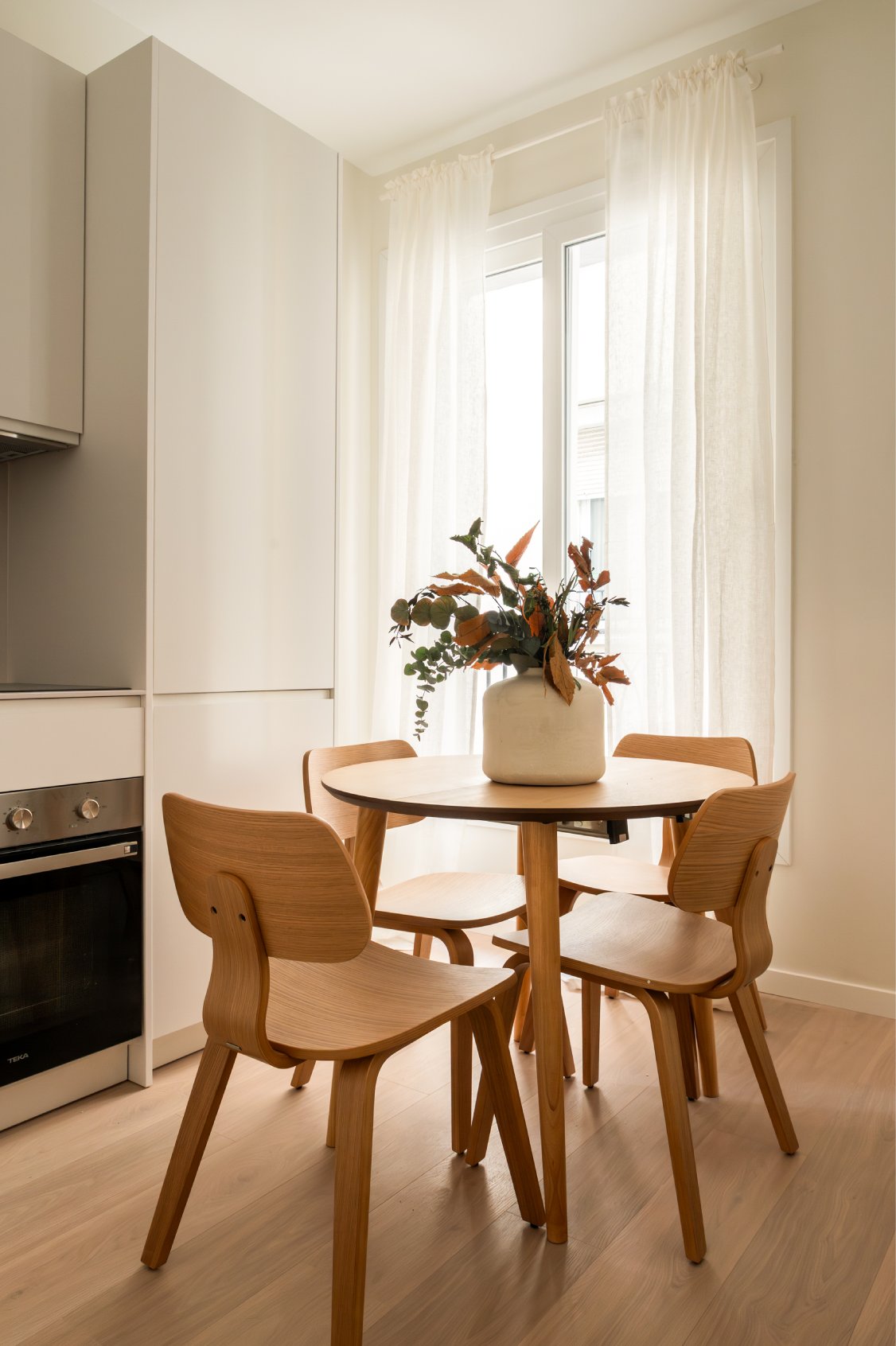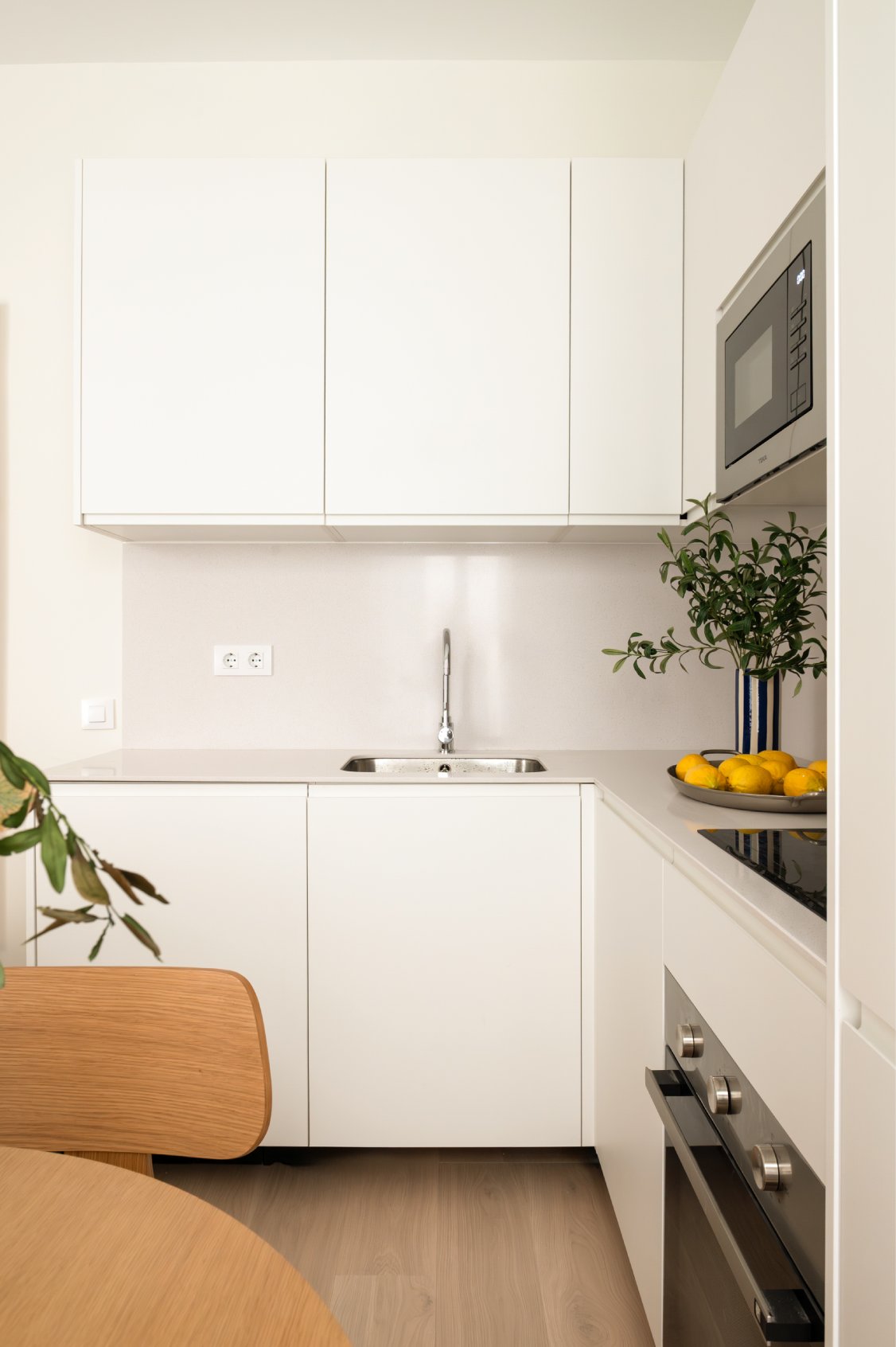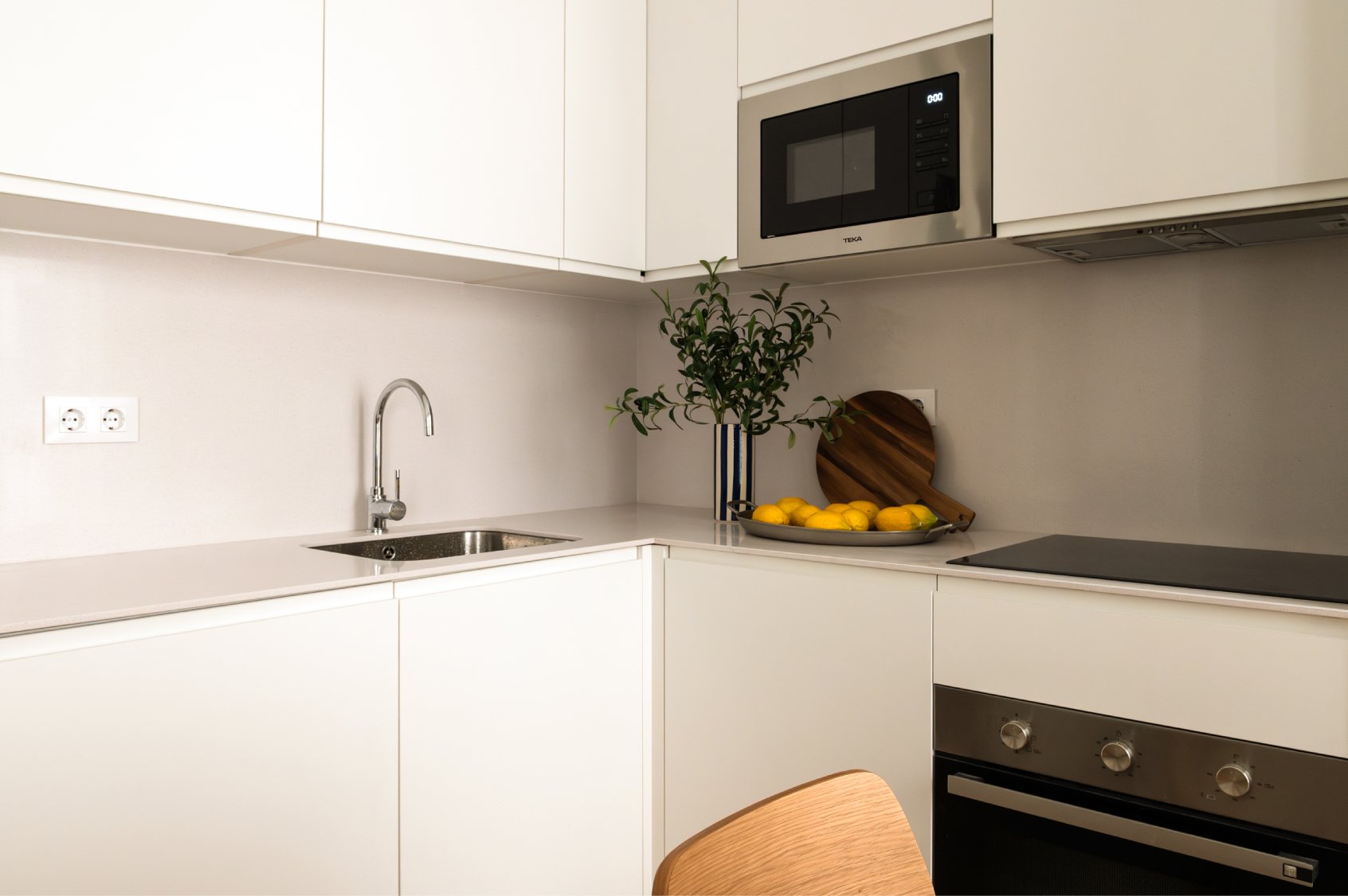 La zona social se ubica al fondo de la vivienda, donde conviven el salón, con una cómoda zona de estar, el comedor, con capacidad para cuatro comensales, y la cocina, de planta abierta. La cocina ha sido completamente equipada con mobiliario a medida, grande y pequeño electrodoméstico y variado menaje.