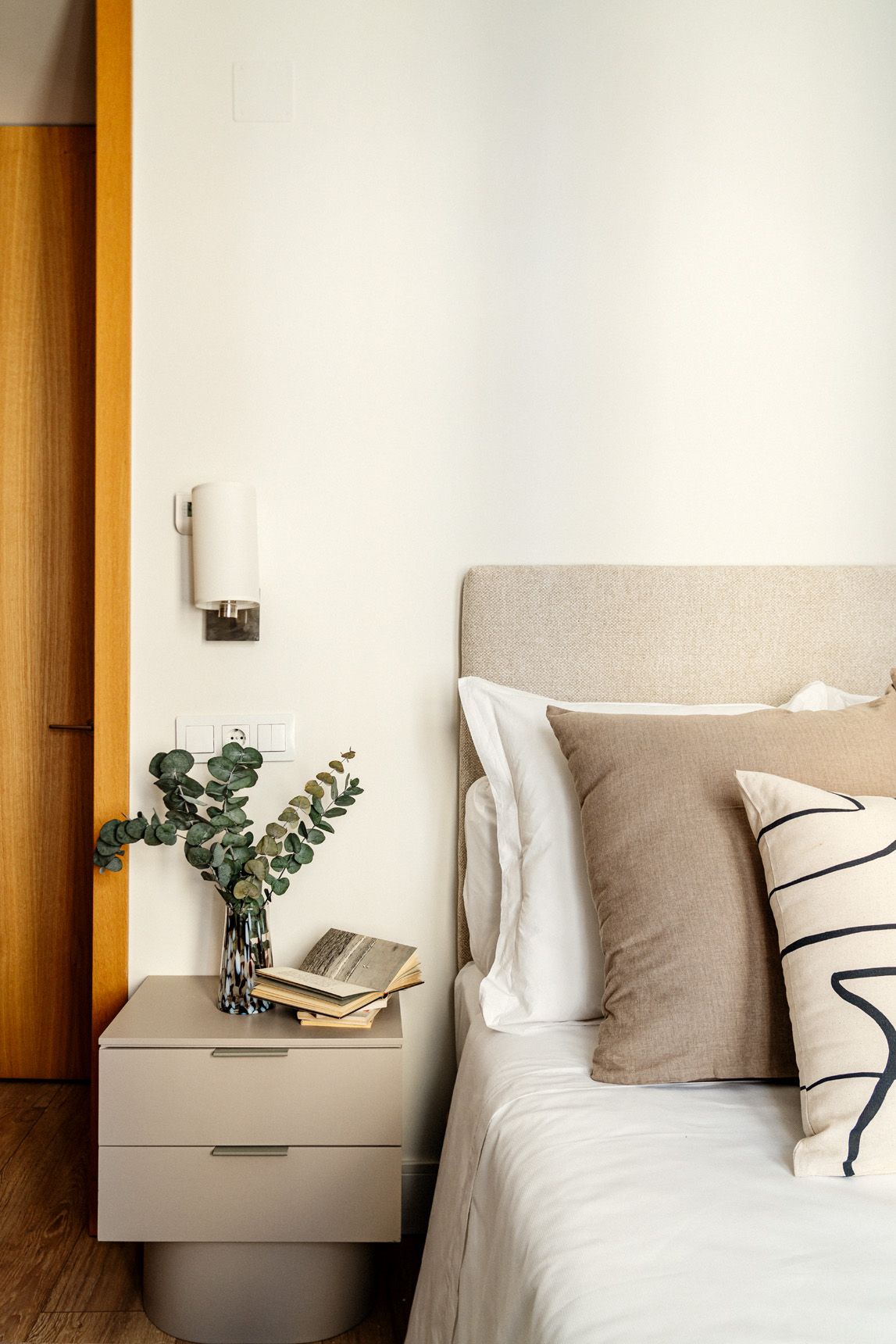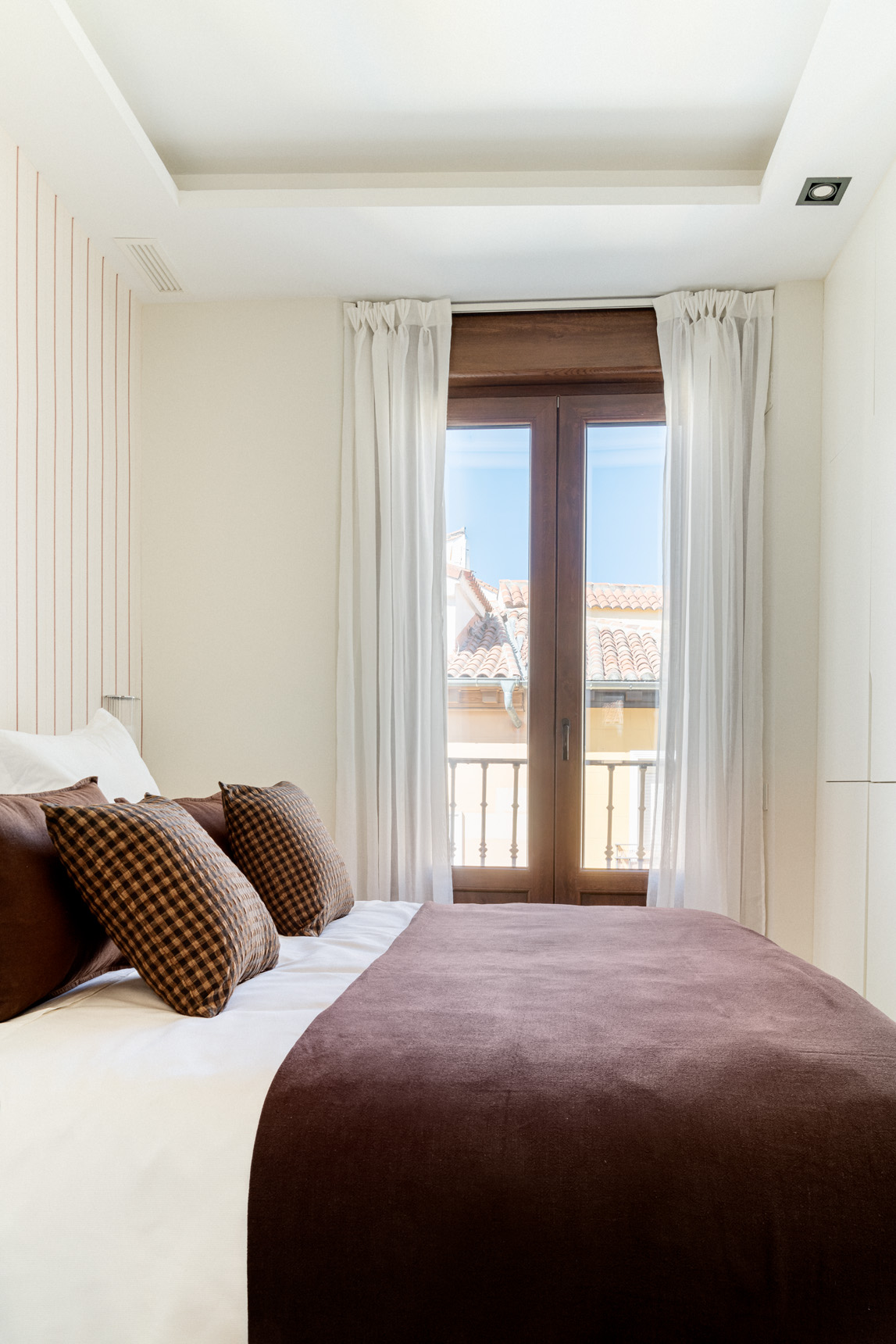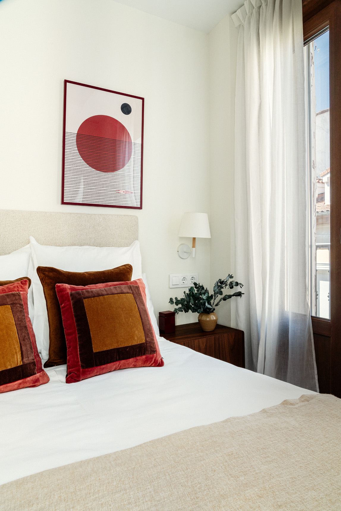 Un corto pasillo que parte del salón nos conduce a los dormitorios de la casa. El primero de ellos, muy luminoso gracias al fantástico balcón, dispone de gran cama matrimonial, armarios empotrados. Y justo en frente se encuentra un baño completo que pertenece a la primera habitación y a la segunda habitación, que también podría servir para los invitados.