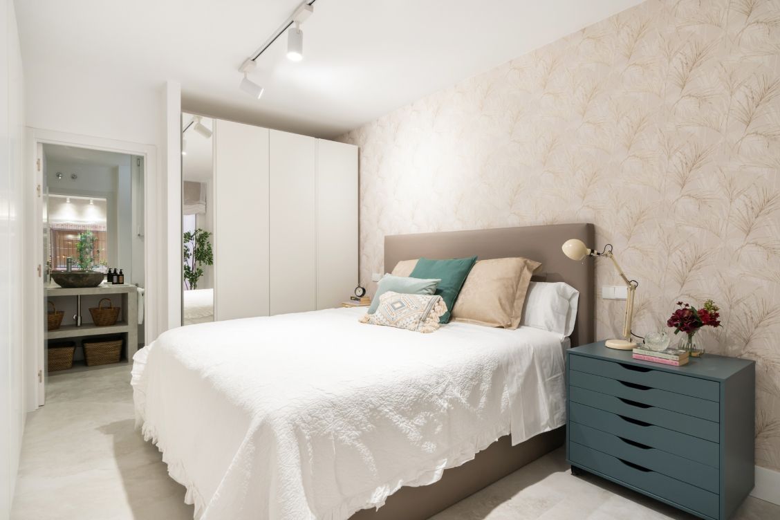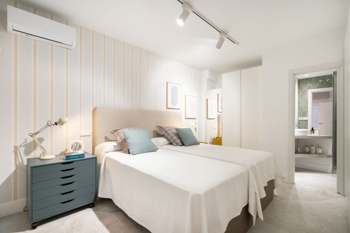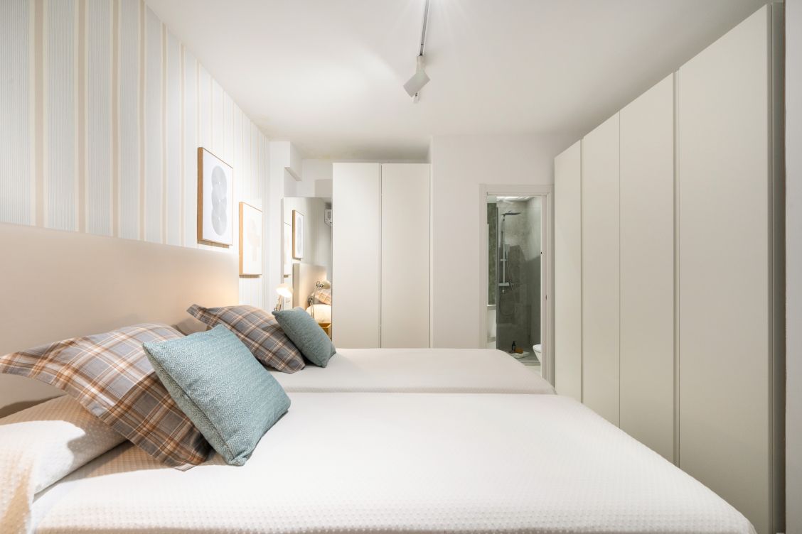 El apartamento cuenta con dos suites, cada una con su propio cuarto de baño privado. El cliente podrá elegir cama de matrimonio o dos camas en cada habitación. Además, ambas suites disponen de enormes armarios y una gran capacidad de almacenaje.