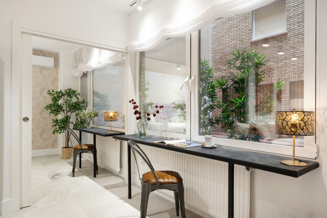 El comedor y el encantador salón crean un ambiente muy acogedor, perfecto para relajarse o recibir invitados. Las amplias zonas de trabajo frente a los enormes ventanales son ideales para quienes necesitan un espacio tranquilo y luminoso para concentrarse.