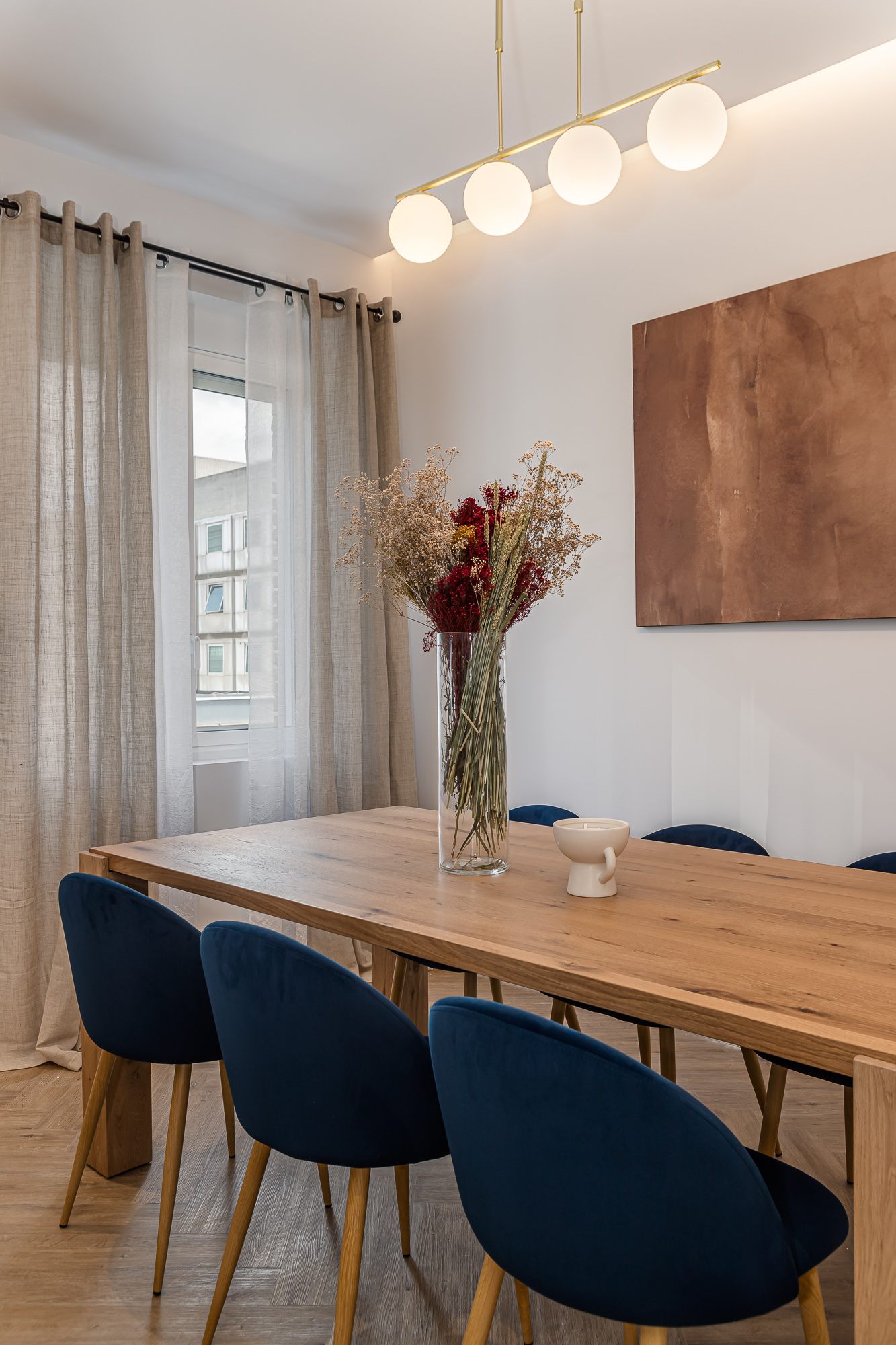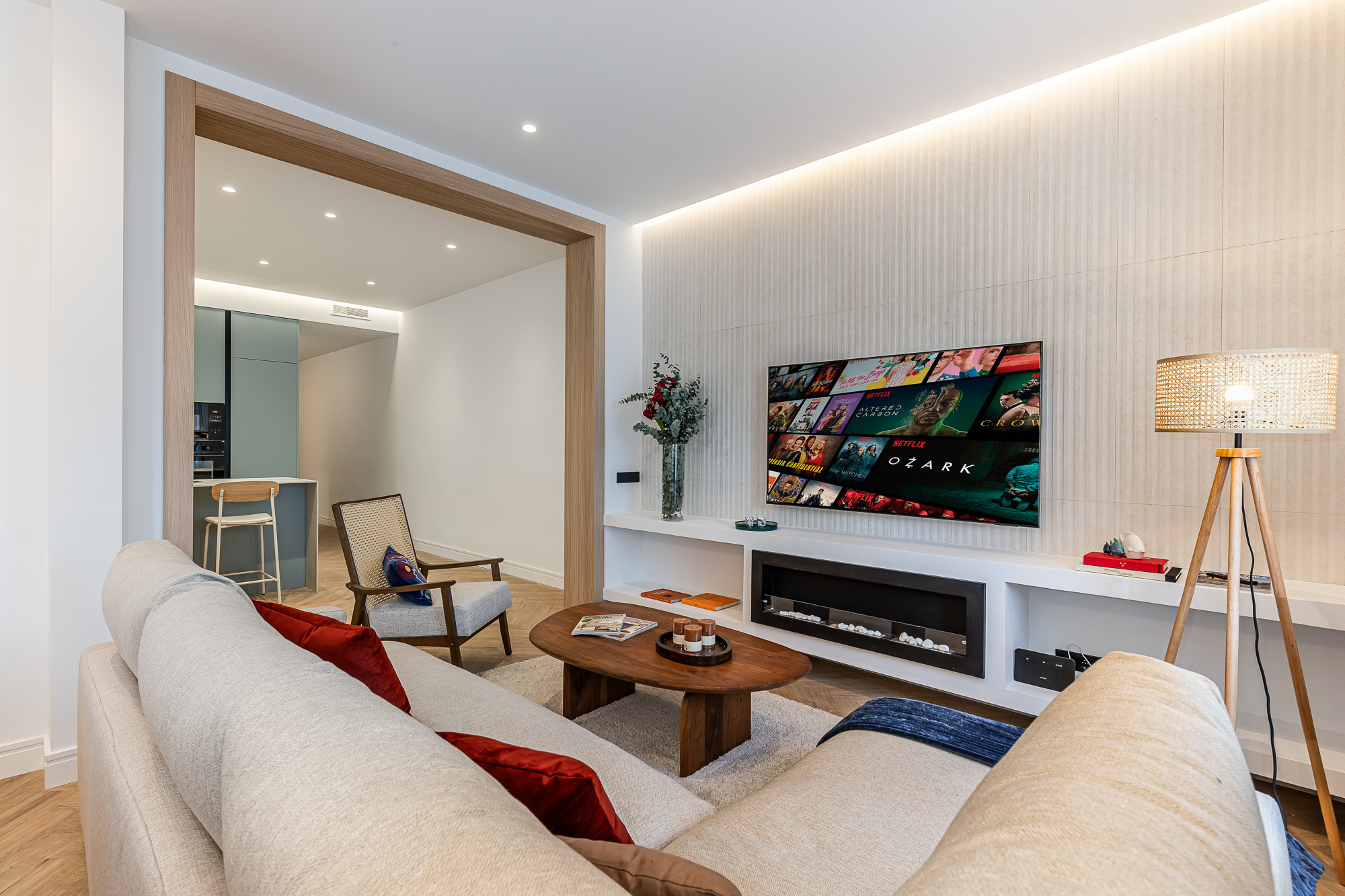 El elegante salón se distribuye en dos ambientes, la cómoda zona de estar, perfecta para relajarse o recibir visitas, y el comedor, con capacidad para 6 comensales.