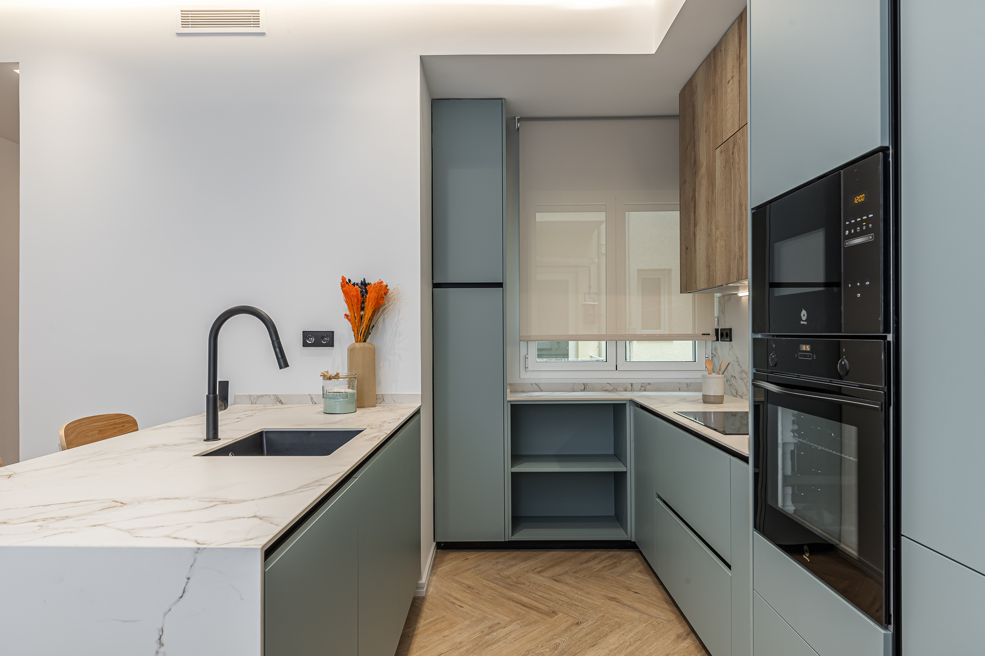 Avanzando por el pasillo llegamos a la elegante y amplia zona social, donde conviven cómodamente en un espacio abierto, pero bien diferenciado, la cocina, el salón y el comedor.