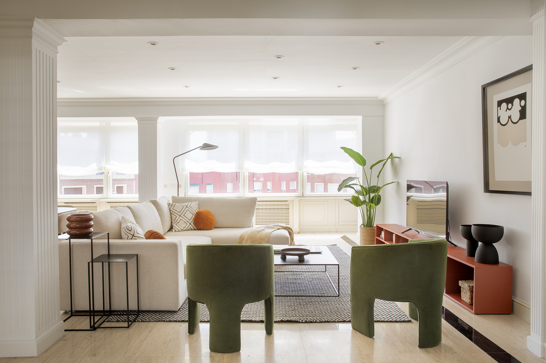 Accedemos a la vivienda a través de un hall recibidor que nos conduce a la amplia y luminosa zona social, compuesta por dos ambientes que conviven en áreas bien diferenciadas.