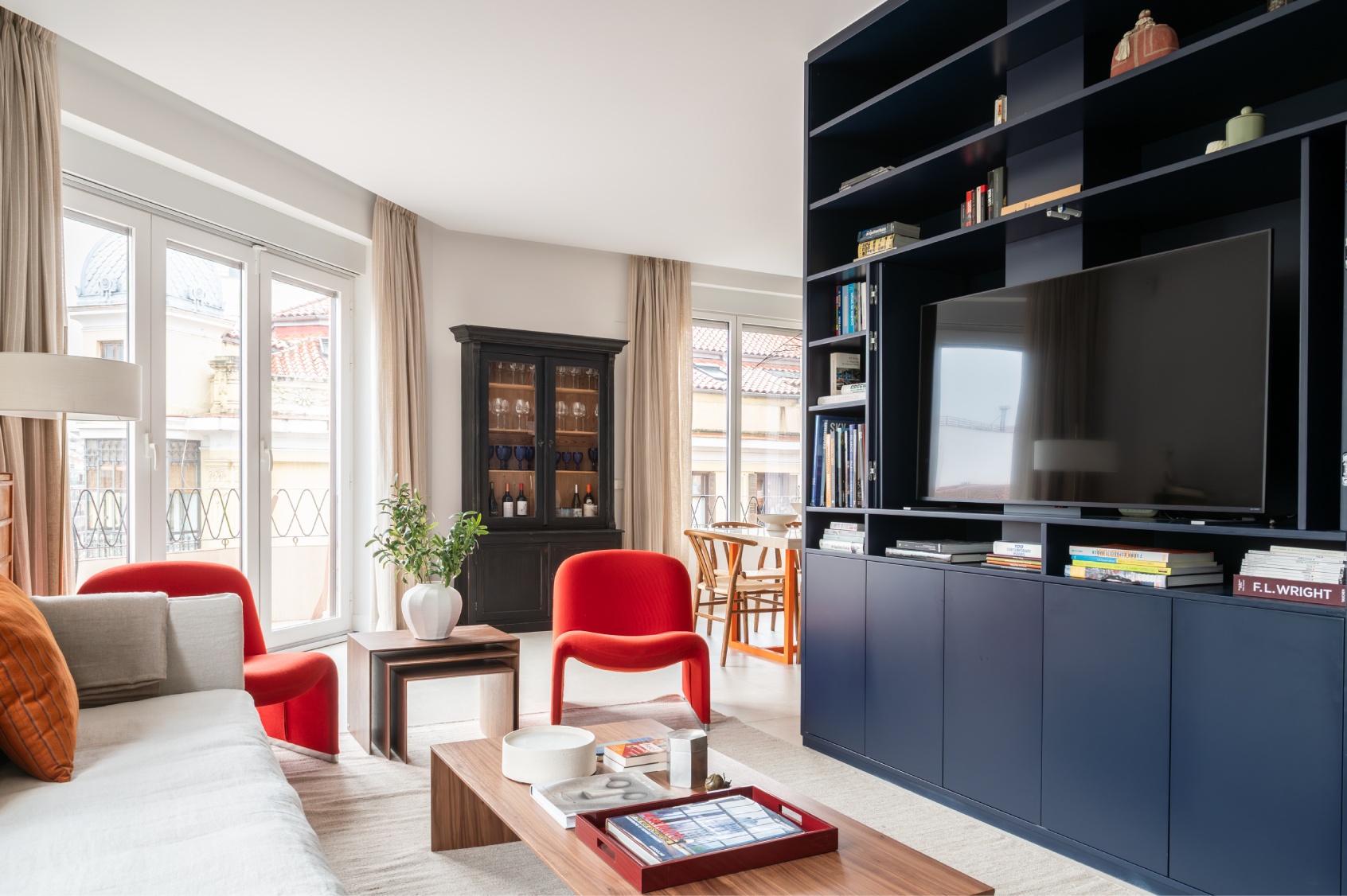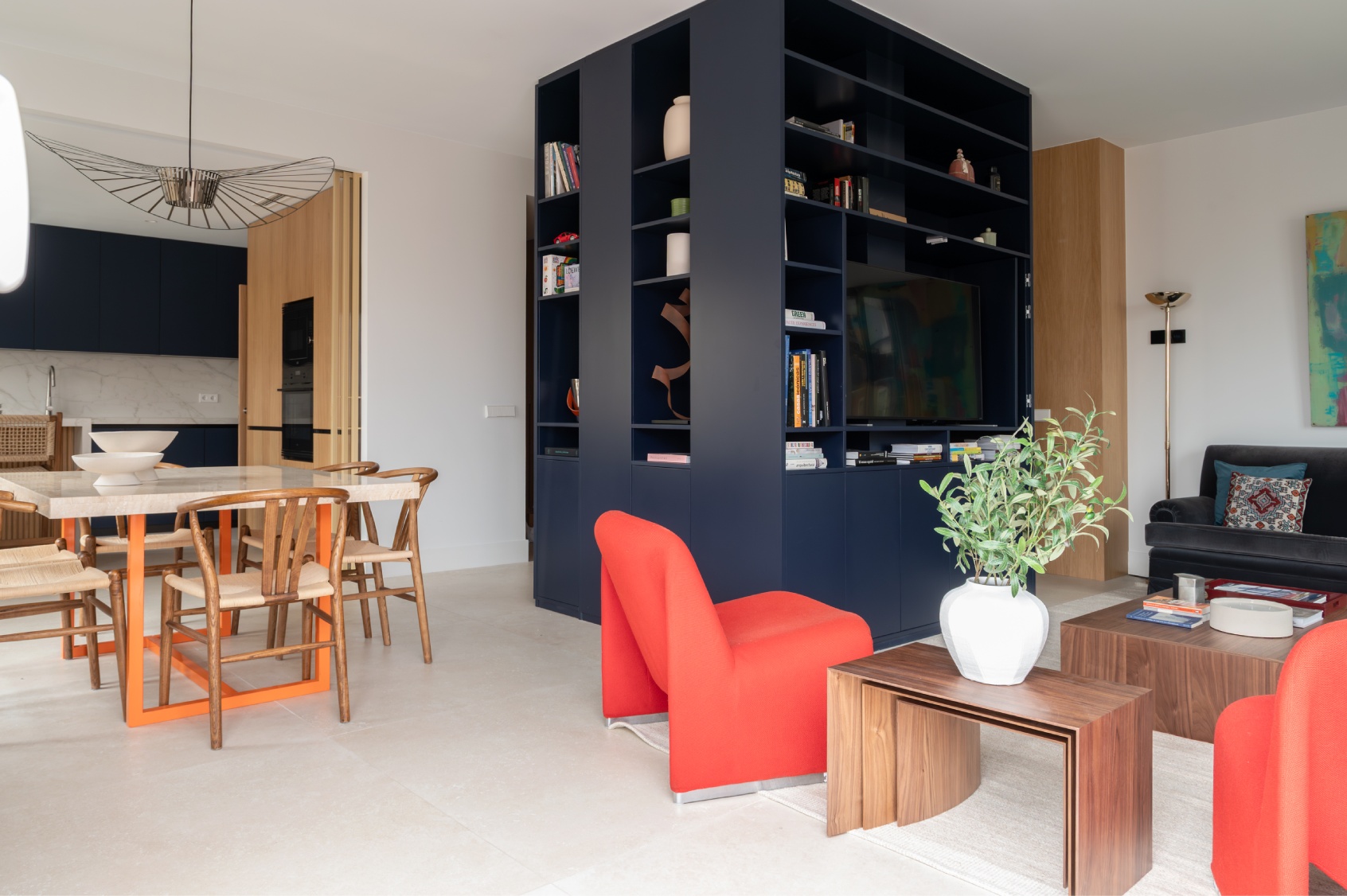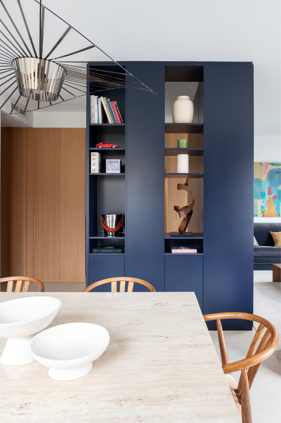 Al acceder a la vivienda, nos recibe una impresionante y luminosa zona social de concepto abierto. Su ubicación en una quinta planta y sus grandes ventanales garantizan una abundante entrada de luz natural durante todo el día. El amplio salón destaca por una cuidada decoración donde el gran protagonista es un elegante mueble a medida en un sofisticado azul profundo, que funciona como biblioteca y eje vertebrador del espacio.