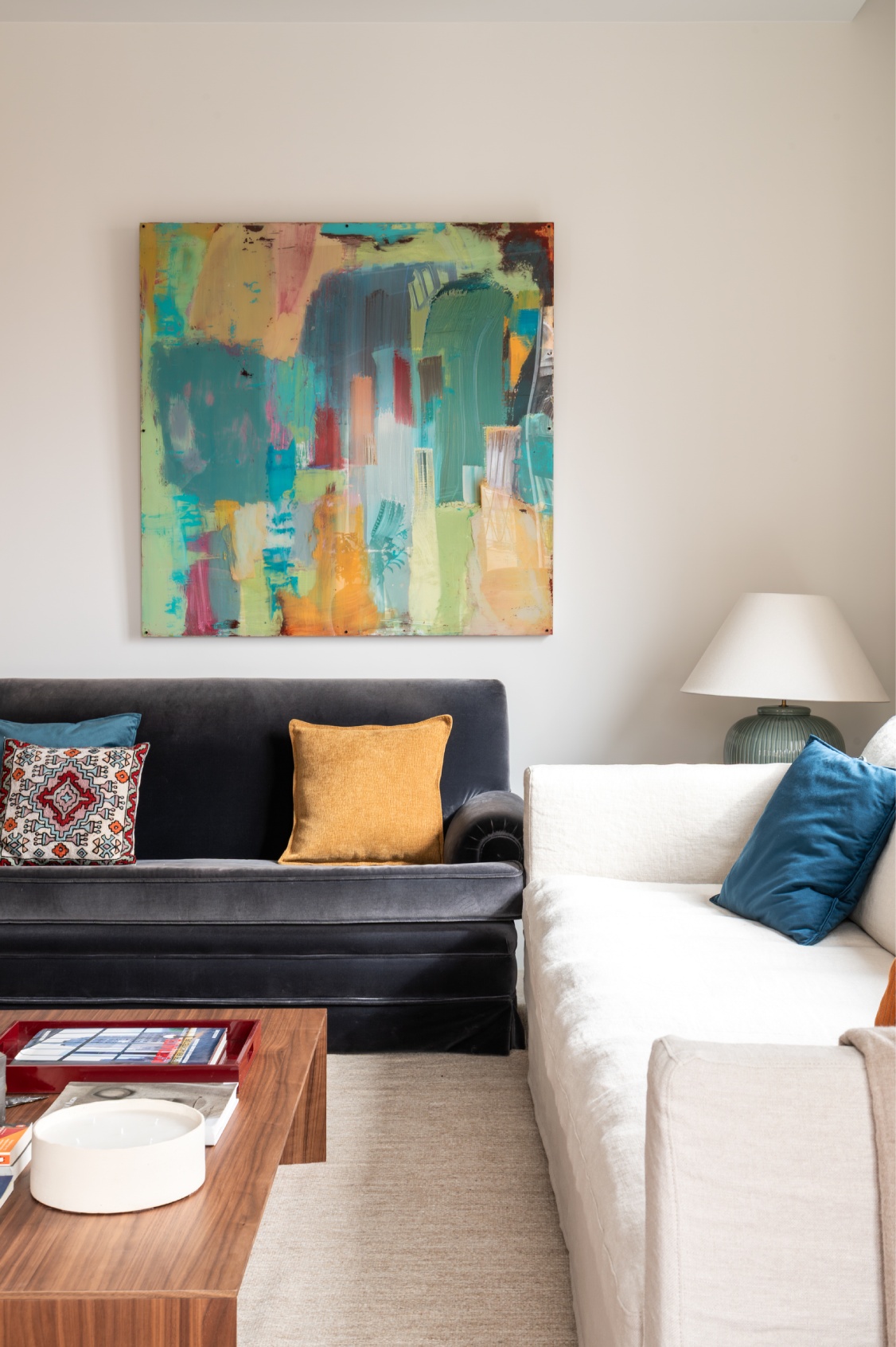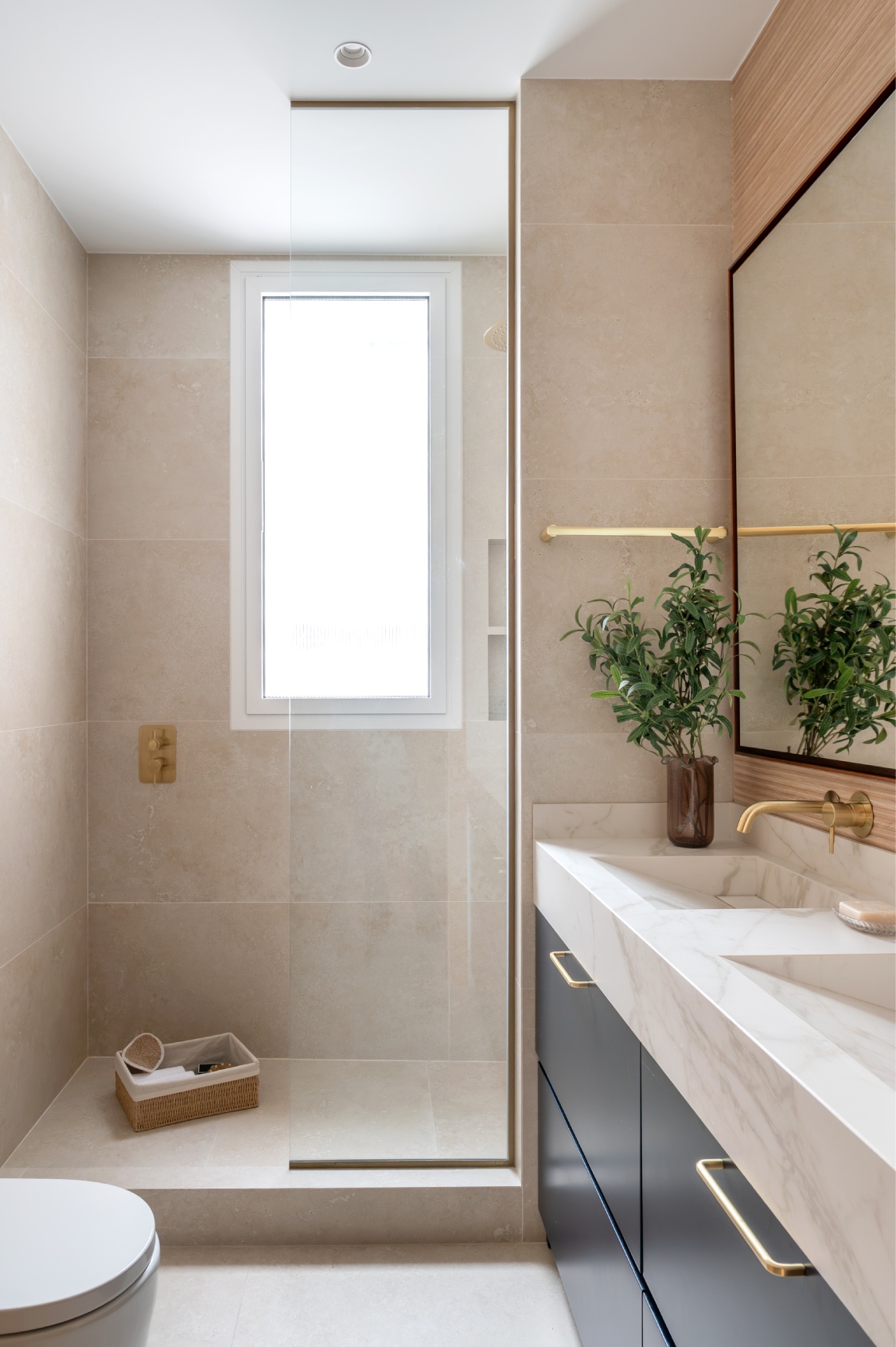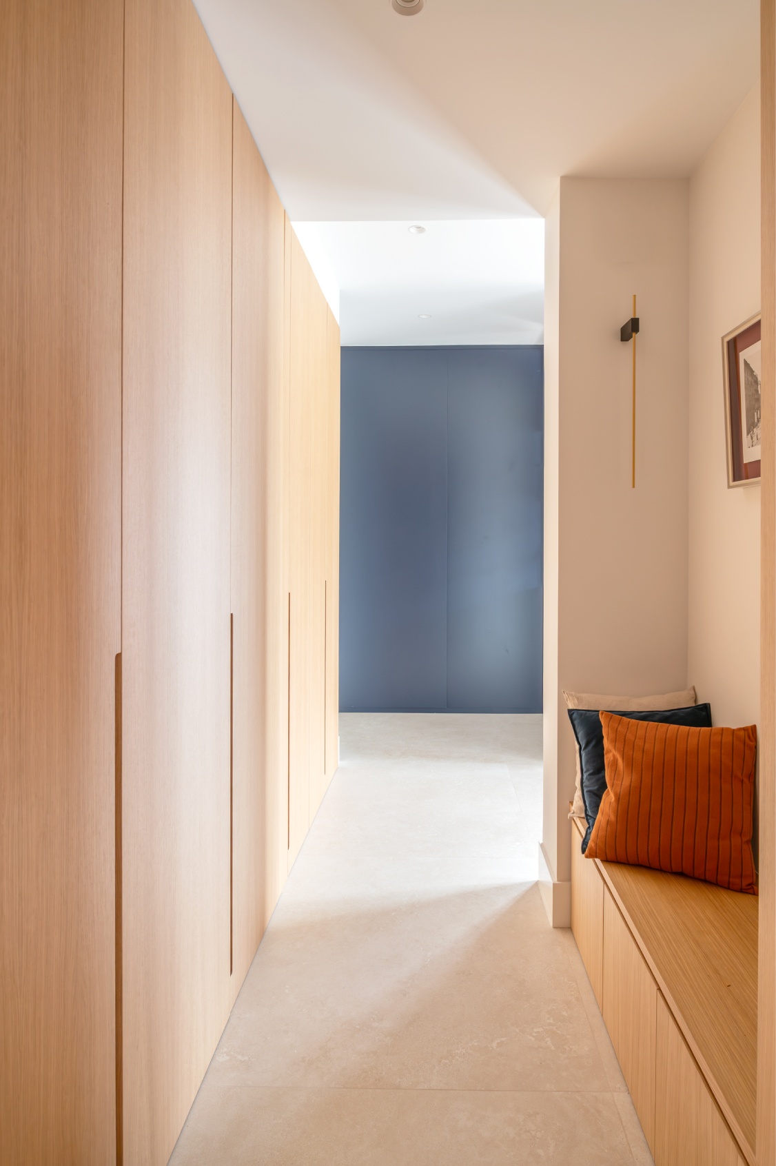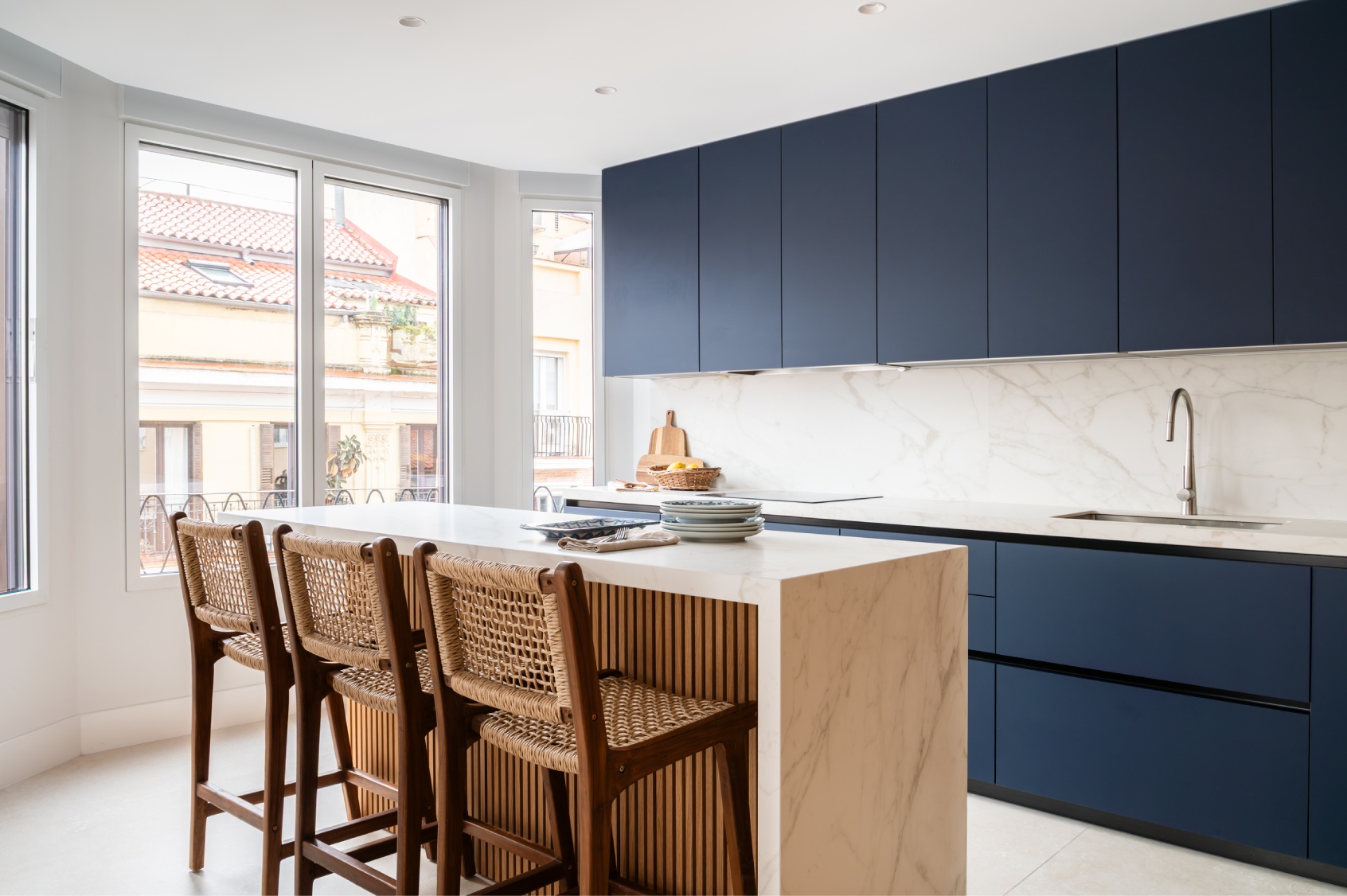Al acceder a la vivienda, nos recibe una impresionante y luminosa zona social de concepto abierto. Su ubicación en una quinta planta y sus grandes ventanales garantizan una abundante entrada de luz natural durante todo el día. El amplio salón destaca por una cuidada decoración donde el gran protagonista es un elegante mueble a medida en un sofisticado azul profundo, que funciona como biblioteca y eje vertebrador del espacio.