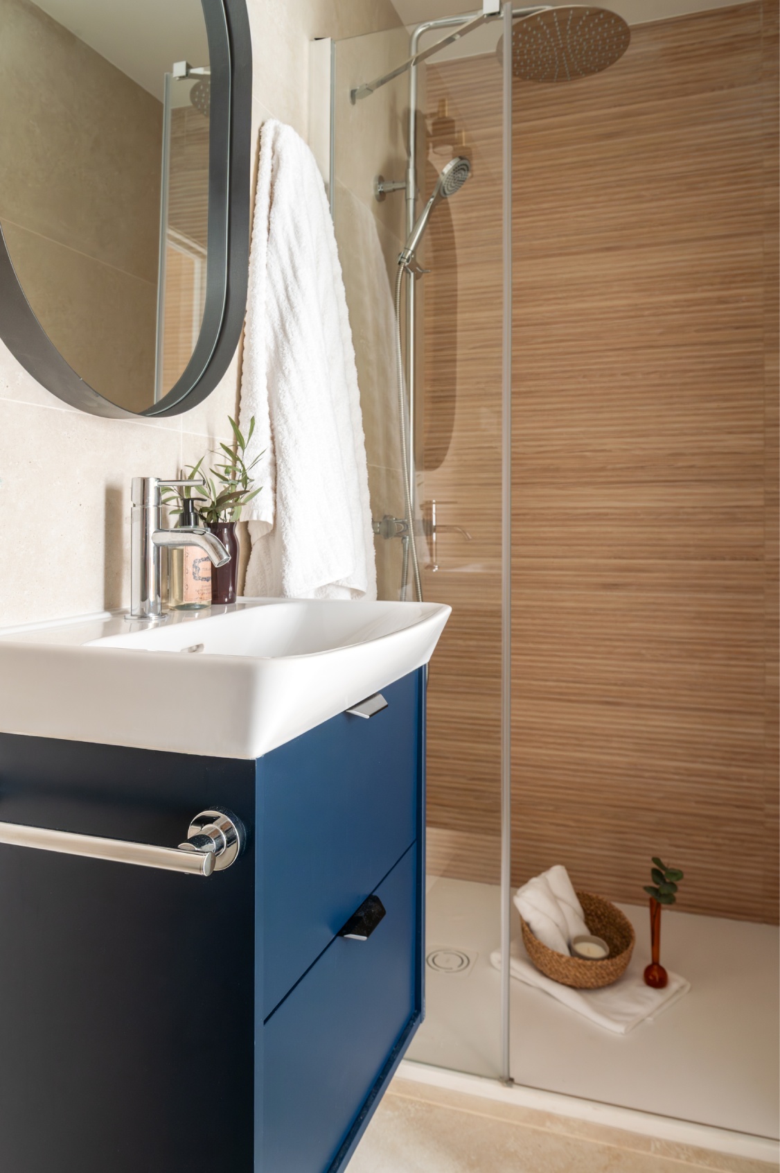 Este ambiente fluye de manera natural hacia un espacioso comedor, con capacidad para 6 comensales, ideal para acoger reuniones familiares o cenas con amigos. Anexa a este espacio se sitúa la moderna cocina, delimitada por unas elegantes puertas correderas de cristal. Esta práctica solución arquitectónica ofrece la versatilidad de integrar completamente la estancia en la zona social o independizarla según la ocasión, sin interrumpir la continuidad visual ni el paso de la luz. En su interior, la cocina mantiene la narrativa cromática en tonos azul noche combinados con la calidez de la madera natural. Presidida por una gran isla central perfecta para desayunos informales, está totalmente equipada con electrodomésticos de alta gama y un completo menaje.
