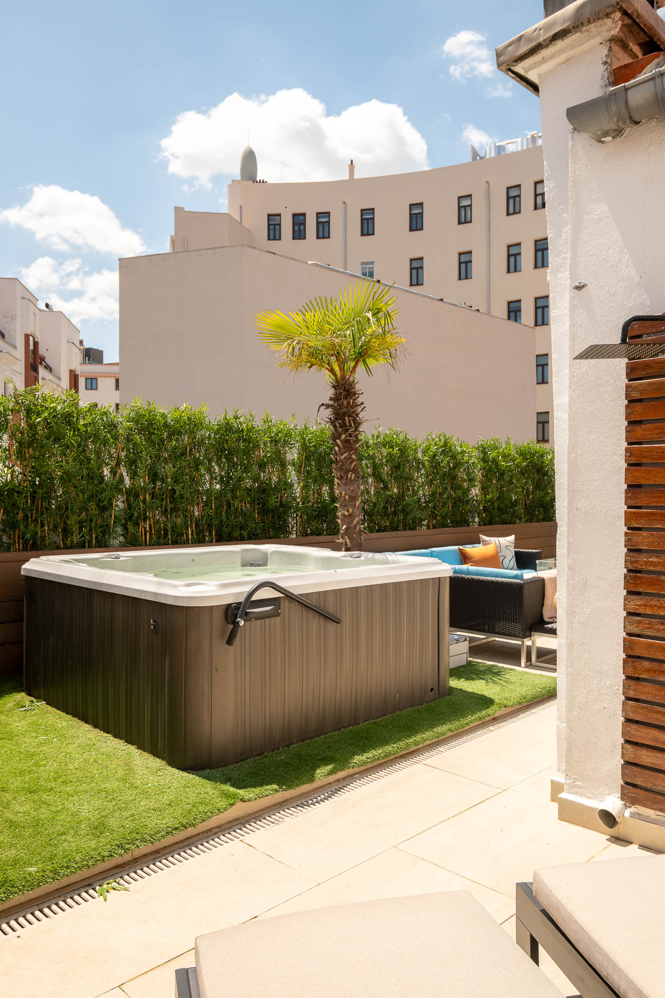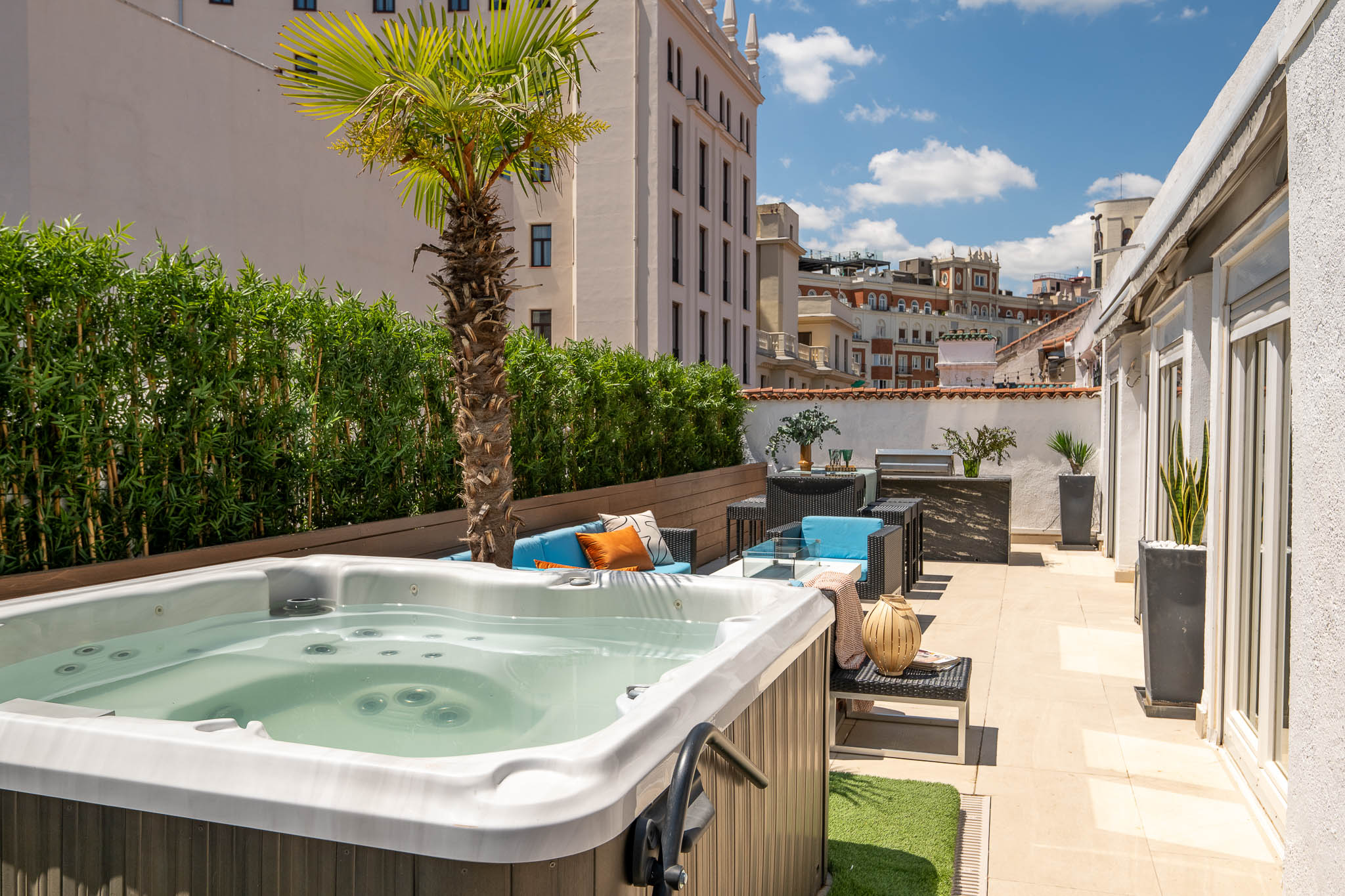 Ubicado en pleno centro de Madrid, a solo unos pasos de la emblemática Gran Vía, este espectacular ático de dos dormitorios dobles y capacidad para 4 personas destaca por su diseño, su amplitud y su impresionante terraza privada con jacuzzi, un verdadero oasis urbano.