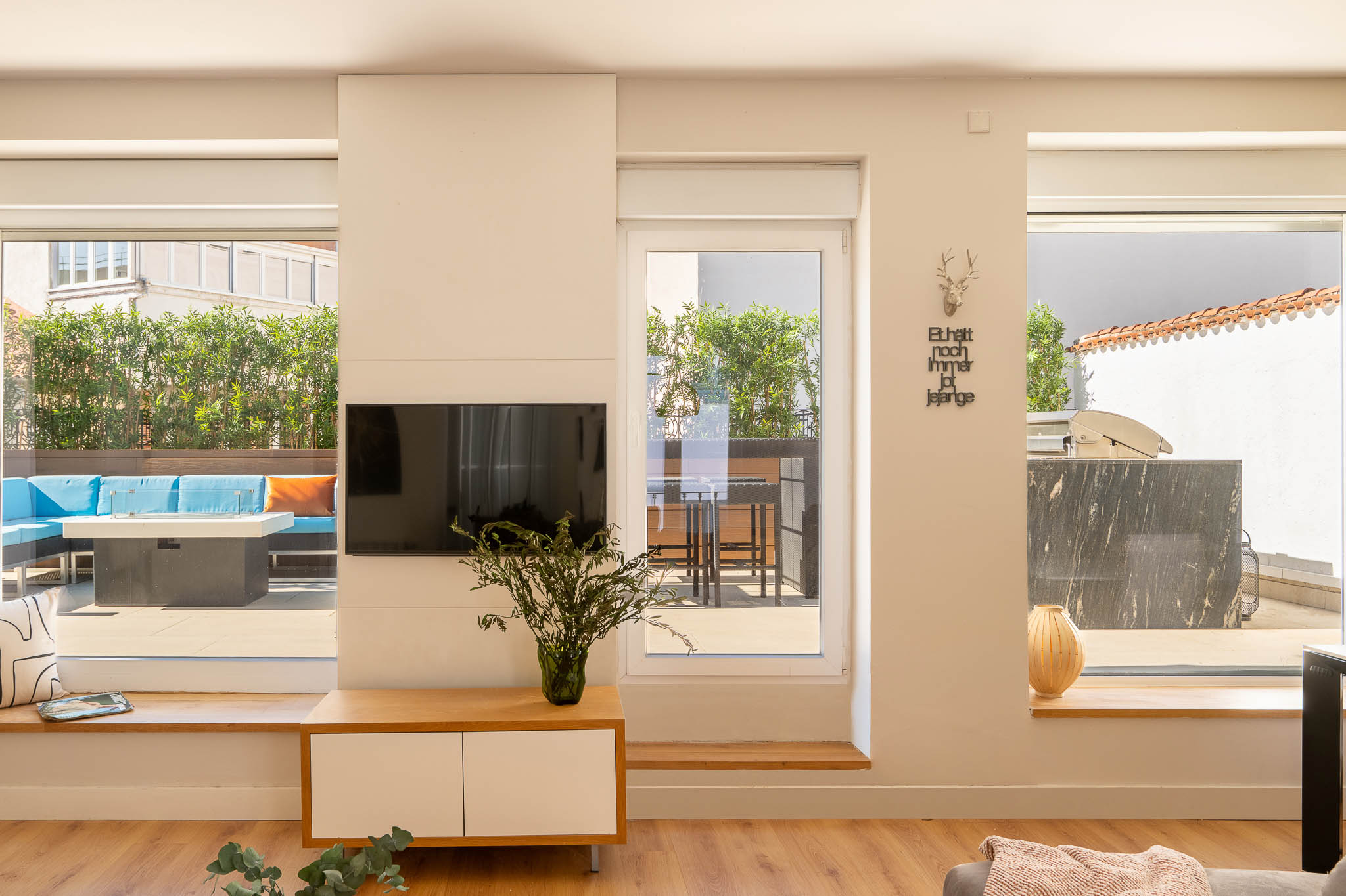 Desde aquí se accede a la auténtica joya de este ático: una impresionante terraza privada de generosas dimensiones, perfecta para disfrutar al máximo del aire libre. Diferentes ambientes la convierten en un espacio único, con una zona de estar ideal para relajarse, una barbacoa en isla y un comedor exterior para disfrutar de comidas y cenas al aire libre. Aunque el verdadero lujo de esta terraza lo aporta el jacuzzi, un privilegio incomparable en pleno corazón de Madrid.