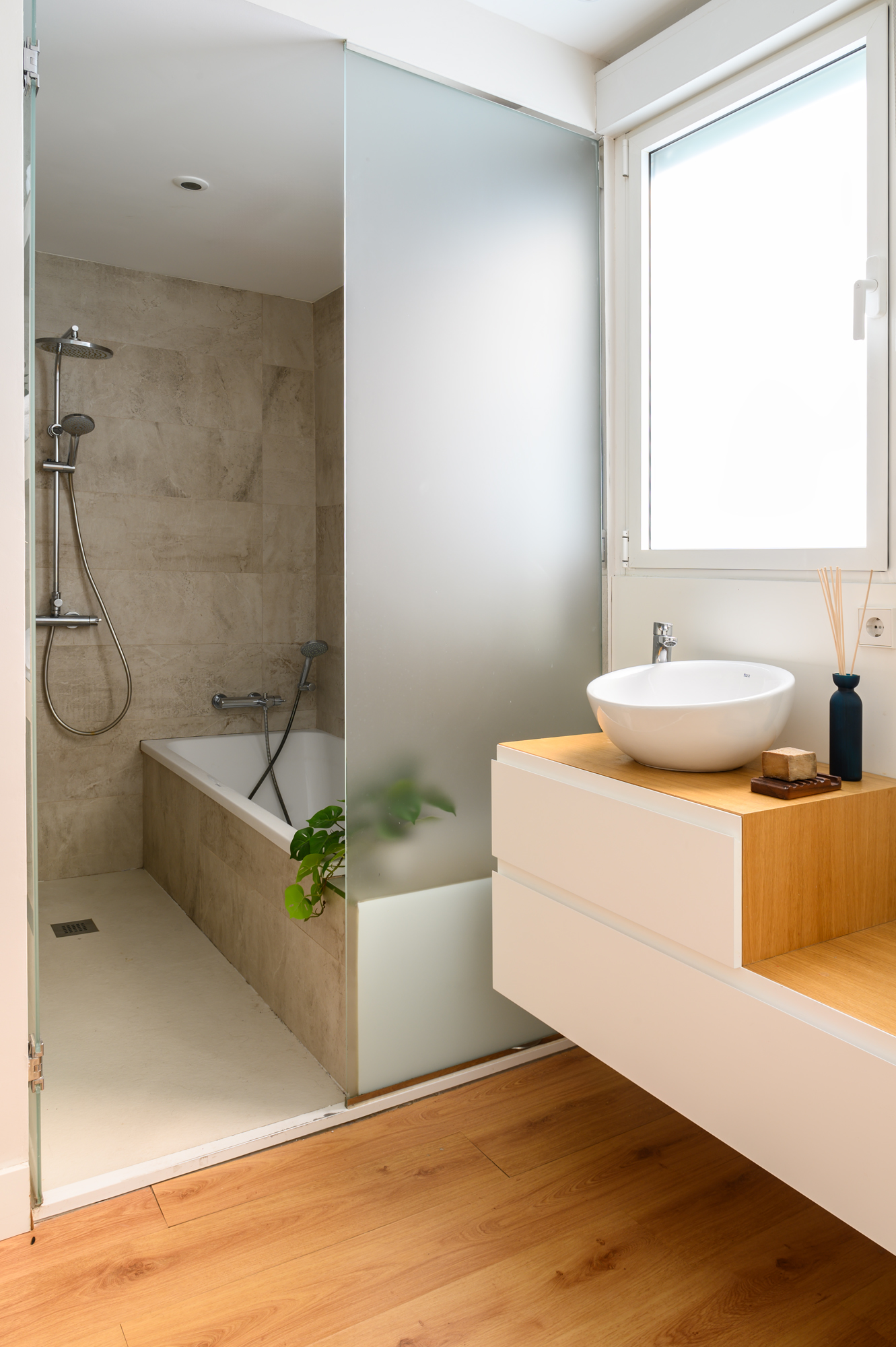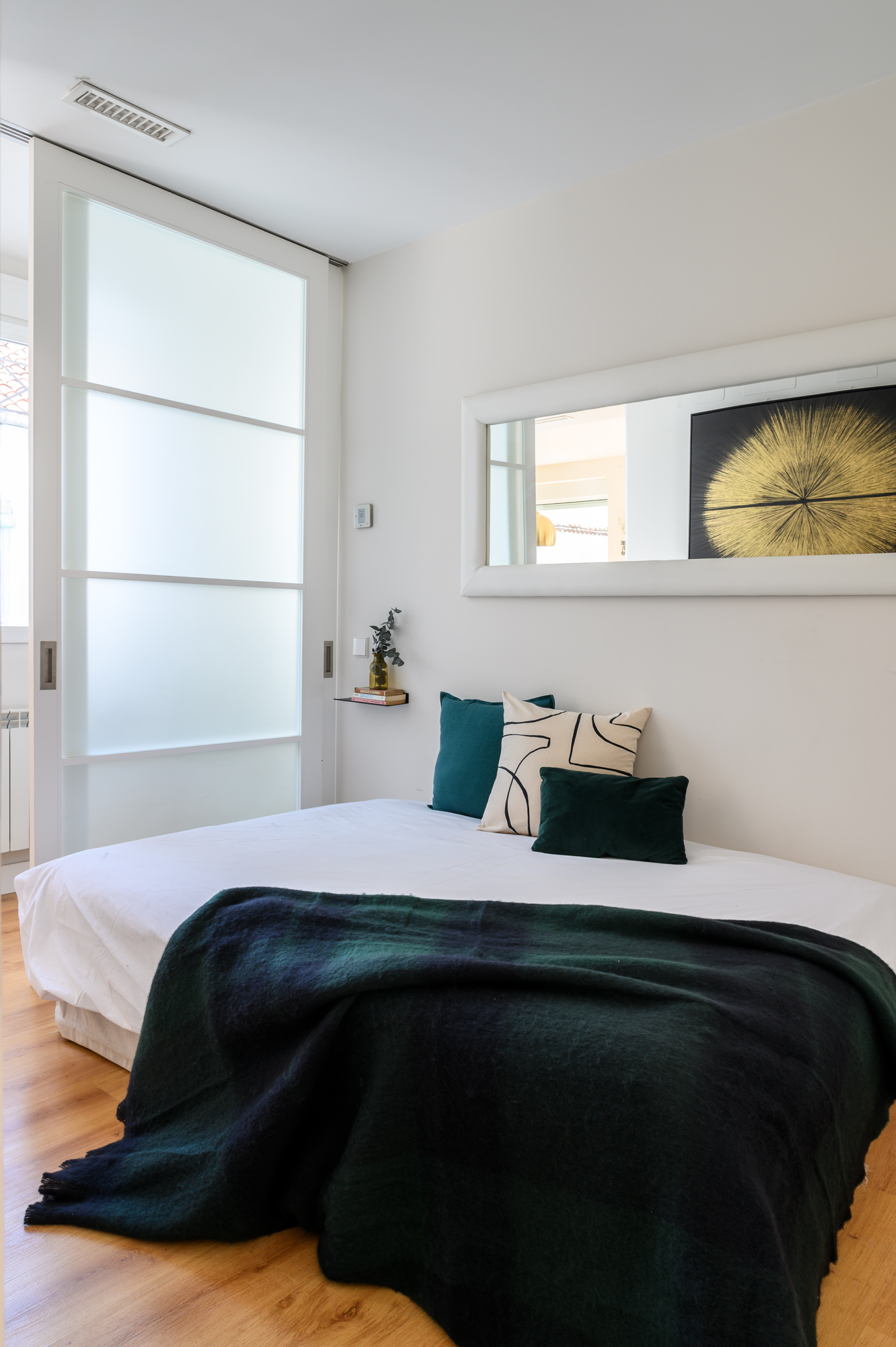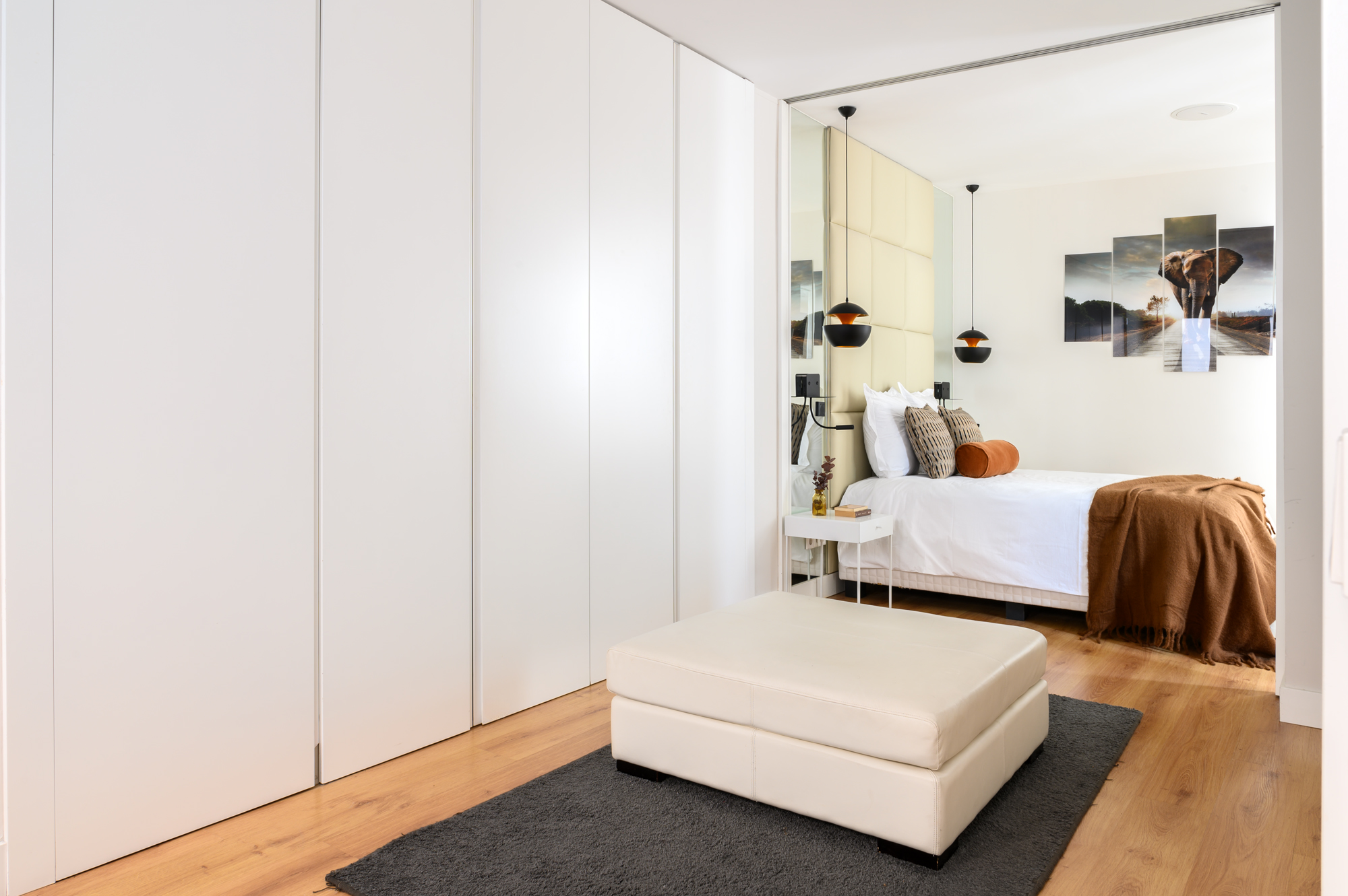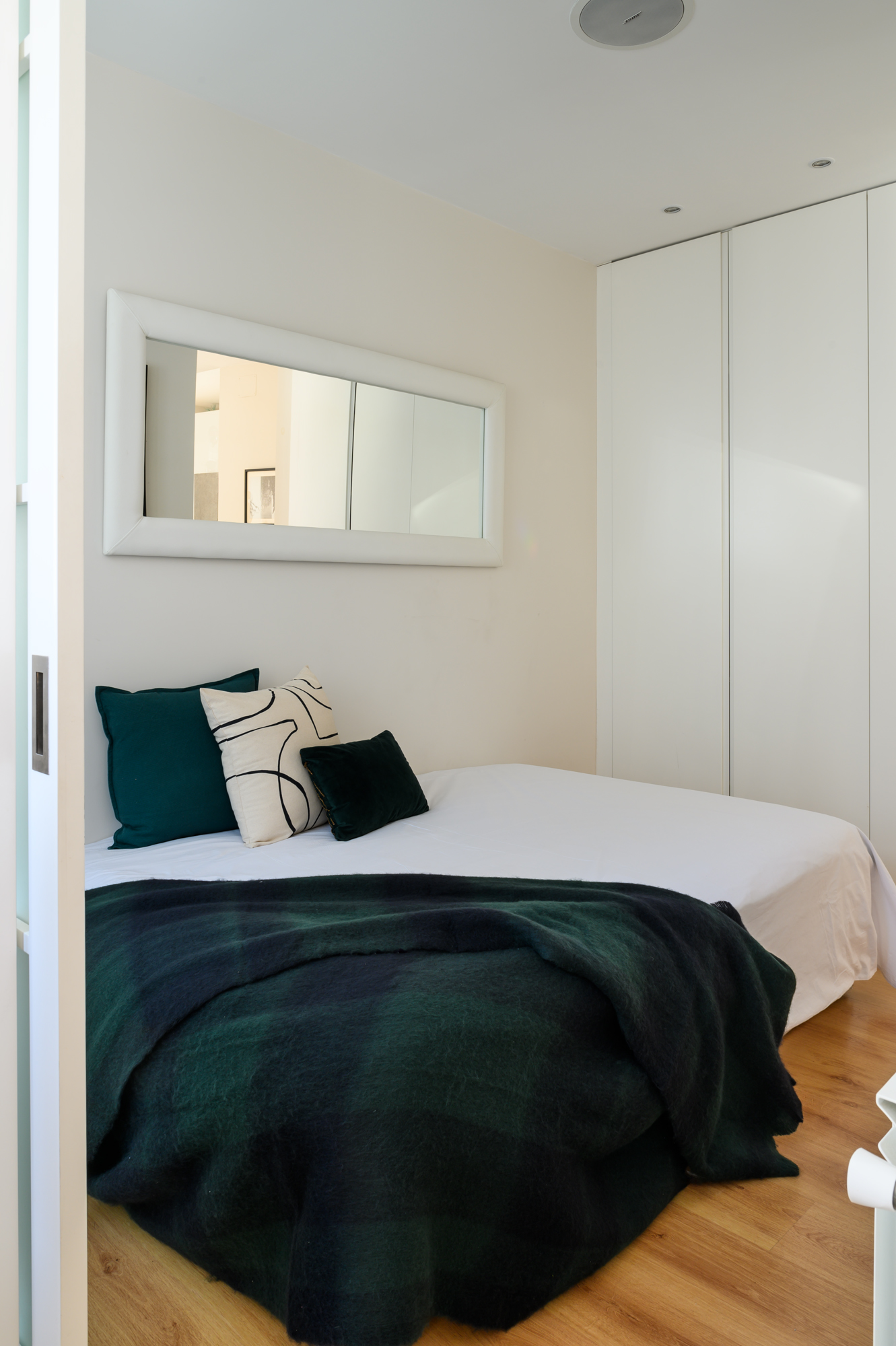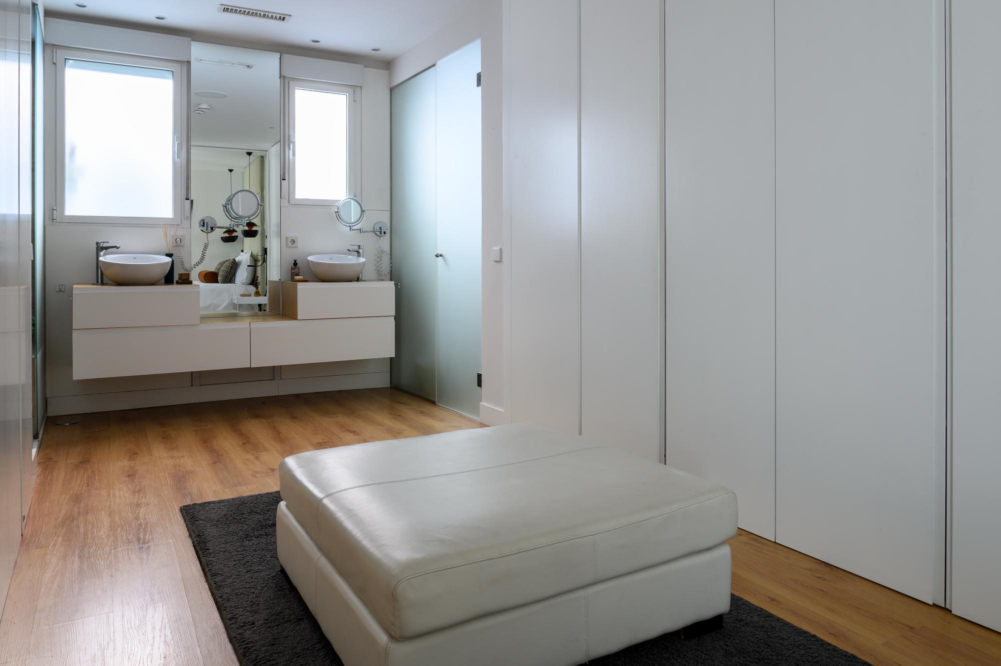 Al acceder a la vivienda, nos encontramos con la zona privada, donde descansan los dos dormitorios dobles. El dormitorio principal está equipado con una amplia cama de matrimonio, un espacioso vestidor y un cuarto baño en suite con doble lavabo, ducha y bañera. A continuación, el segundo dormitorio, también con cama de matrimonio y armarios empotrados, se sitúa junto a un baño completo que da servicio tanto a esta estancia como a las visitas.