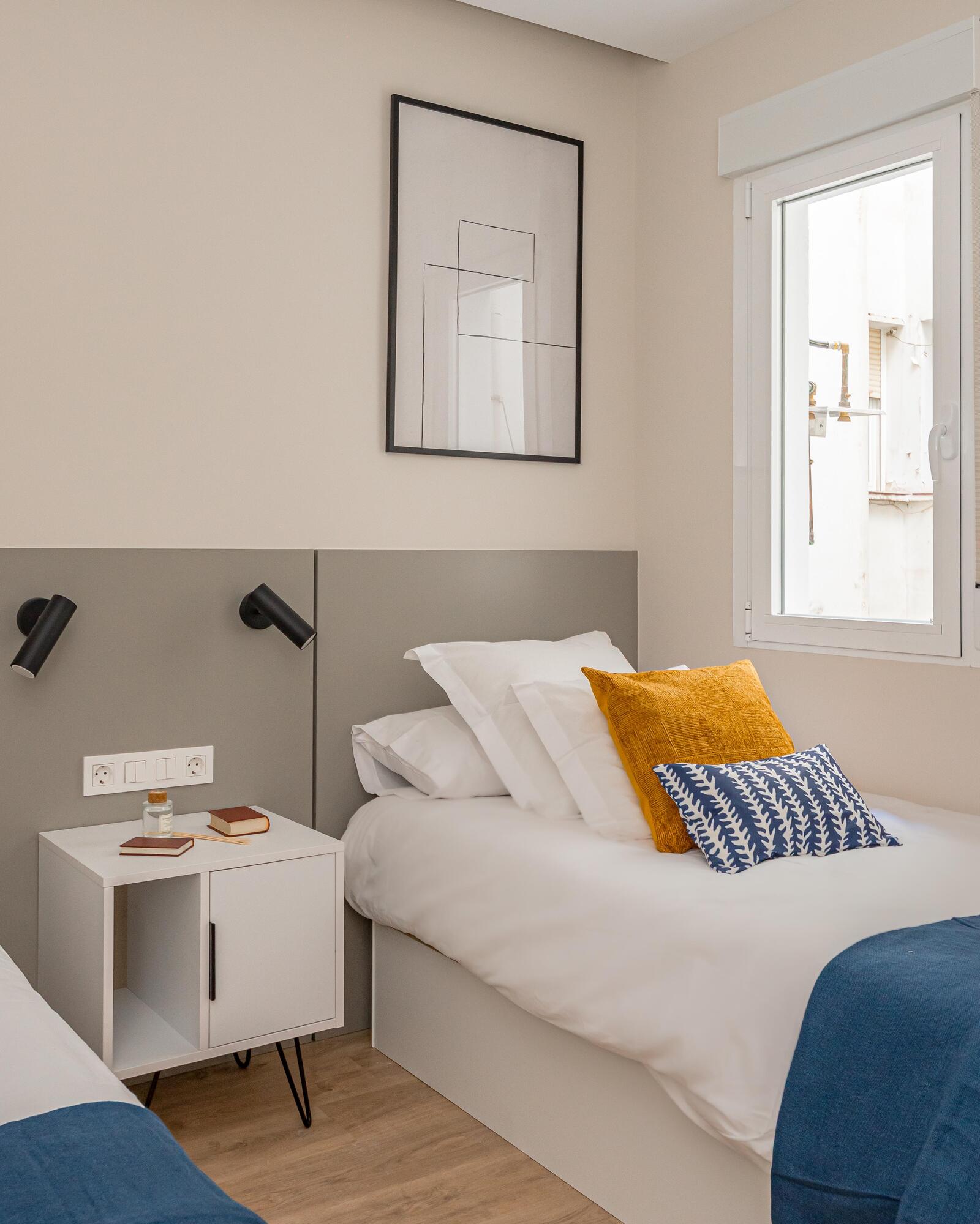 El dormitorio secundario está equipado con dos camas individuales y cuenta con zona de vestidor. Un cuarto de baño completo da servicio tanto a este dormitorio como a las visitas.