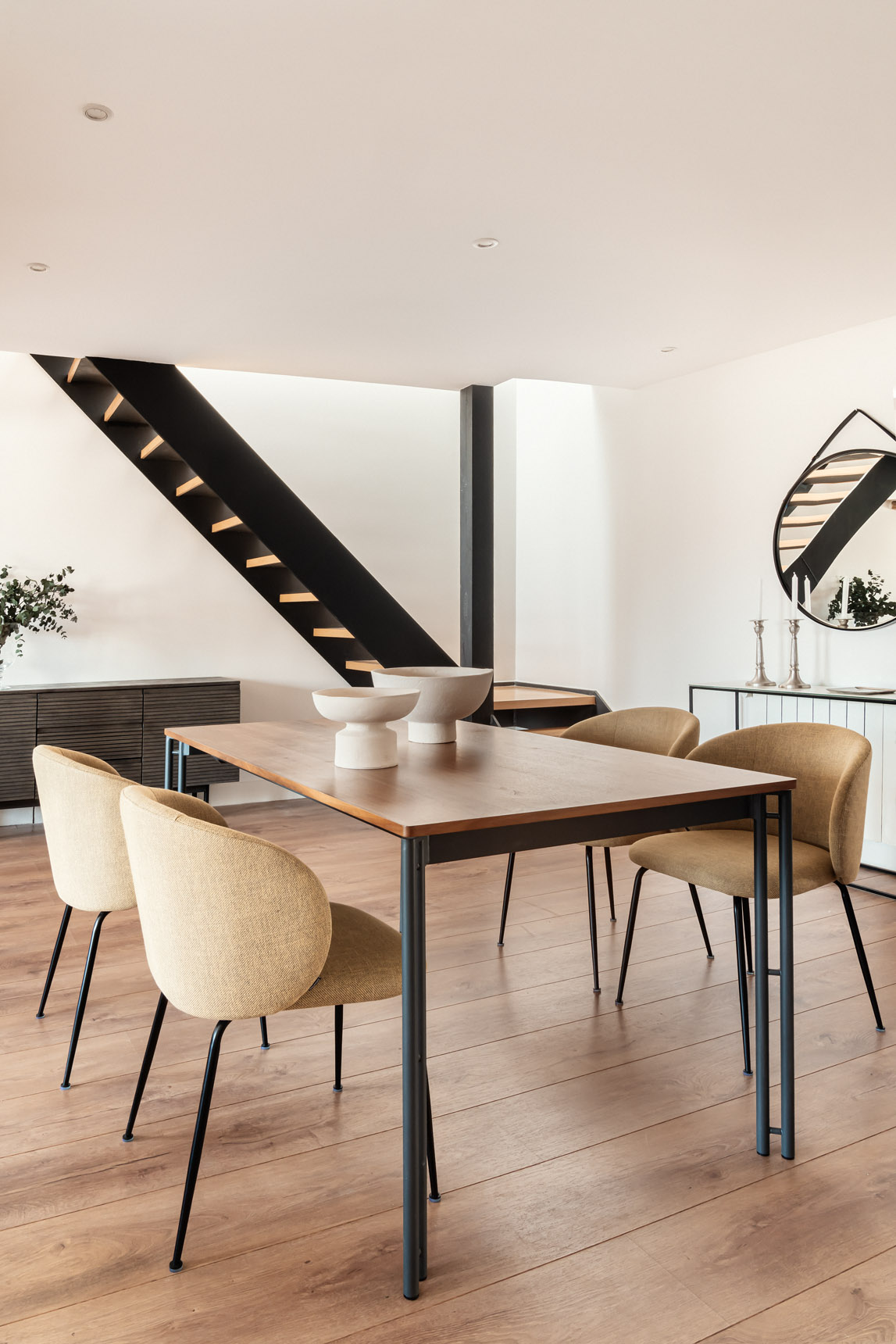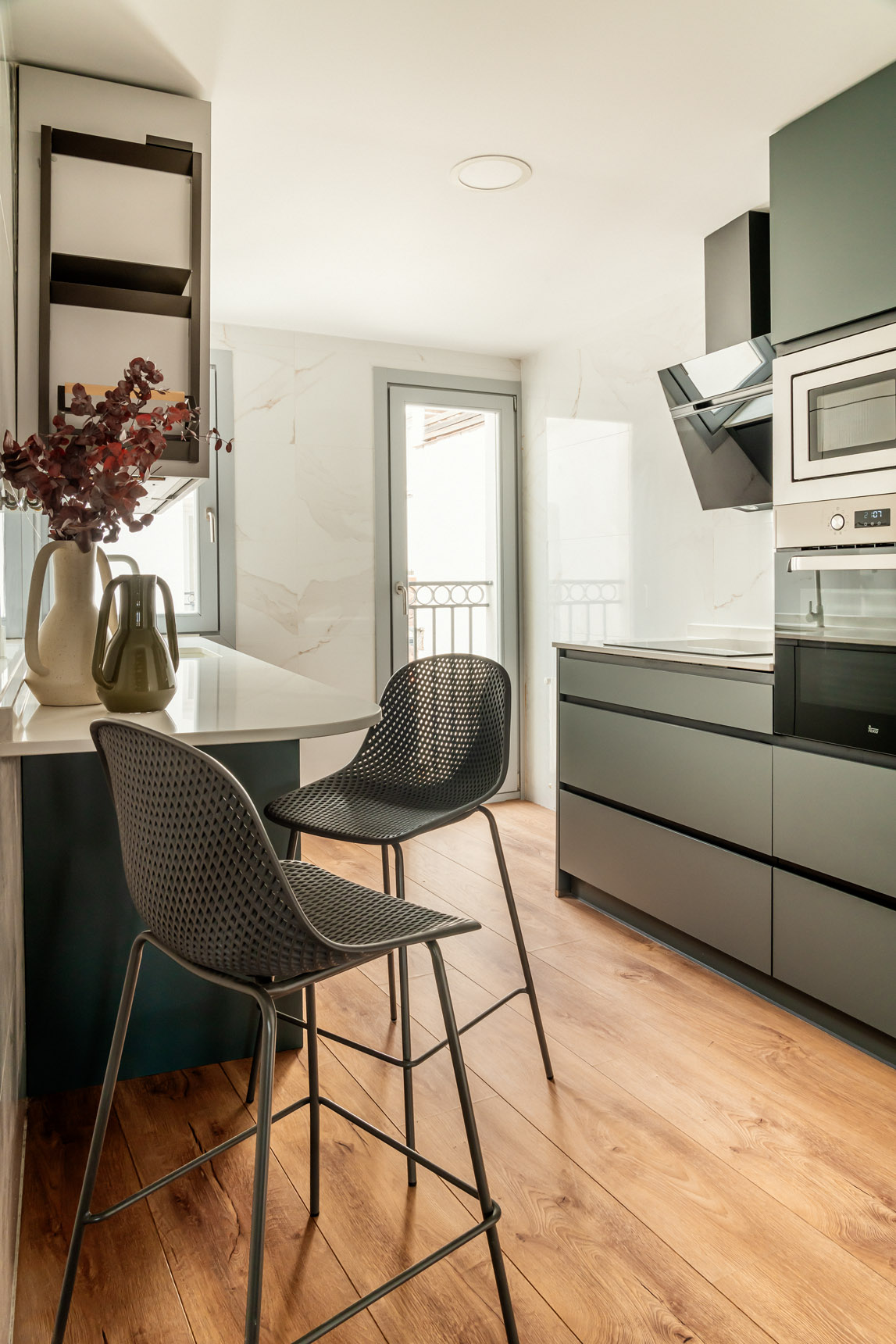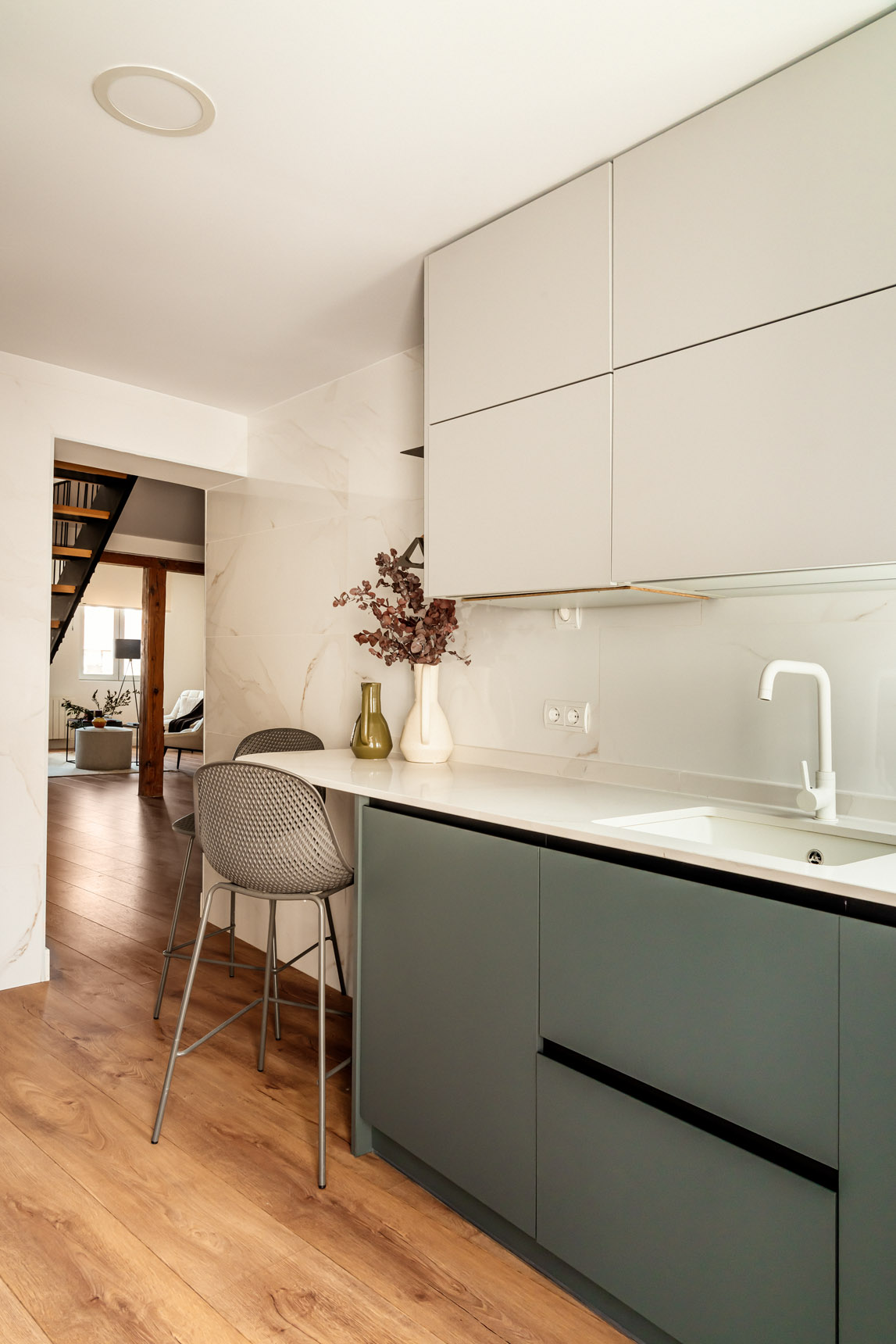 Con una superficie de 122 m2, este singular dúplex ha sido completamente reformado. Accedemos a la planta baja de la vivienda y nos recibe la amplia y luminosa zona social, compuesta por el área de comedor, que ofrece una mesa para 4 comensales, y la cómoda zona de salón. Imponentes columnas de madera delimitan los espacios y apartan gran personalidad. Junto a la zona social encontramos la cocina independiente, la cual ha sido equipada hasta el último detalle con grande y pequeño electrodoméstico, así como variado menaje.