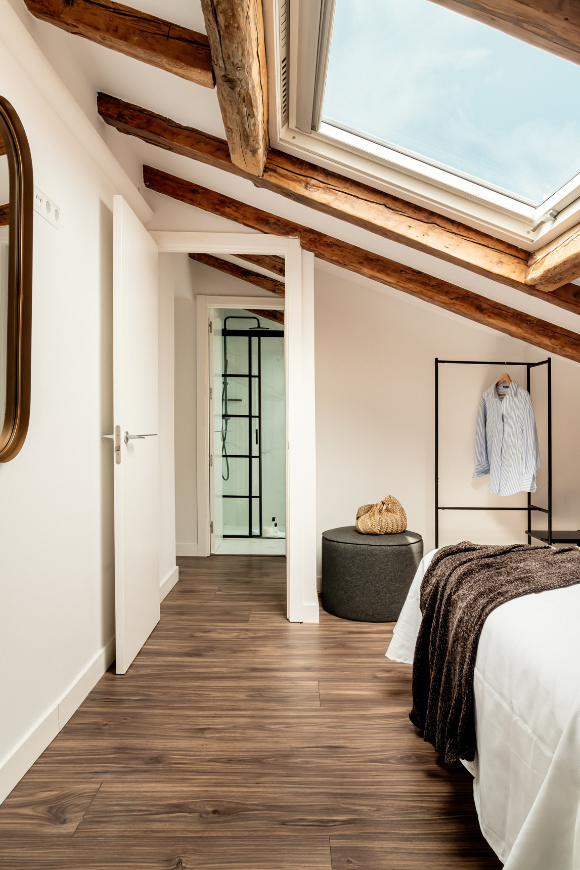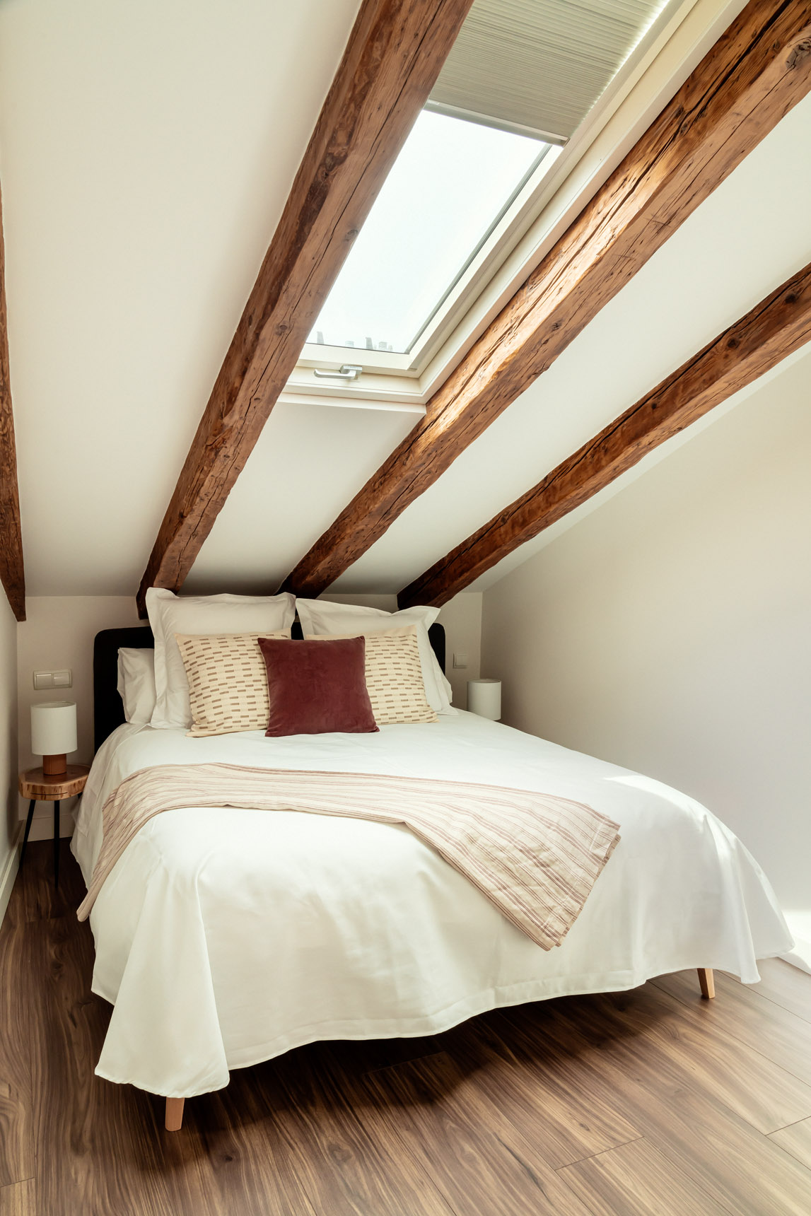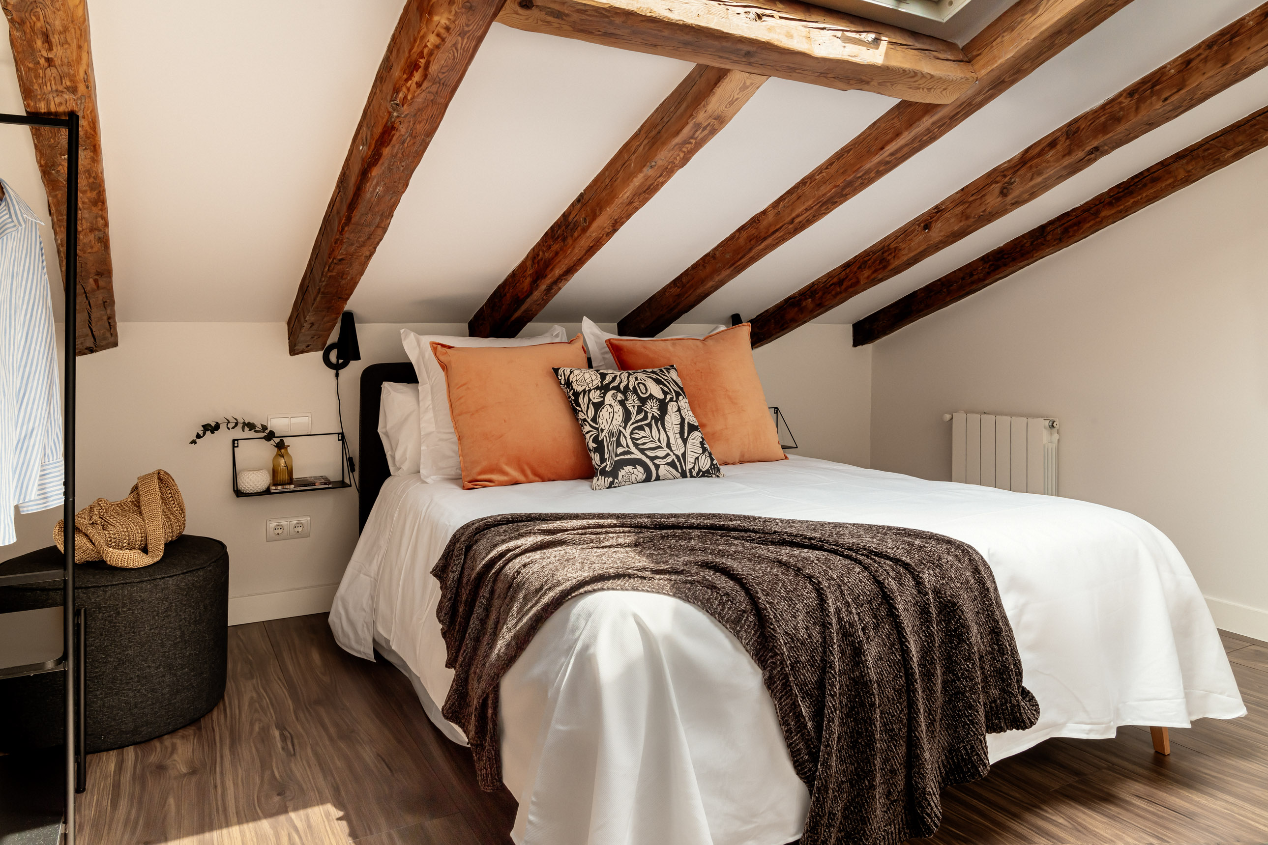 Desde el salón parten dos escaleras. Una de ellas nos conduce a la planta superior, donde se encuentran los otros dos dormitorios dobles de la vivienda, ambos equipados con cama de matrimonio. Destacan los techos abuhardillados y las vigas de madera, que los convierten en espacios realmente acogedores. Un cuarto de baño completo, situado en esta planta, da servicio a ambos dormitorios.