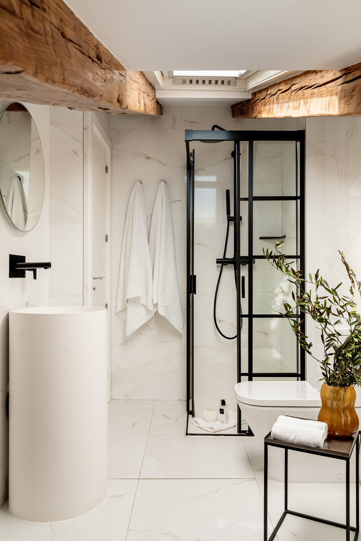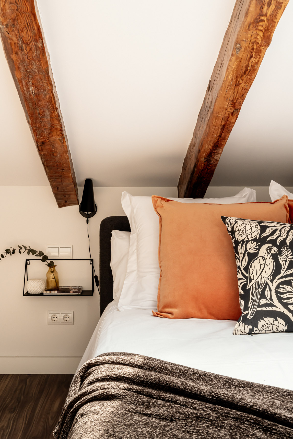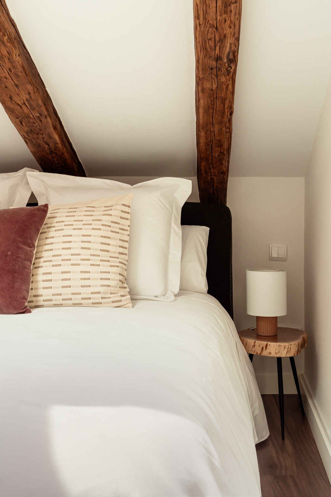 Desde el salón parten dos escaleras. Una de ellas nos conduce a la planta superior, donde se encuentran los otros dos dormitorios dobles de la vivienda, ambos equipados con cama de matrimonio. Destacan los techos abuhardillados y las vigas de madera, que los convierten en espacios realmente acogedores. Un cuarto de baño completo, situado en esta planta, da servicio a ambos dormitorios.