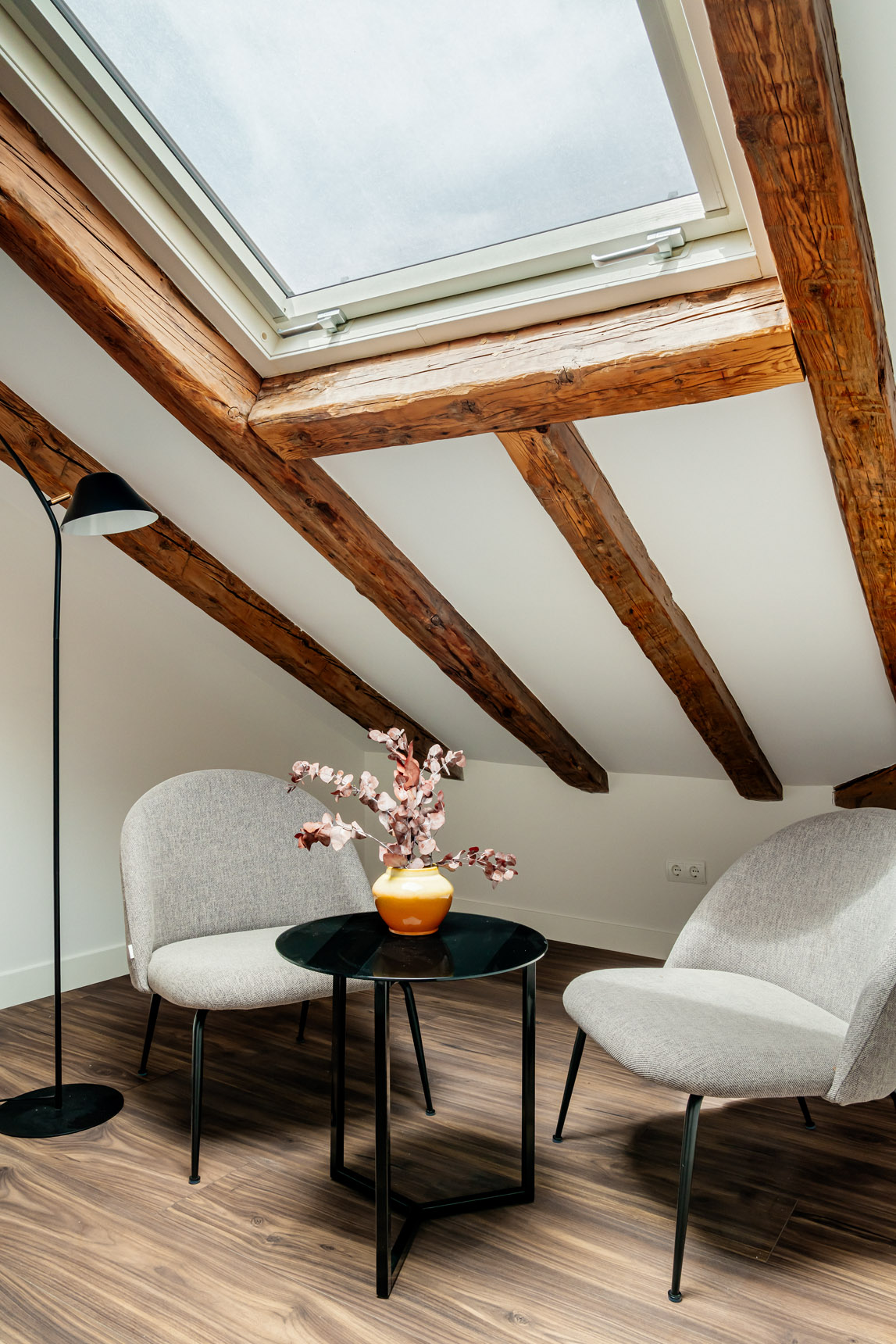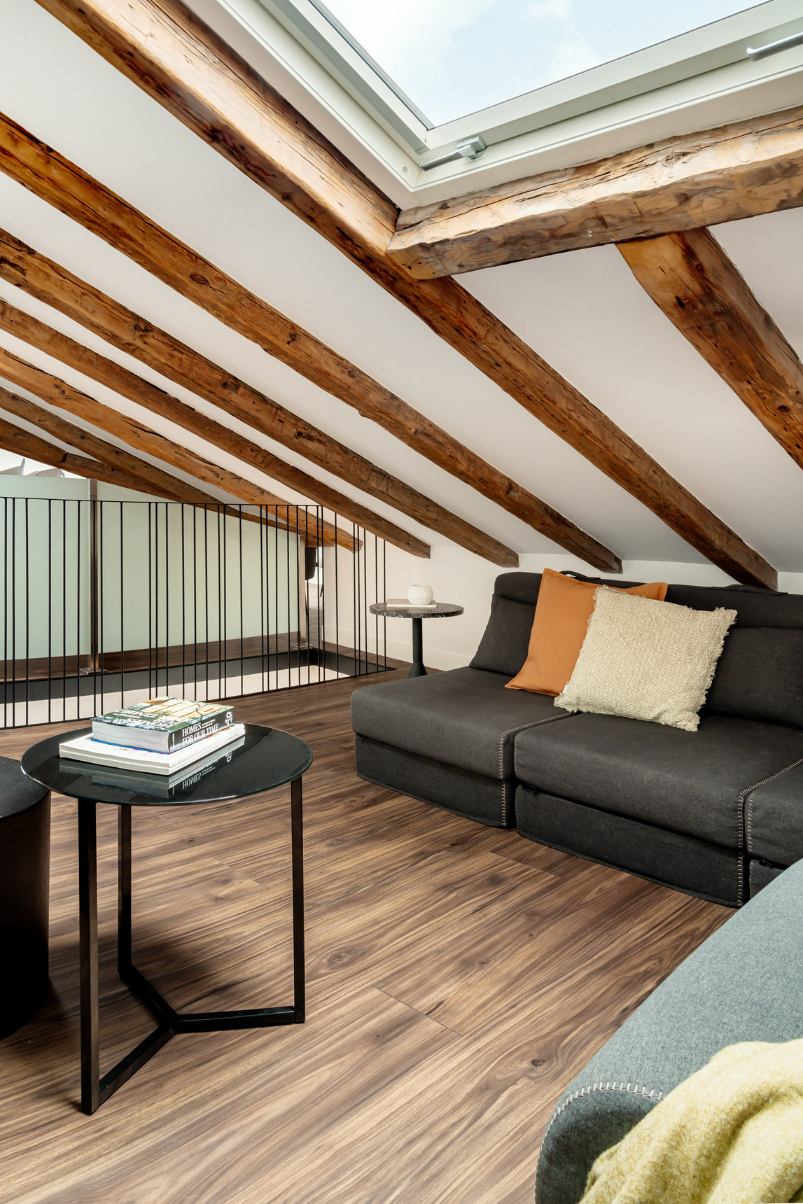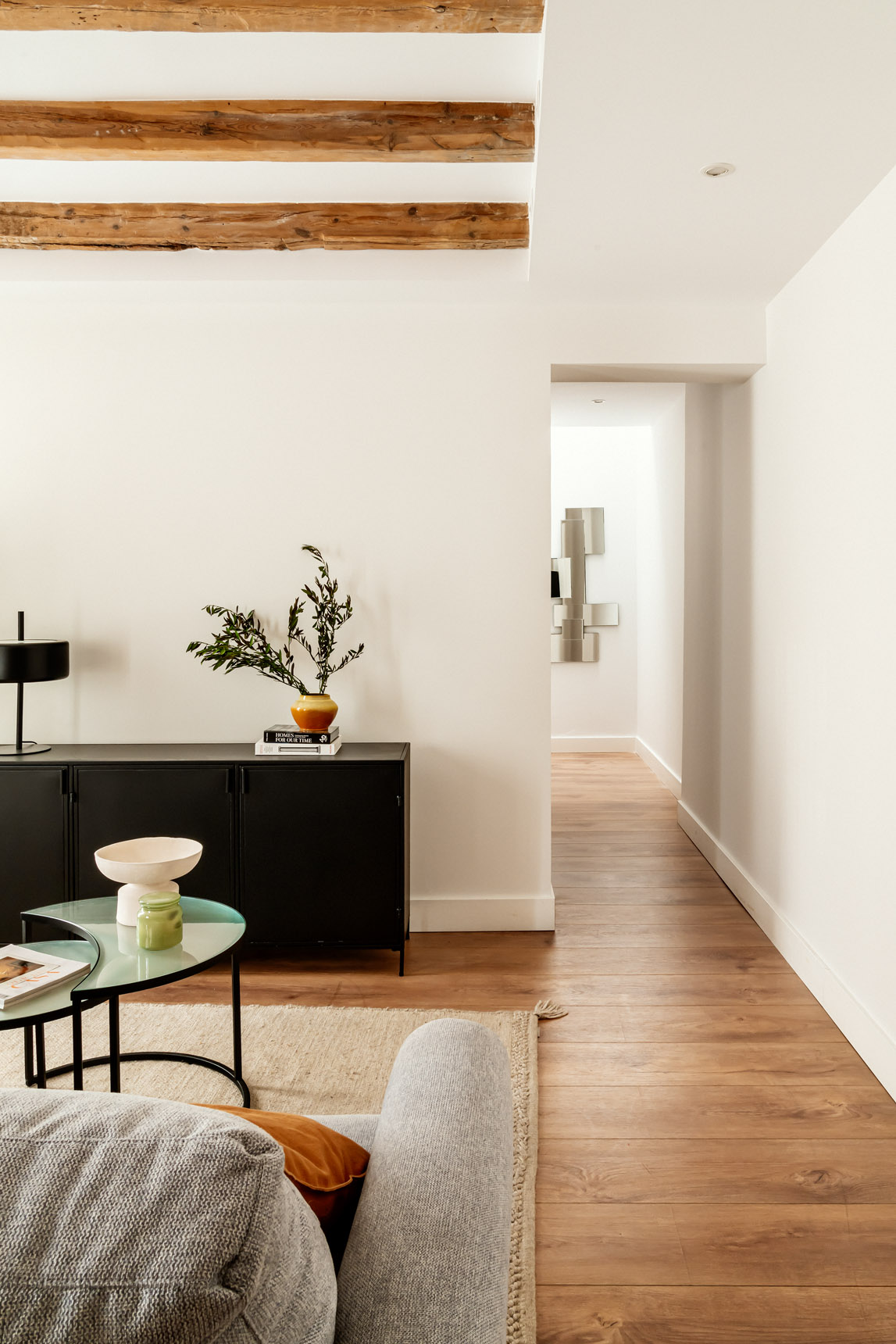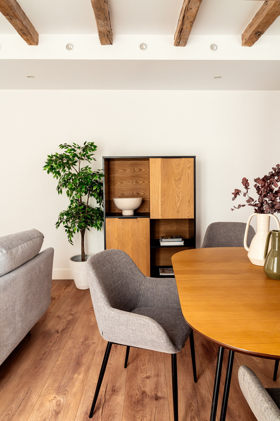 Con una superficie de 115 m2, este singular dúplex ha sido completamente reformado. Accedemos a la planta baja de la vivienda a través de un hall que nos conduce la amplia área social donde conviven cómodamente el comedor, que ofrece una mesa para 4 comensales, y la zona de salón. Preciosas vigas de madera aportan calidez y personalidad al espacio.