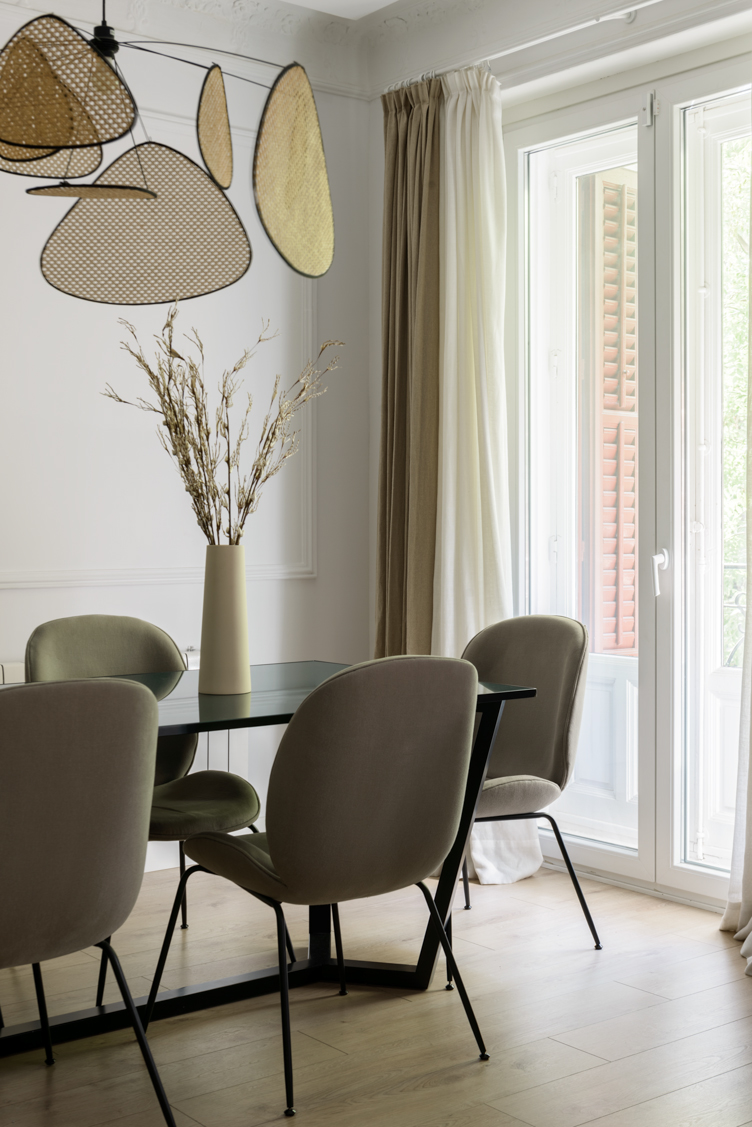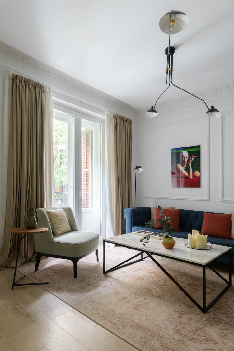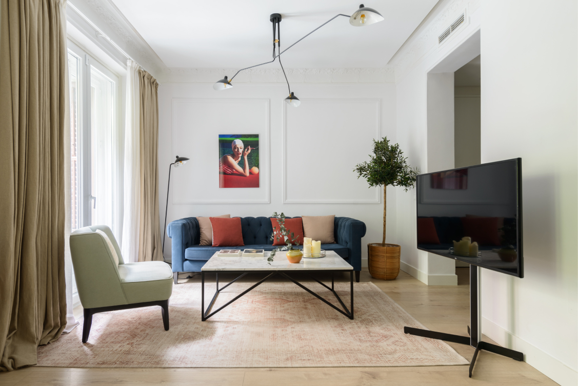 El salón, que cuenta con dos fantásticos balcones que dan a la calle Jorge Juan, se distribuye en dos áreas bien diferenciadas, la confortable zona de estar y el área de comedor, con capacidad para 6 comensales.