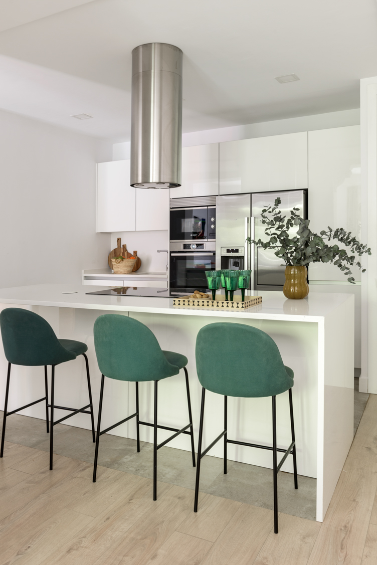La cocina se sitúa a continuación y ha sido completamente amueblada y equipada con todo tipo de grande y pequeño electrodoméstico, así como variado menaje. Una formidable isla actúa como eje central a la vez que funciona como barra, perfecta para comidas rápidas e informales o desayunos, gracias a los 4 taburetes que la acompañan.