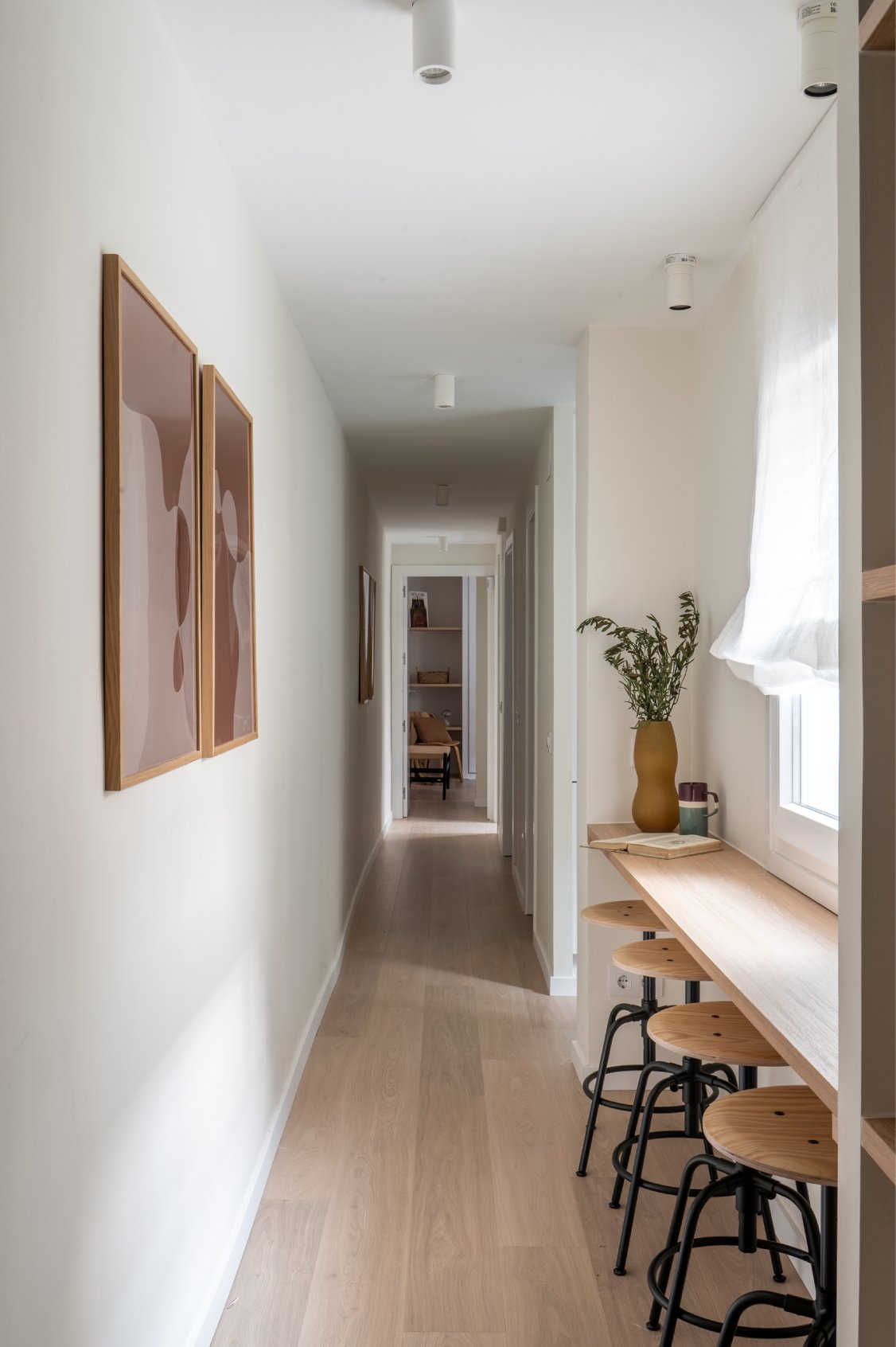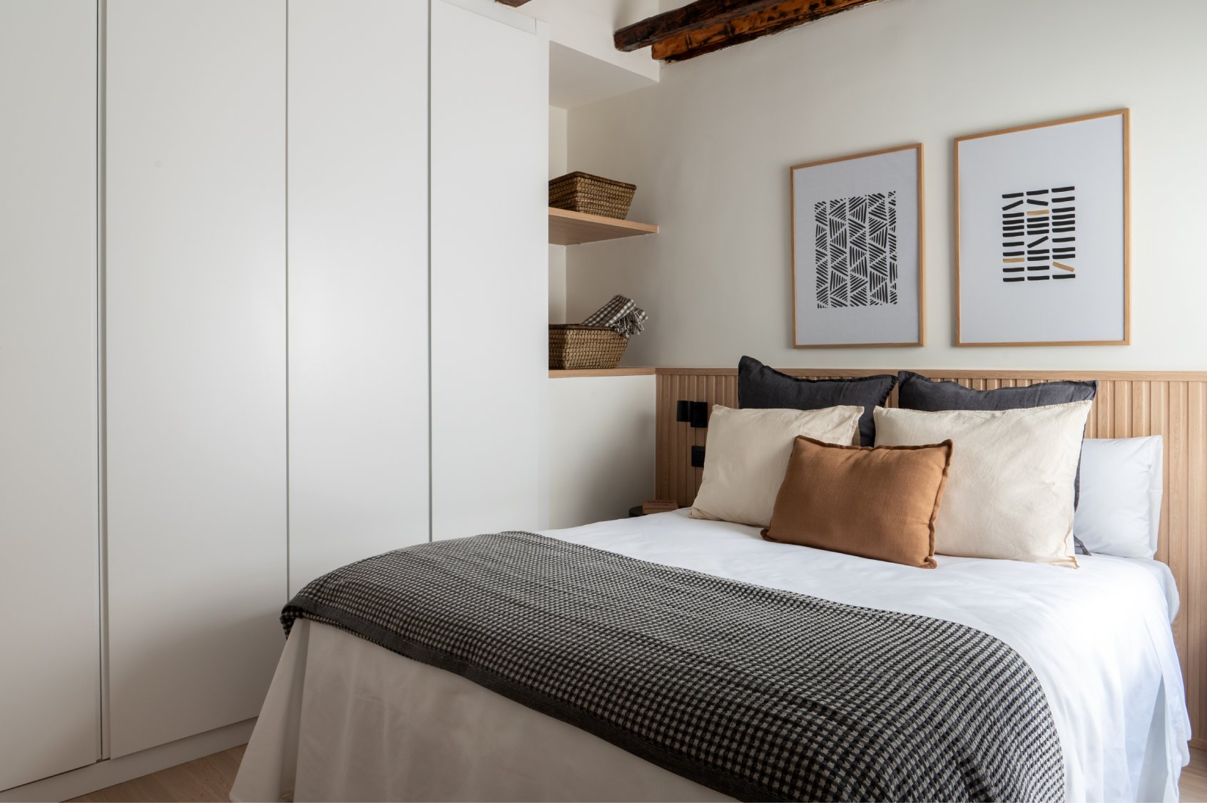 Los dos dormitorios, ambos dobles, destacan por su serenidad y equilibrio. Disponen de armarios empotrados y una decoración que apuesta por tonos neutros y naturales. Un baño completo da servicio a ambos dormitorios, manteniendo la misma línea estética de sobriedad y confort.