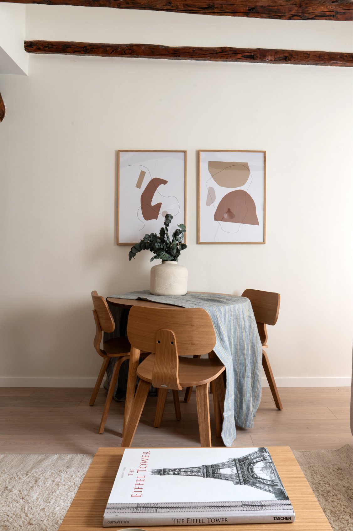 Al acceder a la vivienda, nos recibe la zona social, compuesta por una agradable área de estar y un comedor con capacidad para cuatro comensales. Las vigas de madera vista que recorren el techo aportan personalidad, creando una atmósfera acogedora.