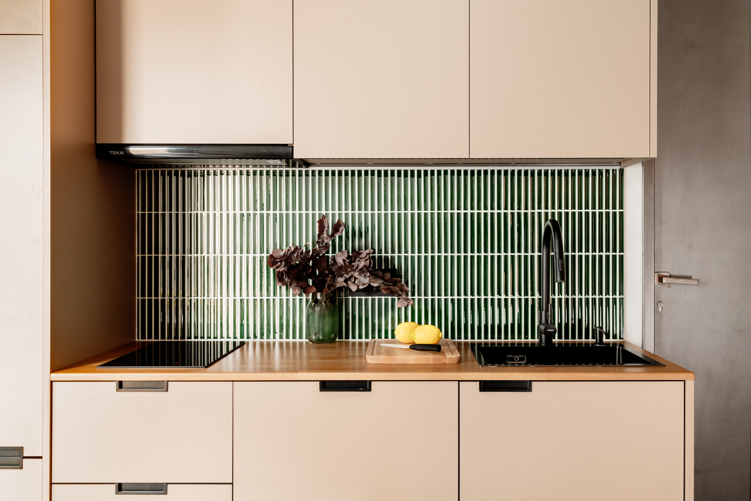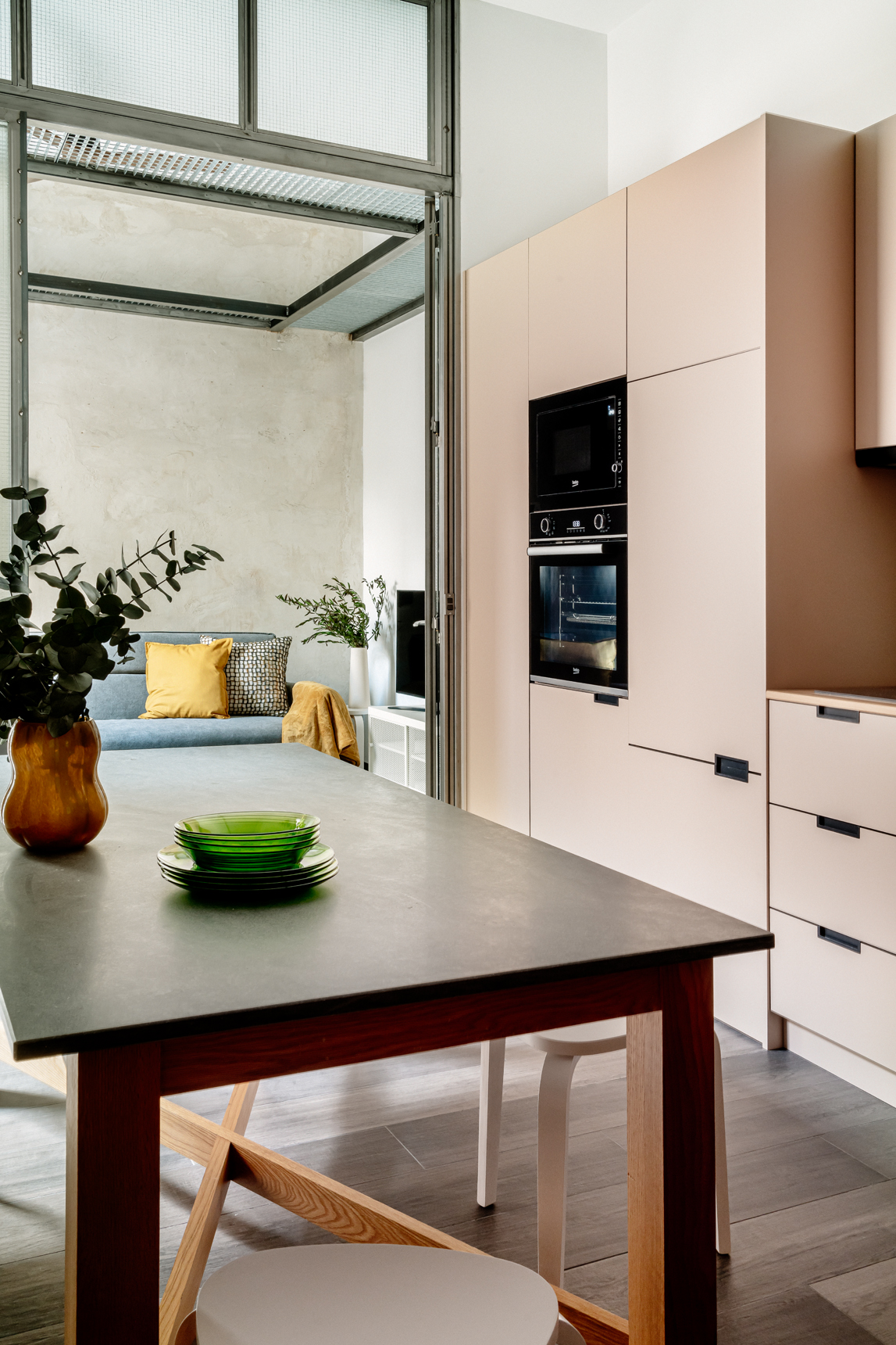 Accedemos a la vivienda por la planta baja y nos recibe la cocina, la cual ha sido completamente amueblada y equipada con grande y pequeño electrodoméstico, así como variado menaje, y frente a ésta se encuentra la mesa de comedor. A continuación, se ubica el salón el cual puede permanecer abierto a la cocina, o cerrarse gracias a unas puertas de cristal, lo que permite una mayor flexibilidad en el espacio. El salón ha sido equipado con televisión y un sofá-cama, perfecto para acoger a visitas ocasionales. Desde aquí, se accede aun pequeño patio con tendedero.