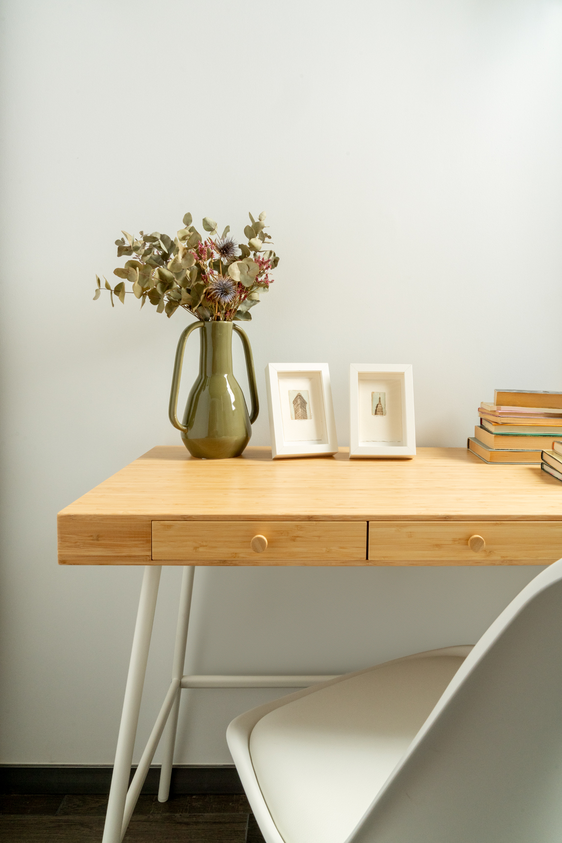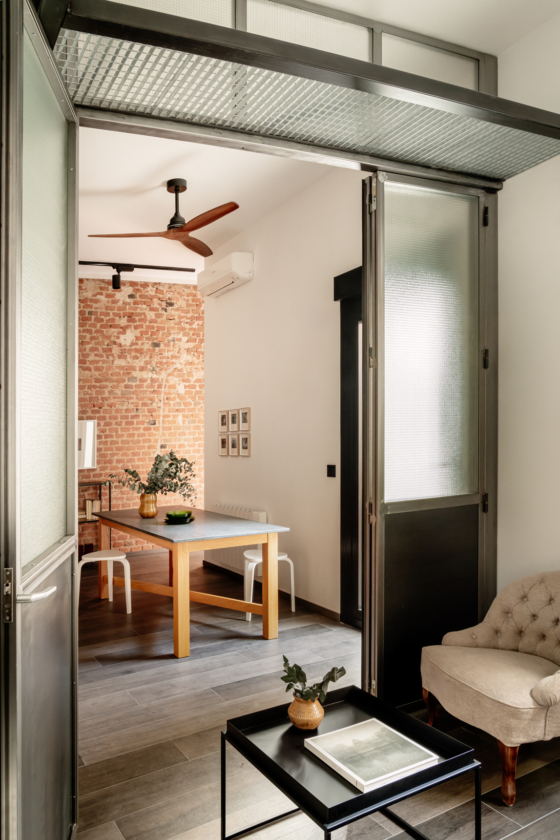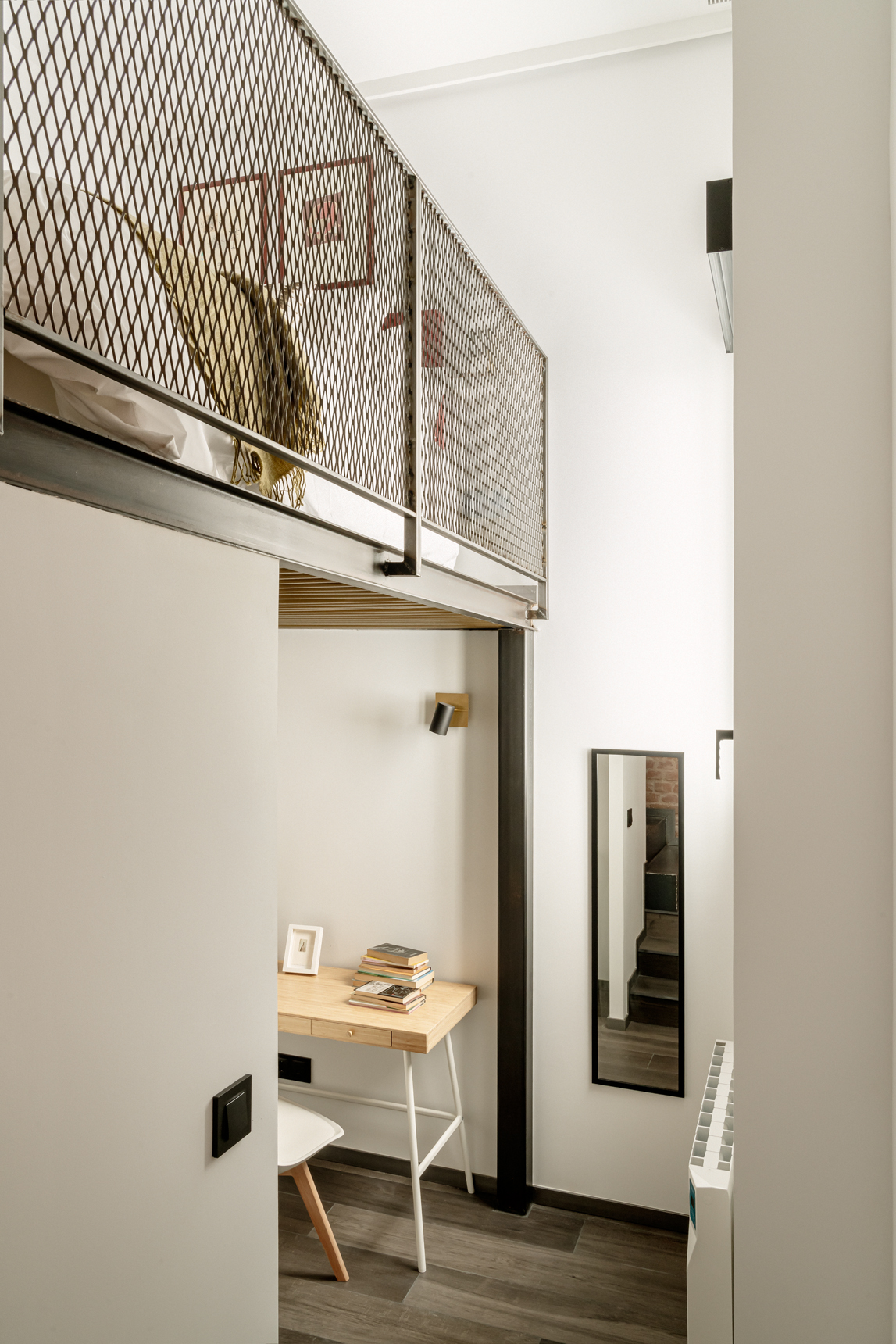 Unas escaleras metálicas de estilo industrial nos conducen a la planta superior donde se ubica el dormitorio, cuya distribución aprovecha al máximo el espacio. La cama, situada en altura, ha permitido que en la parte inferior se disponga de un escritorio, una cómoda y un armario abierto.