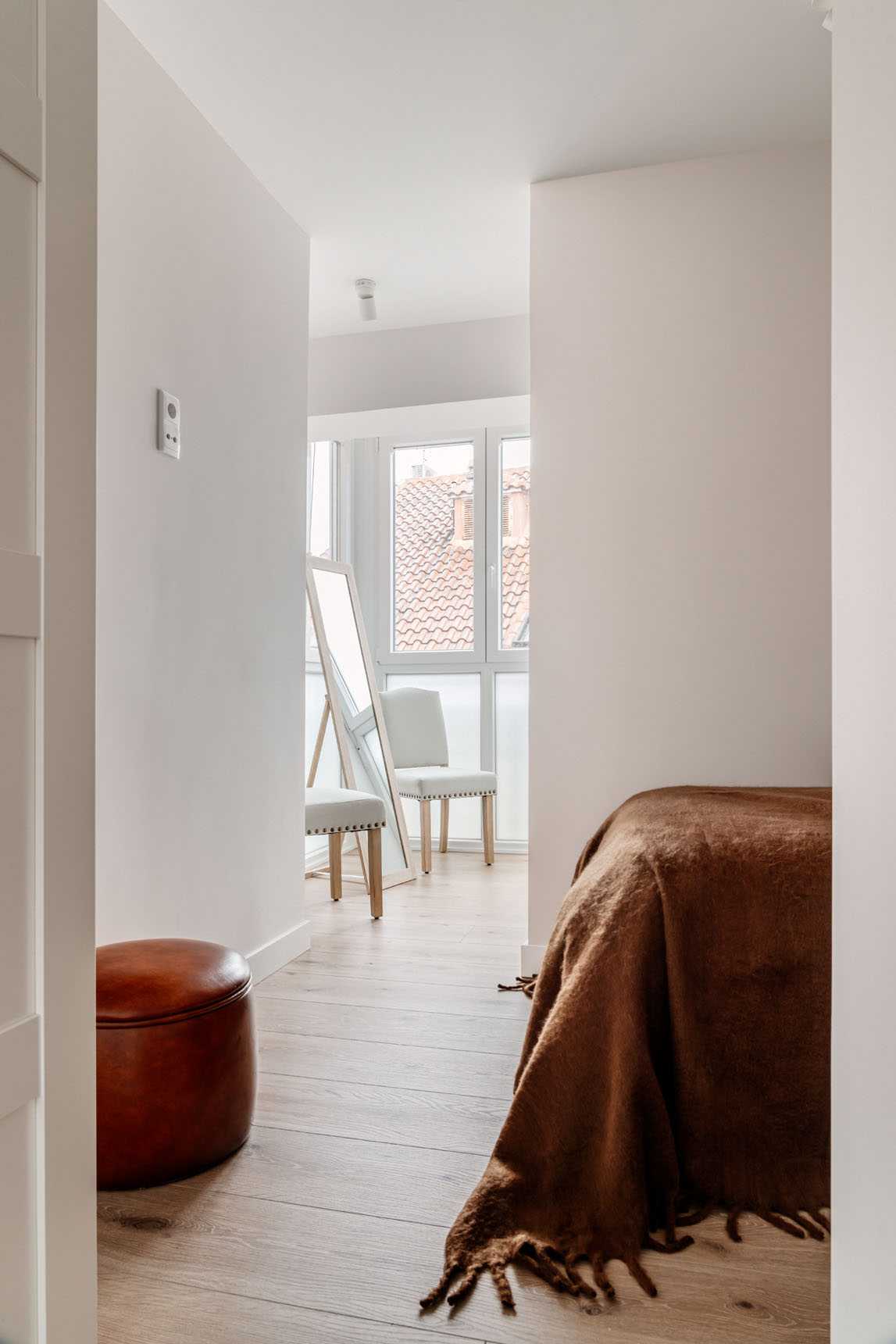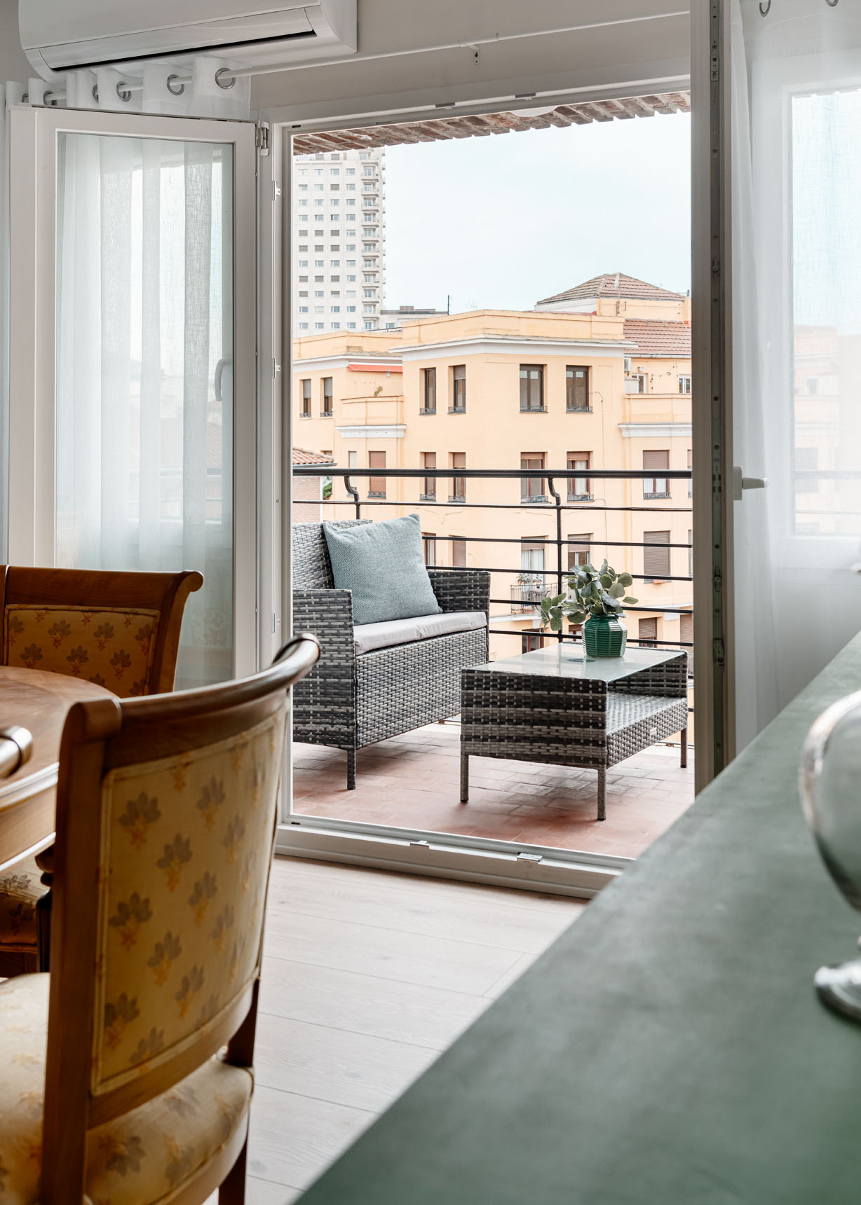 Frente a la cocina se encuentra la luminosa zona social, compuesta por el cómodo salón y el comedor, con capacidad para 6 comensales. Desde aquí, se accede a la terraza, un auténtico privilegio en pleno centro de Madrid, ideal para disfrutar del aire libre sin necesidad de salir de casa.