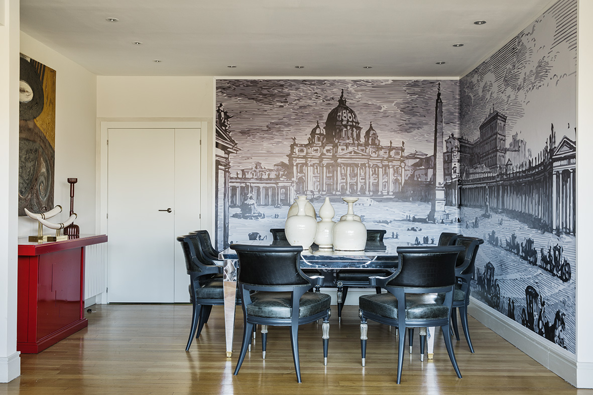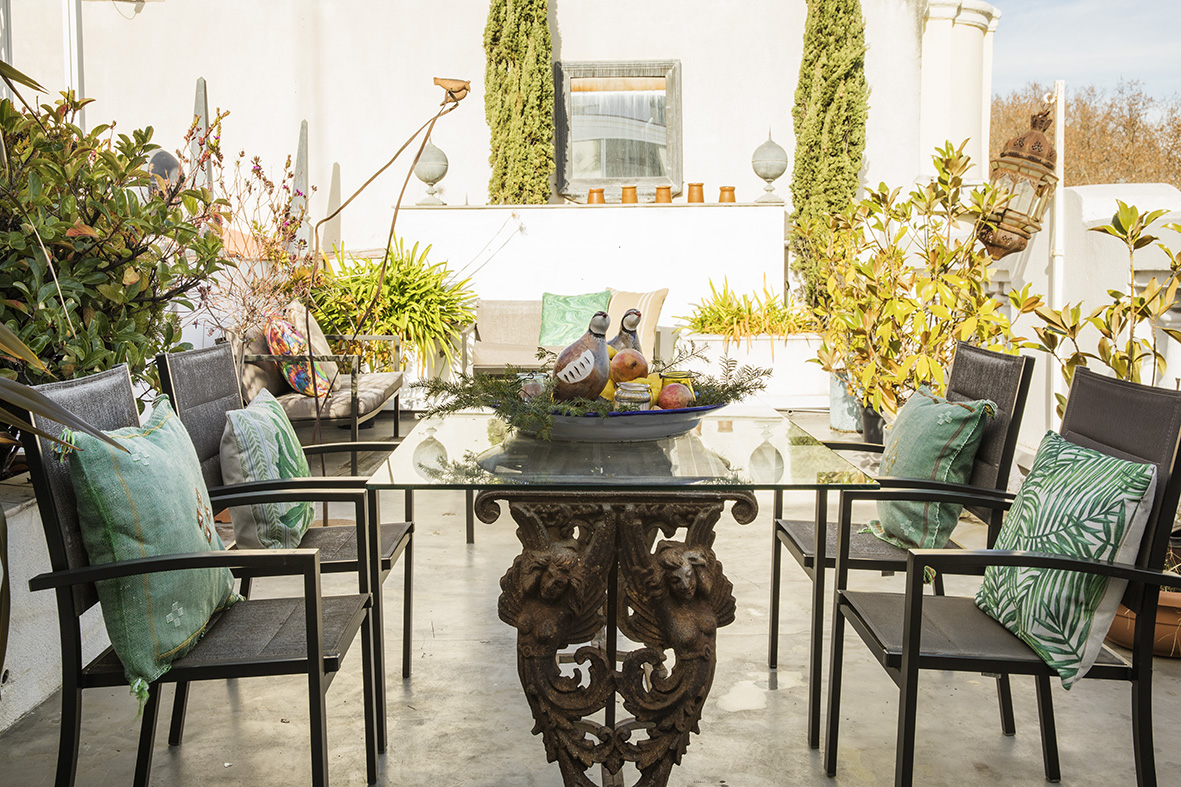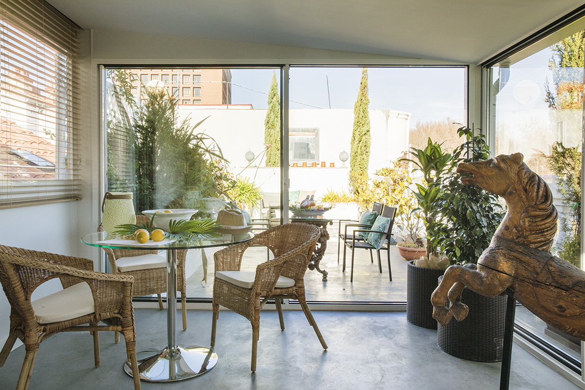 A la izquierda, unos escalones conducen a un acogedor cuarto de estar acristalado a modo de invernadero, antesala del gran tesoro de la casa: una espectacular terraza, con vistas únicas del Paseo del Prado, con el Parque del Retiro al fondo. Su gran tamaño ha permitido organizar dos ambientes, la zona de estar al fondo y el comedor en primer lugar, en torno a una imponente mesa de hierro y cristal.