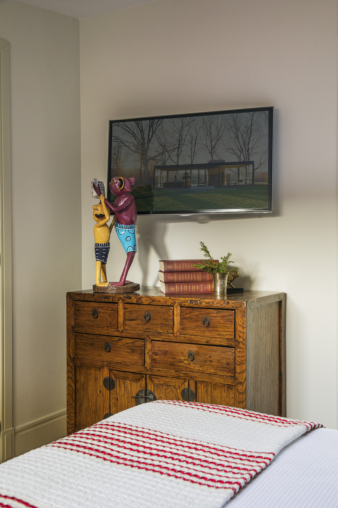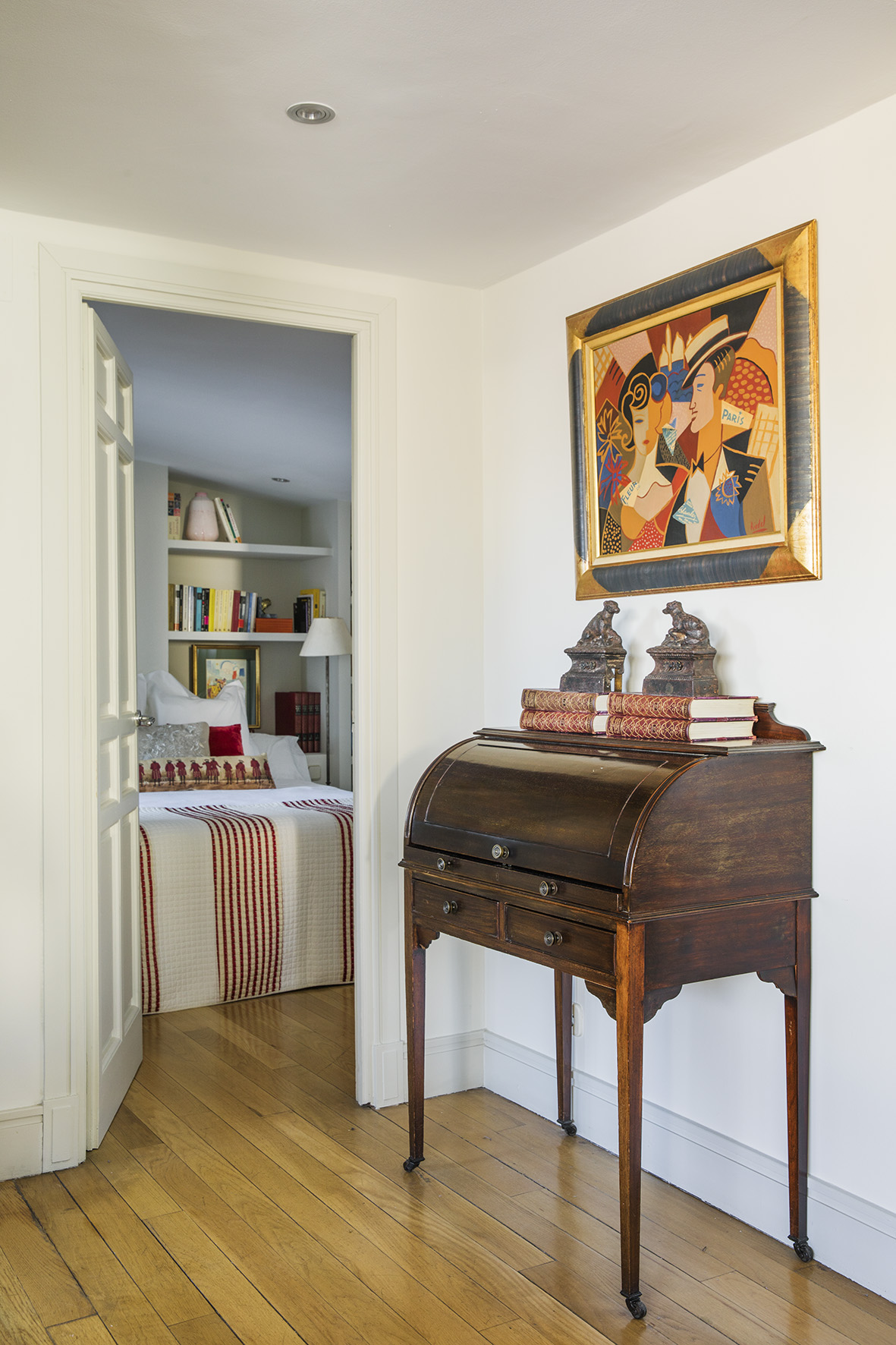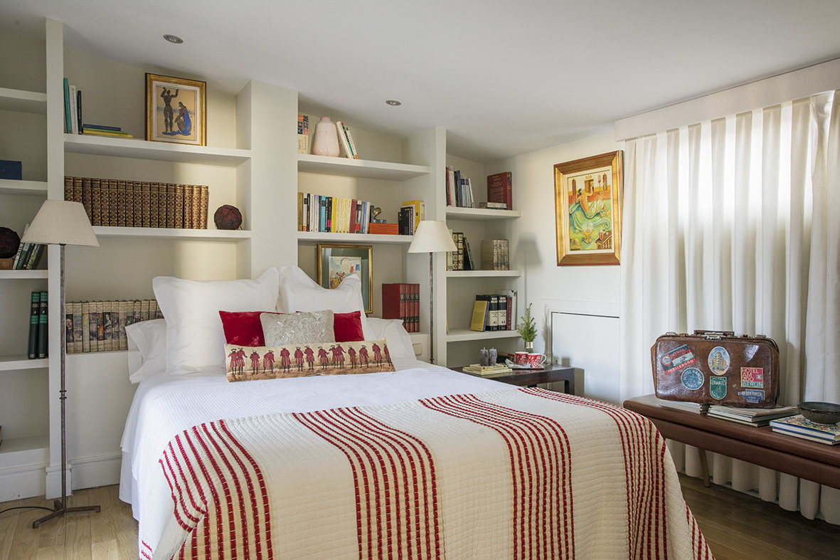 El dormitorio principal dispone de cama queen size y disfruta de una gran librería de obra a modo de cabecero, que resulta muy decorativa a la vez que práctica, y de un cuarto de baño muy especial, con una vista espectacular.