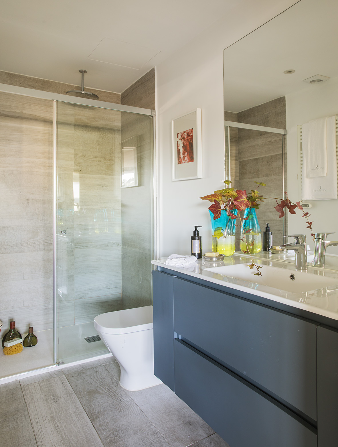 Un segundo cuarto de baño equipado con ducha dará servicio al dormitorio de invitados y además funcionará como aseo de cortesía, al encontrarse junto a la entrada de la casa.
