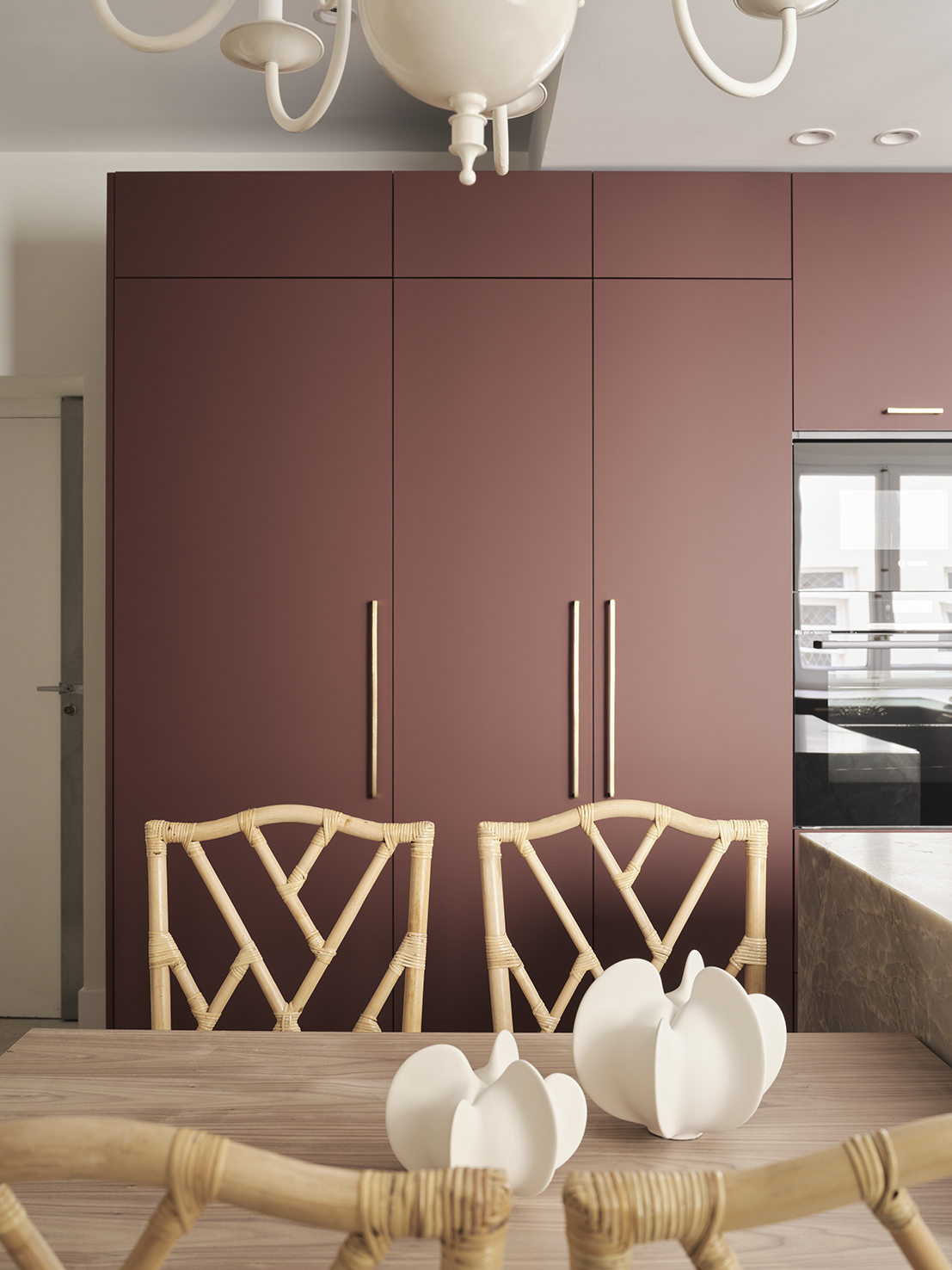 En primer lugar se ubica la cocina, totalmente amueblada y equipada con grande y pequeño electrodoméstico y un completo y variado menaje. Su diseño funcional incluye una gran isla central con doble función de superficie de trabajo y almacenamiento, además de una cómoda mesa con capacidad para cuatro personas, muy cómoda para comidas informales en el día a día.