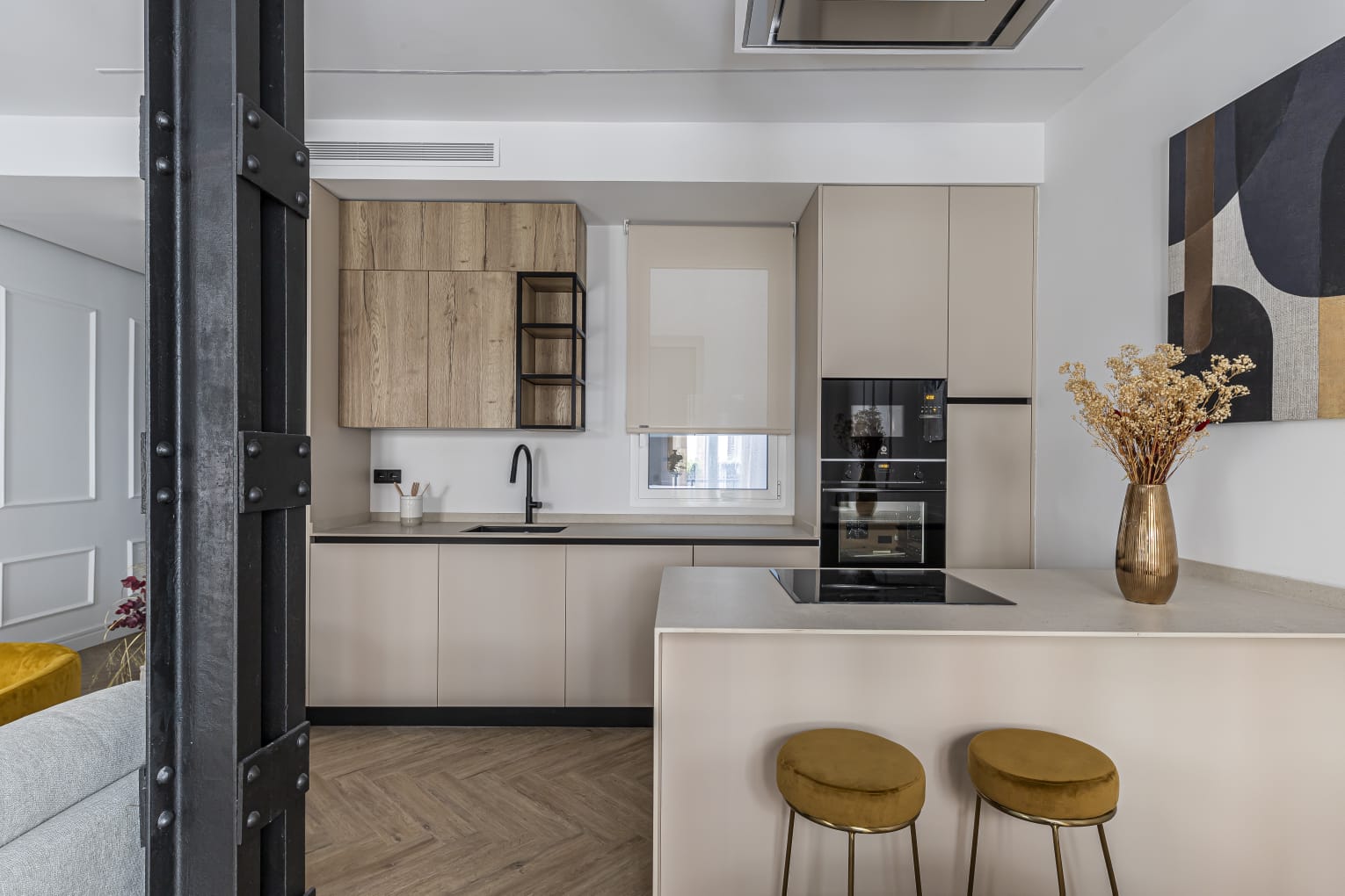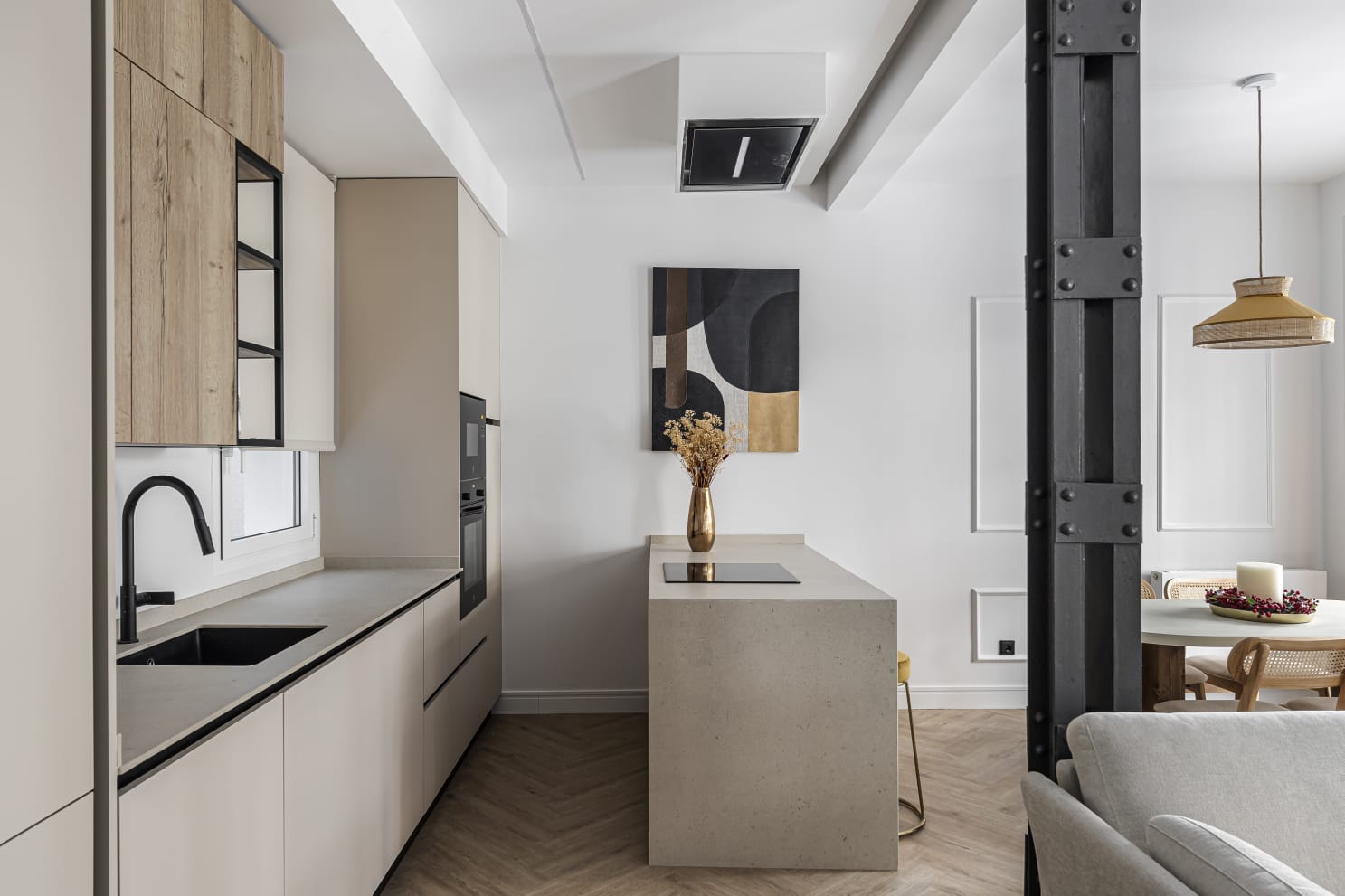 La cocina, de planta abierta, está completamente amueblada y equipada con electrodomésticos grandes y pequeños y cuenta además con variado menaje. Una barra con dos taburetes no solo facilita desayunos informales, sino que también actúa como un elegante separador de la zona de comedor.