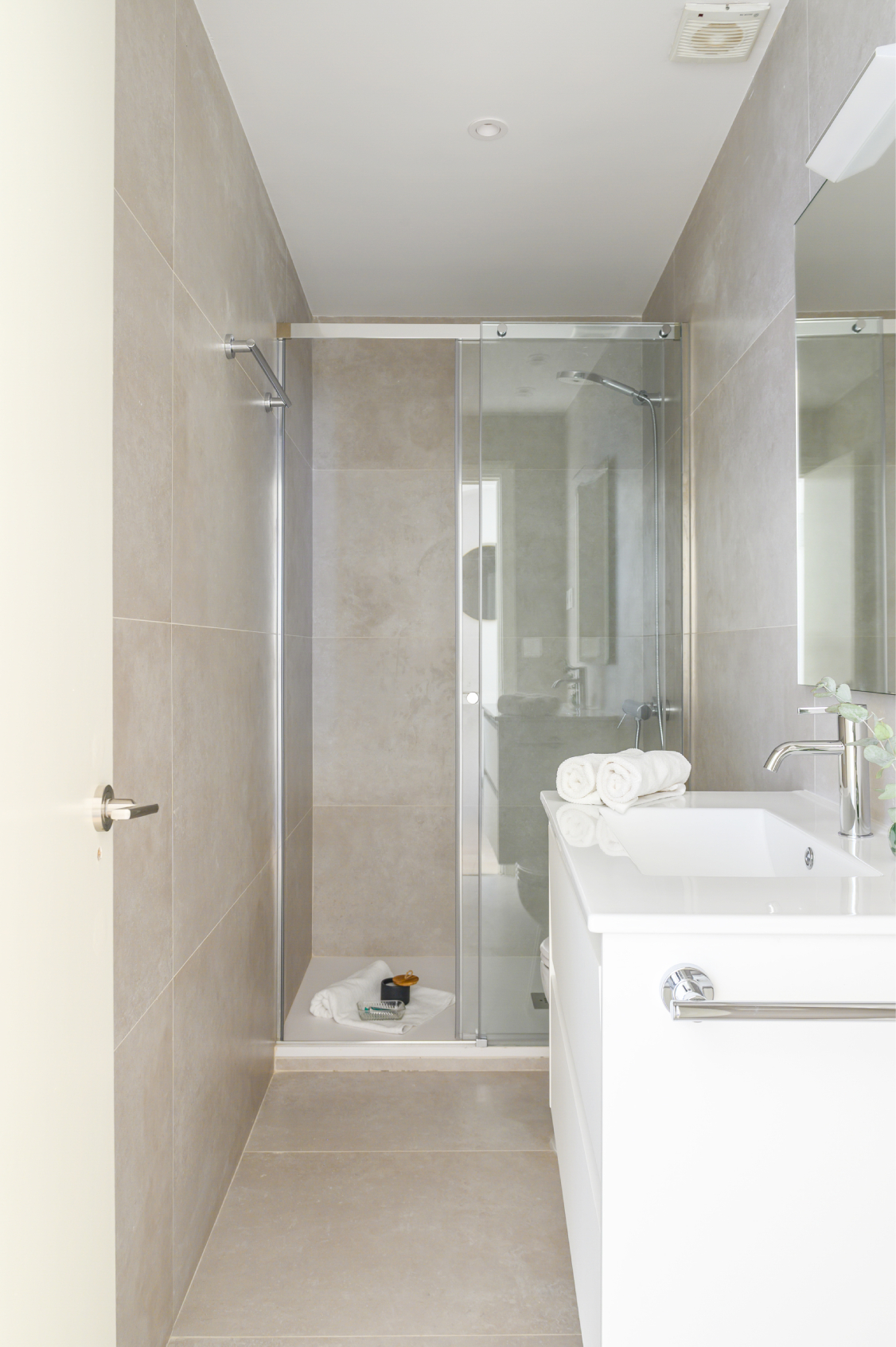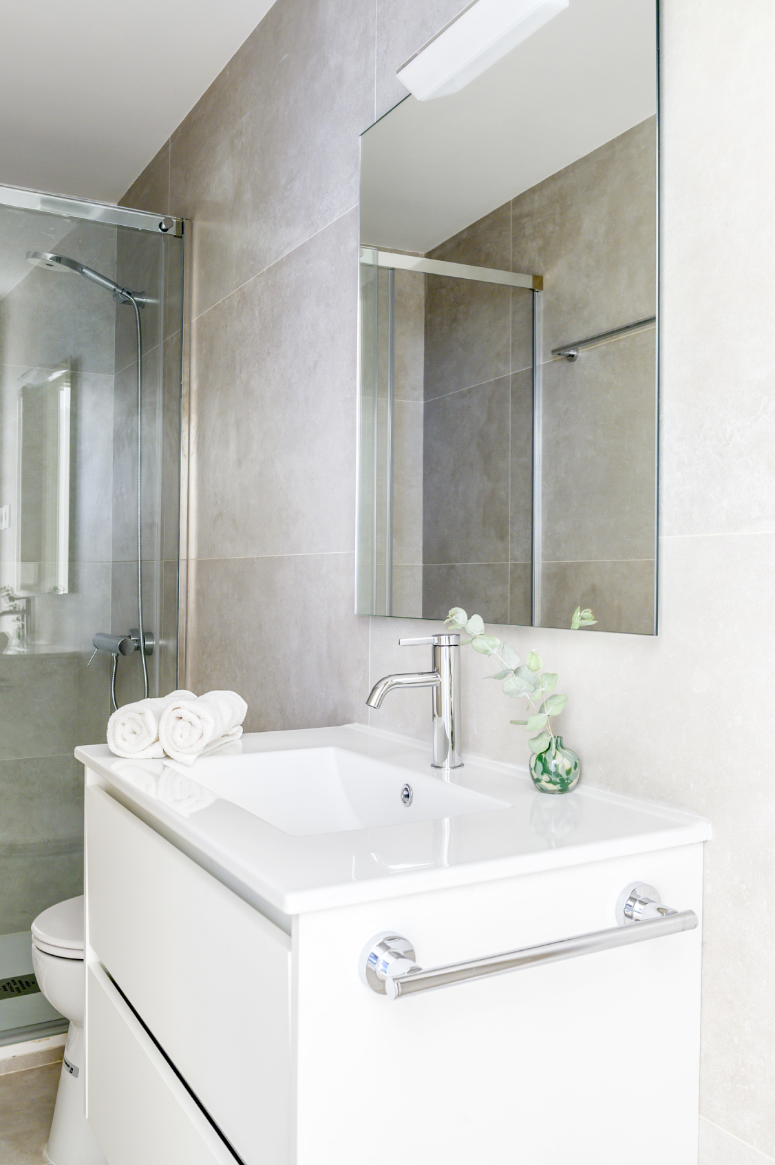 El cuarto de baño se sitúa junto a la zona social, dando servicio tanto a las visitas como al dormitorio.
