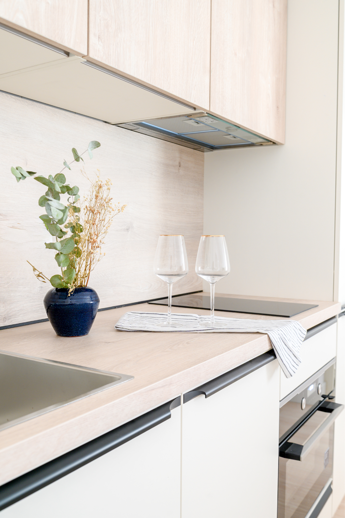En la zona social conviven el salón, con una cómoda zona de estar y la cocina, de planta abierta y completamente equipada con variado menaje así como grande y pequeño electrodoméstico. Una mesa de comedor para dos personas completa este espacio.