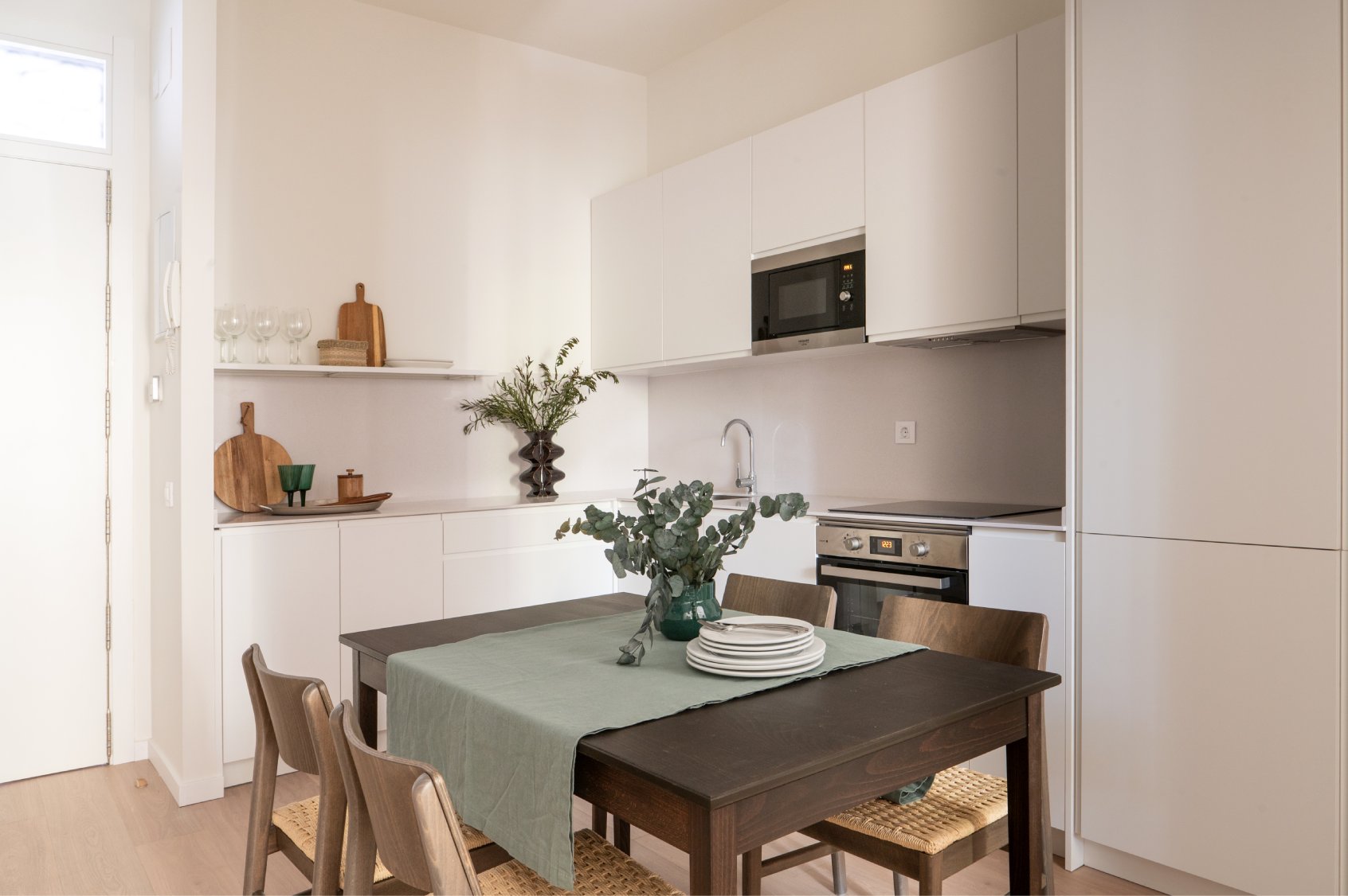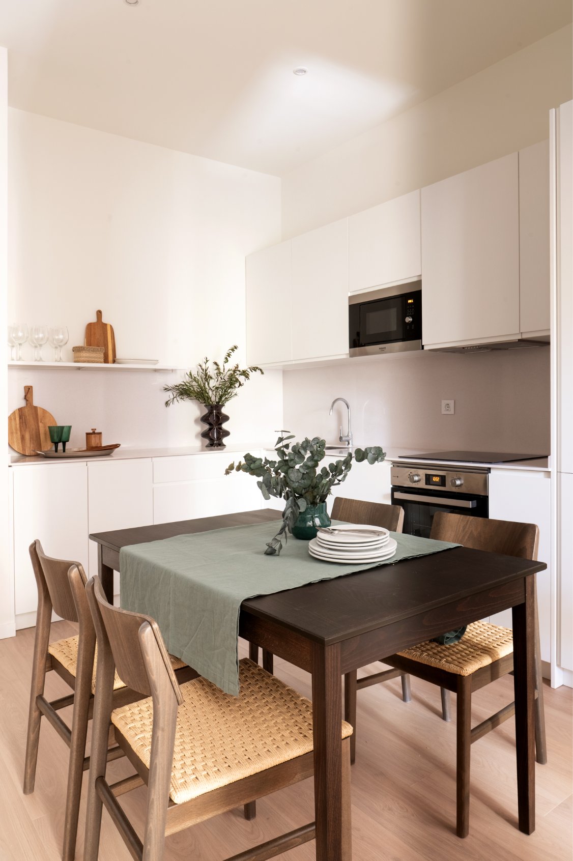 La cocina, de planta semiabierta, da la bienvenida al entrar en la vivienda. Está completamente equipada con electrodomésticos grandes y pequeños, variado menaje y mobiliario panelado a medida. Un comedor con capacidad para cuatro personas completa esta estancia.