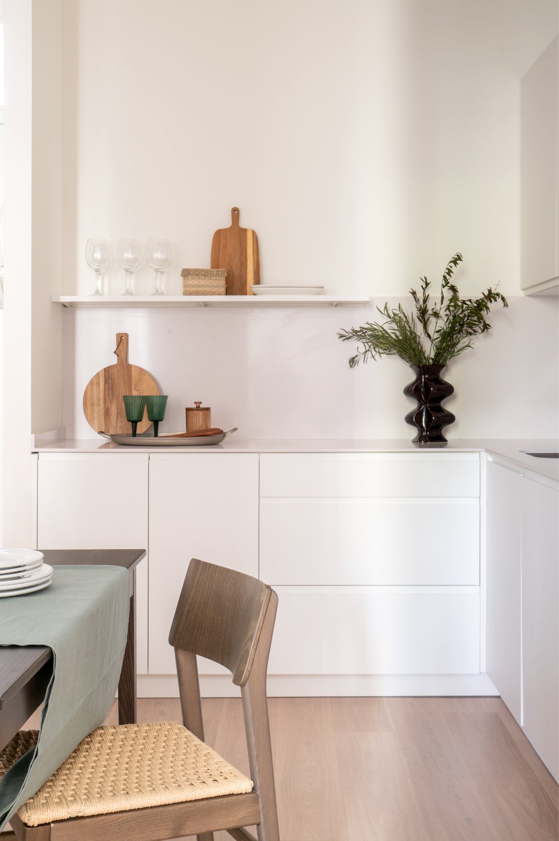 La cocina se comunica con el salón a través de dos entradas abiertas, lo que facilita la circulación y mantiene una conexión visual entre ambos espacios, a la vez que define las zonas de manera natural.