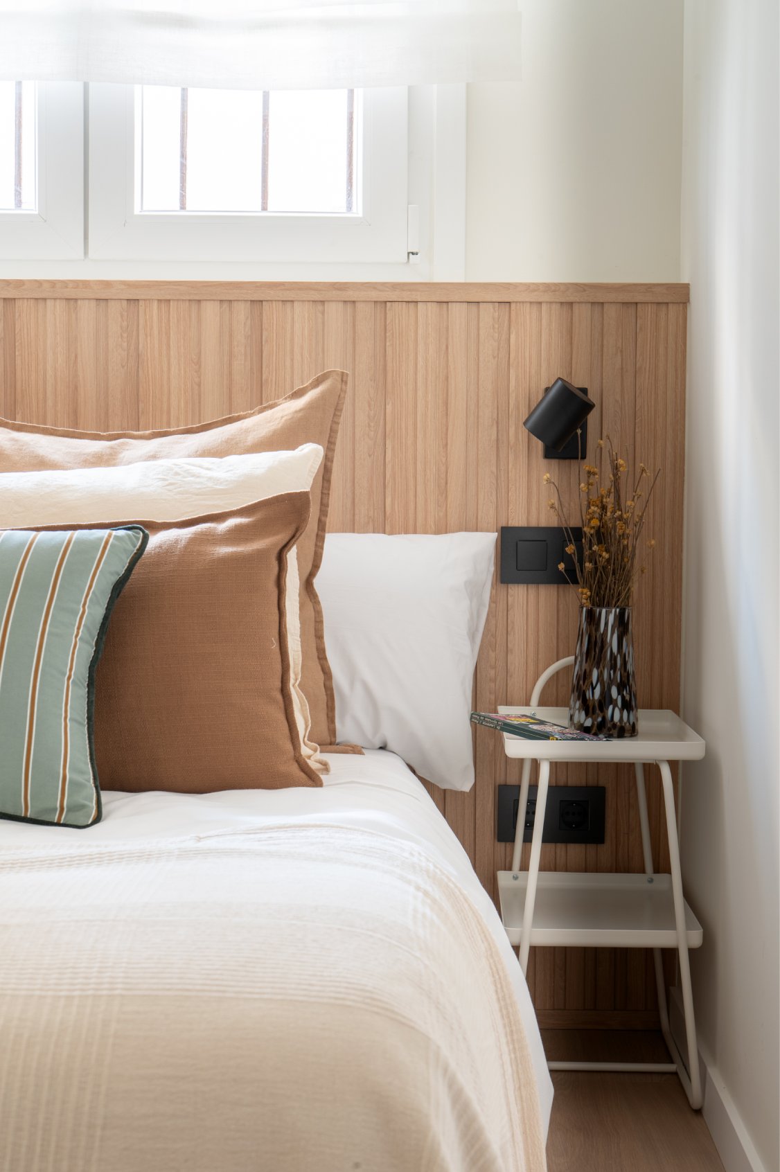 El dormitorio principal, también exterior y con balcón, se ubica junto al salón. Cuenta con una cama de matrimonio, amplios armarios empotrados y un baño en suite. En el lado opuesto de la vivienda se encuentran los otros dos dormitorios dobles, ambos equipados con cama de matrimonio y gran capacidad de almacenaje. Comparten un baño completo, situado en el pasillo, que también da servicio a las visitas.