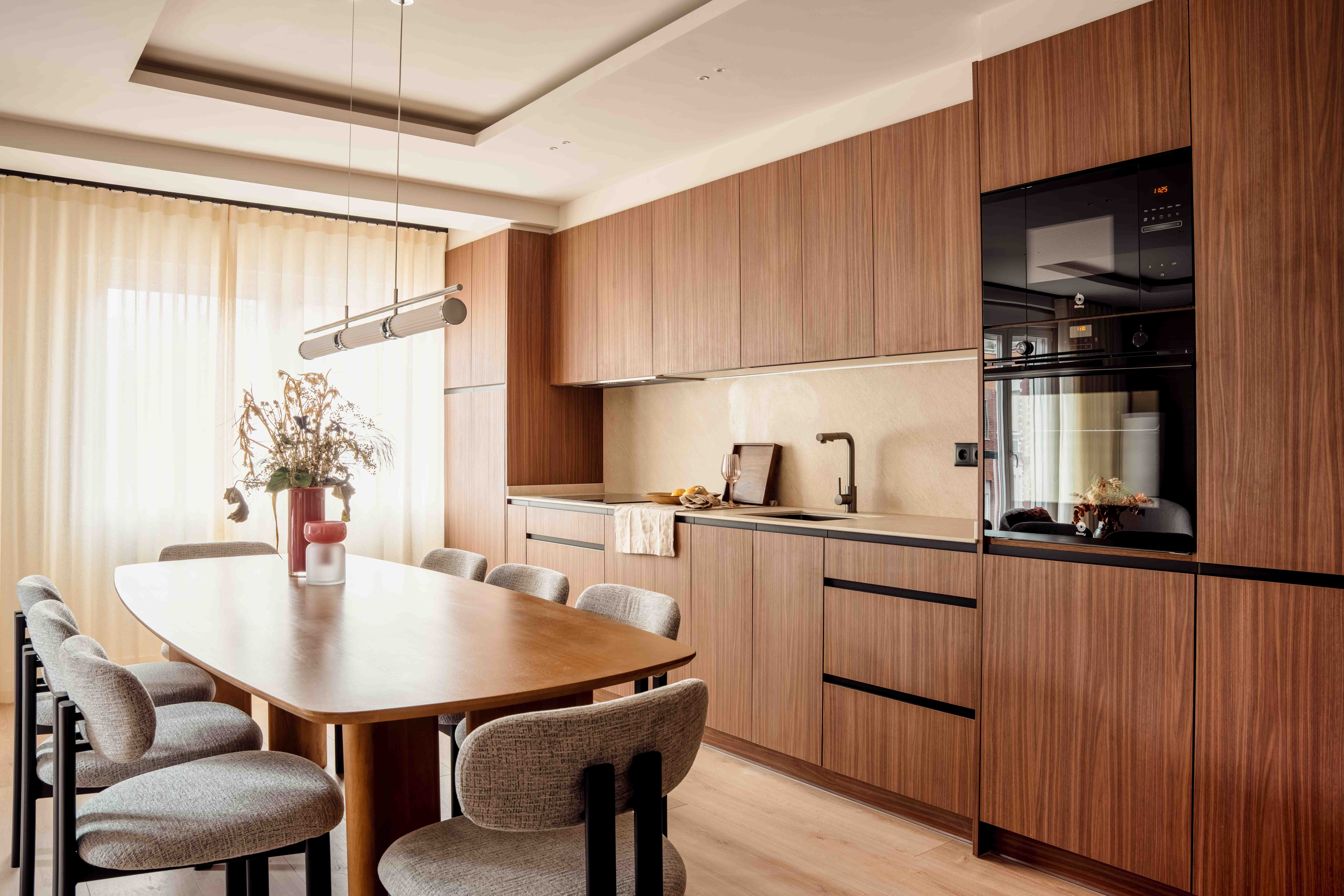 La zona social se presenta como un ambiente amplio y sofisticado, envuelto por un elegante panelado de madera que recorre las paredes, aportando calidez y continuidad visual. Aquí conviven cómodamente el salón, el área de comedor y la cocina.