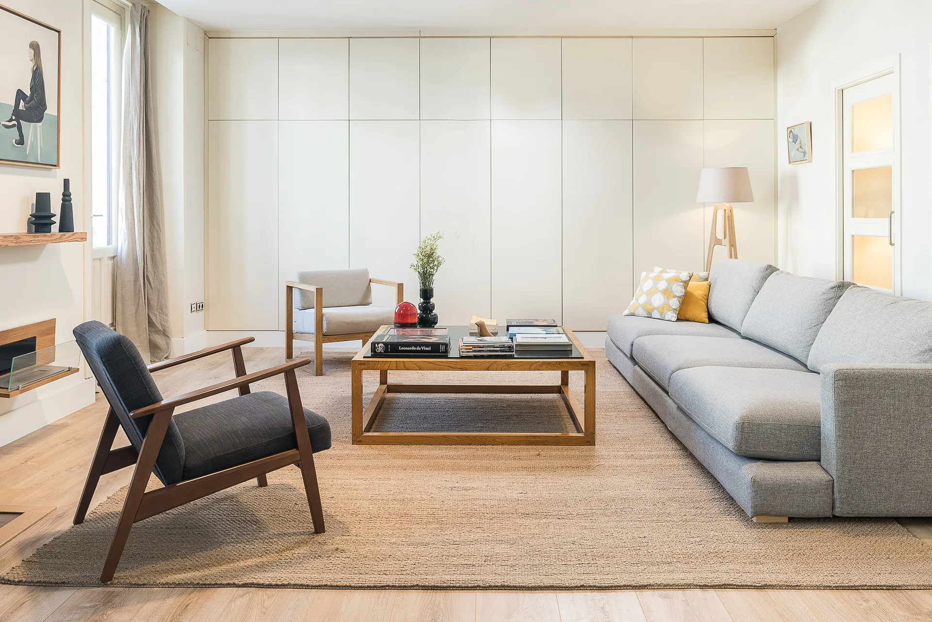 Nos da la bienvenida al apartamento un hall recibidor a través del cual accedemos a un cuarto de estar ideal para relajarse, ver la televisión o leer, y que conecta por un lado con la zona social y por otro con la zona privada del inmueble.