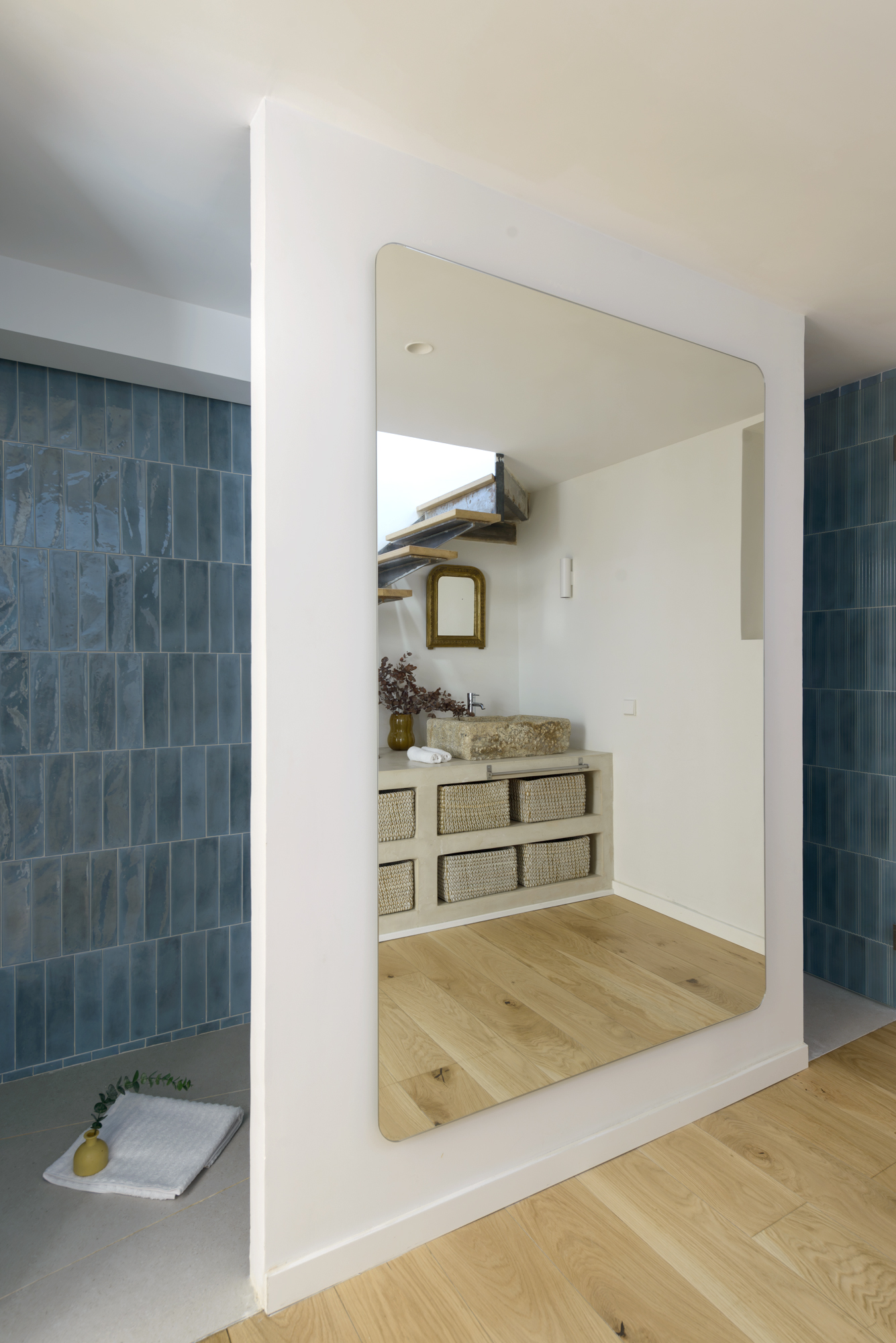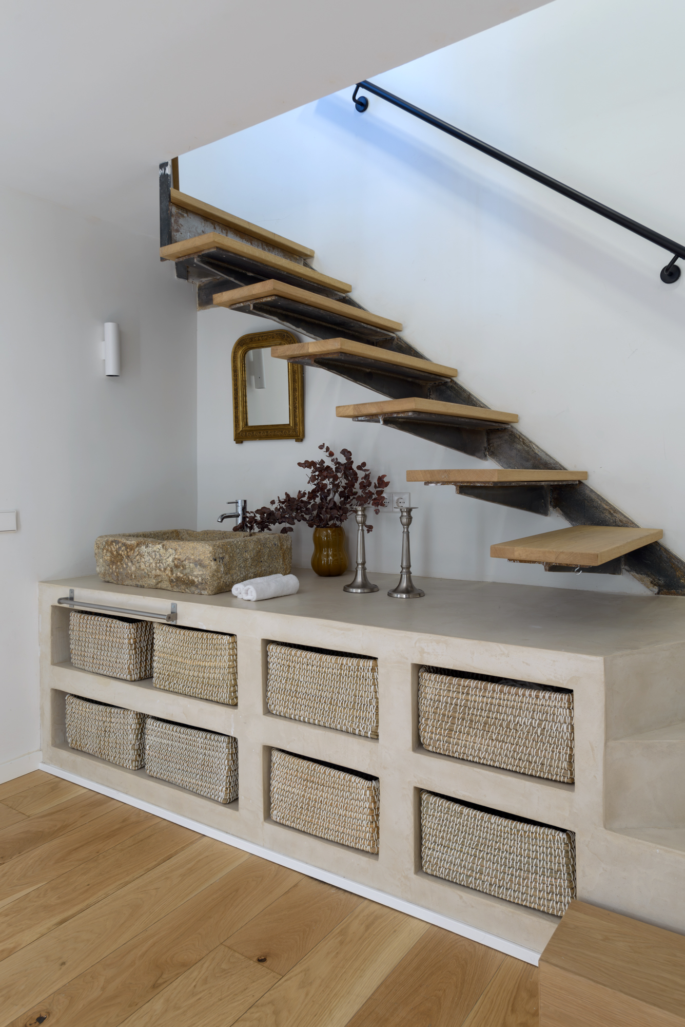 El salón, con una cómoda zona de estar, se encuentra a continuación y desde aquí parte una escalera que nos conduce al piso inferior, donde se encuentra el dormitorio, que cuenta con una gran cama doble y un amplio cuarto de baño ensuite.