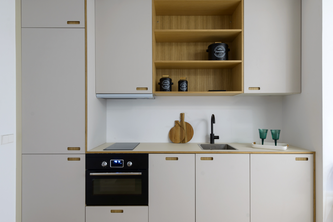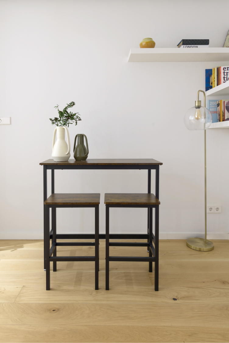 Al acceder al apartamento por la planta superior, nos encontramos con una cocina equipada con grande y pequeño electrodoméstico, además de un completo menaje. Completa la estancia una mesita alta acompañada de dos taburetes.
