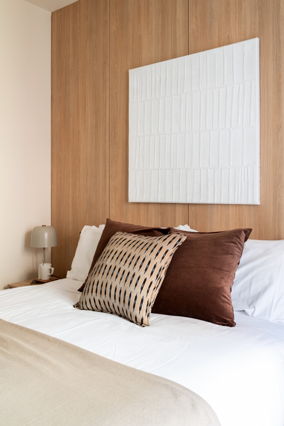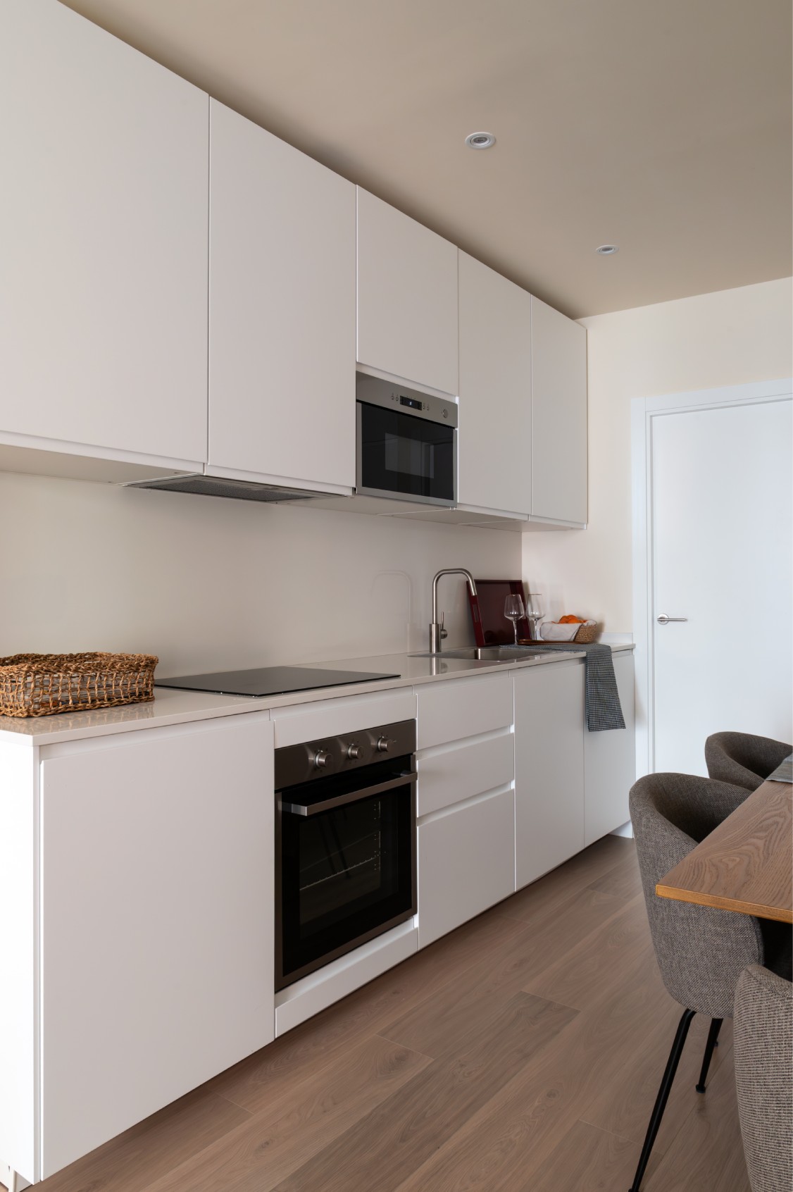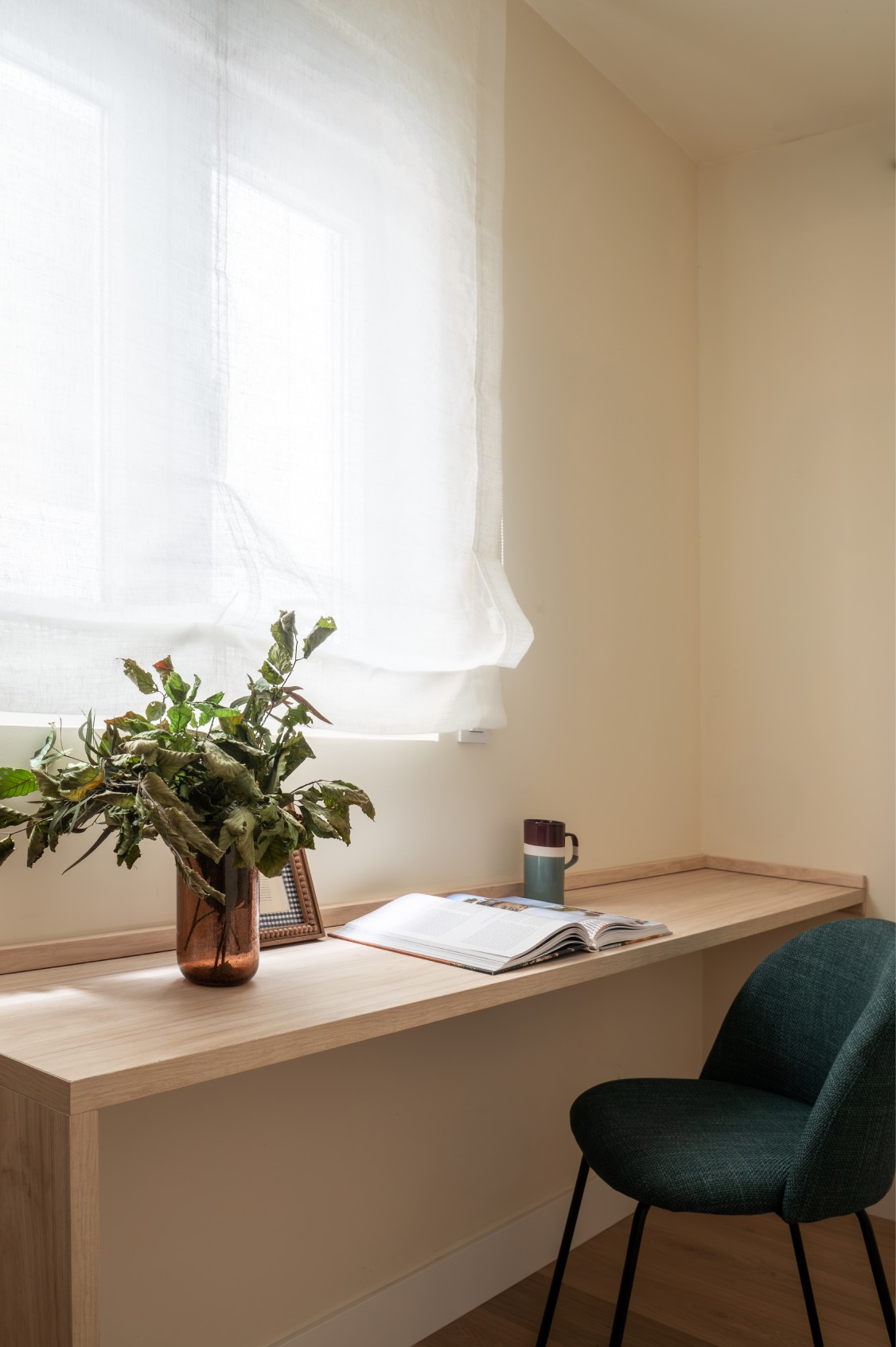 The social area is a spacious and bright space, which also has a small balcony with views of Hernán Cortés Street. His interior design project stands out, which uses elegant light wood paneling on the walls, bringing great warmth to the space. This neutral and serene base contrasts perfectly with the designer furniture, where the comfortable sofa stands out in an elegant shade of green.