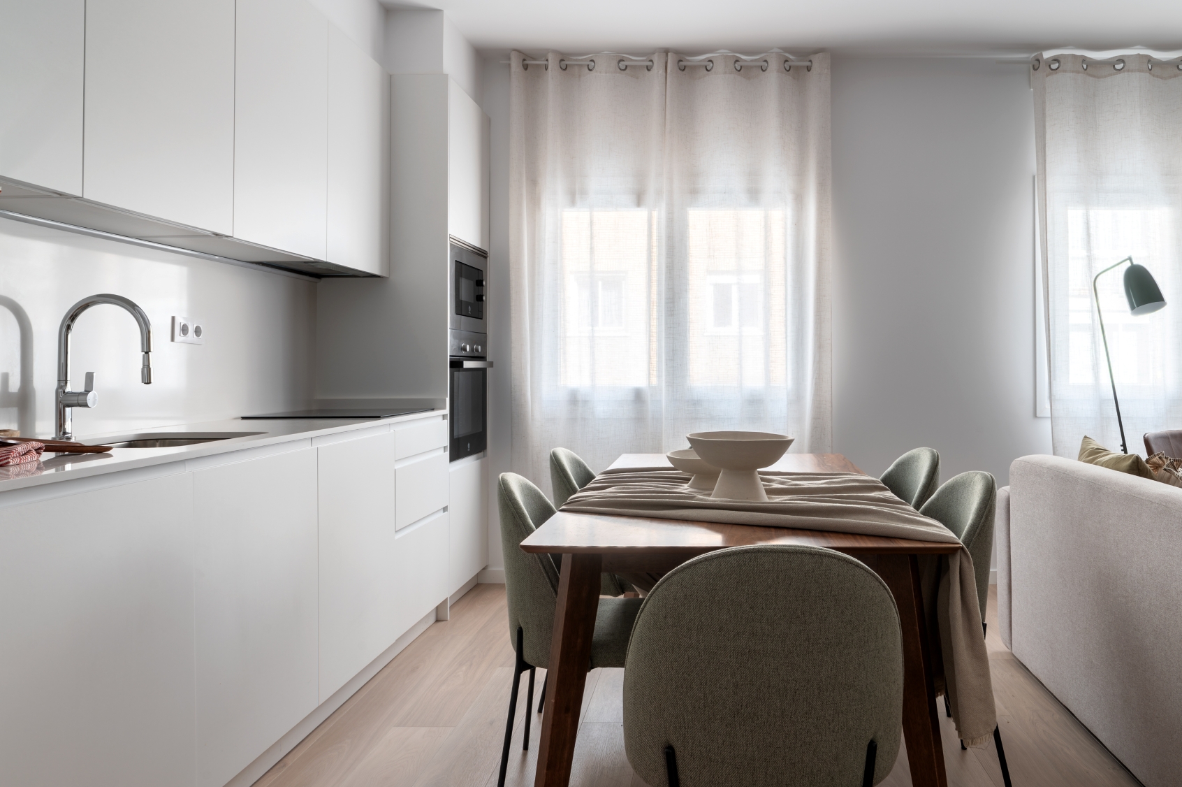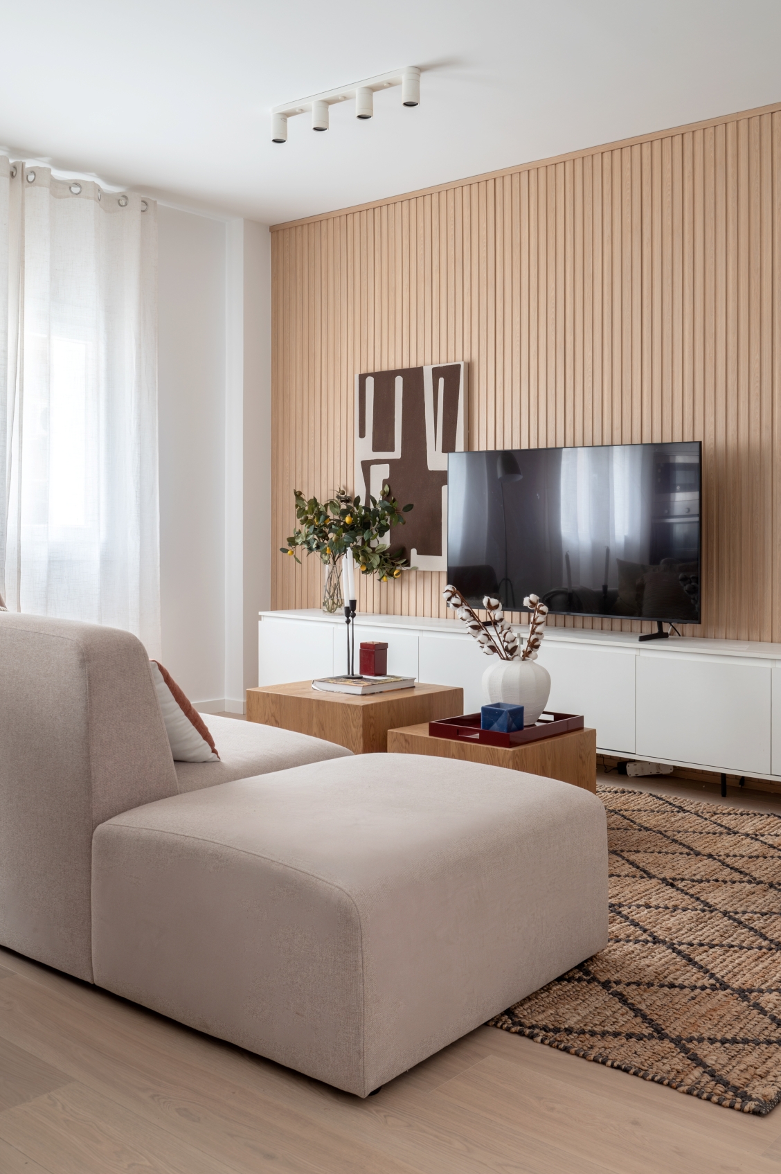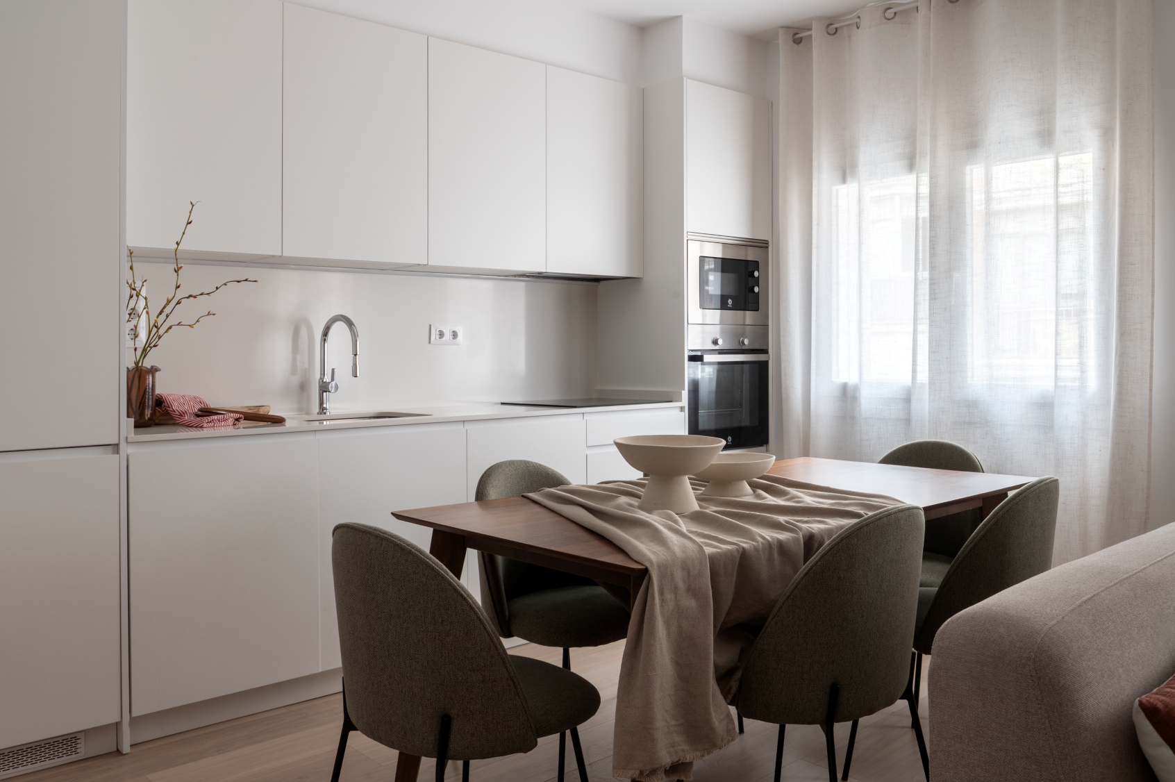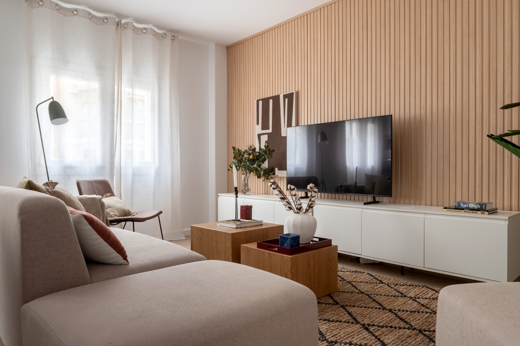 The living room stands out for its elegant wooden paneling on the main wall, providing great warmth to the space. Harmoniously integrated into the living area, we find a modern kitchen with clean lines in white. This space has been designed to maximize both aesthetics and functionality, offering a large storage capacity and a comfortable adjoining dining area with capacity for 6 people. It is equipped with large and small appliances and a varied and complete kitchenware.