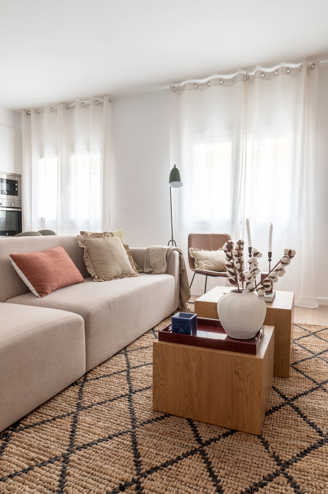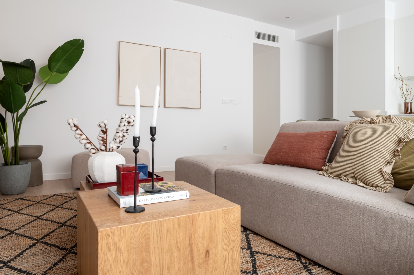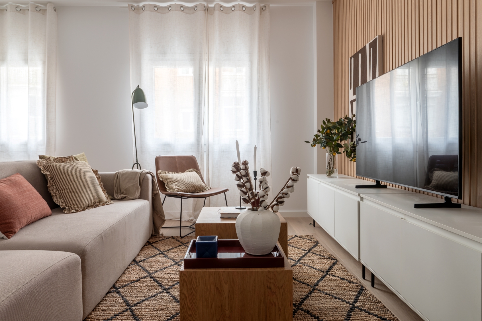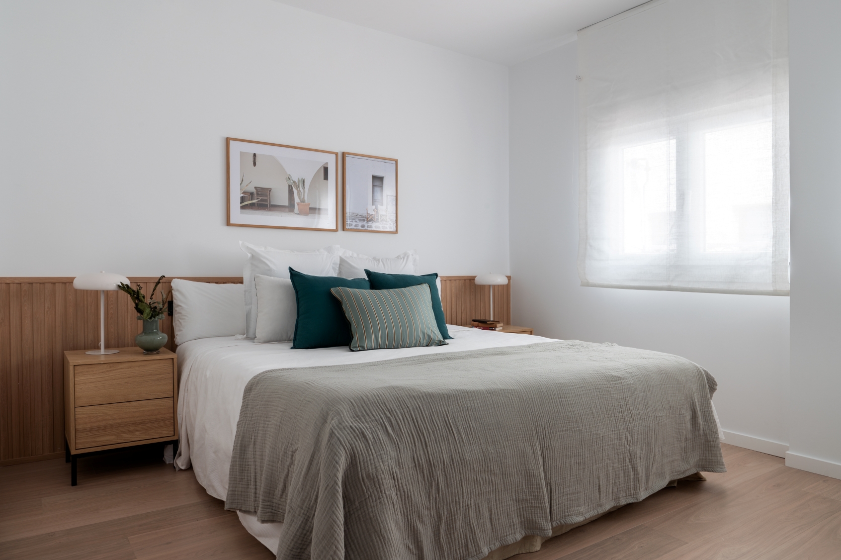 The living room stands out for its elegant wooden paneling on the main wall, providing great warmth to the space. Harmoniously integrated into the living area, we find a modern kitchen with clean lines in white. This space has been designed to maximize both aesthetics and functionality, offering a large storage capacity and a comfortable adjoining dining area with capacity for 6 people. It is equipped with large and small appliances and a varied and complete kitchenware.