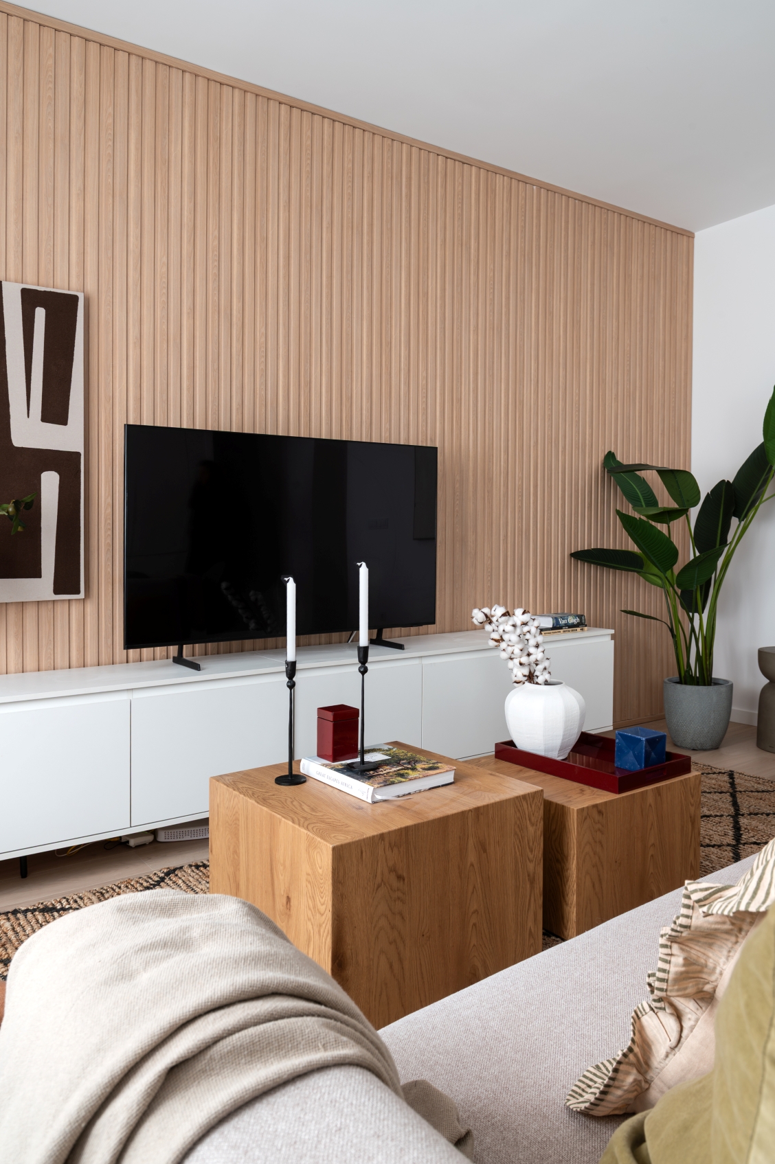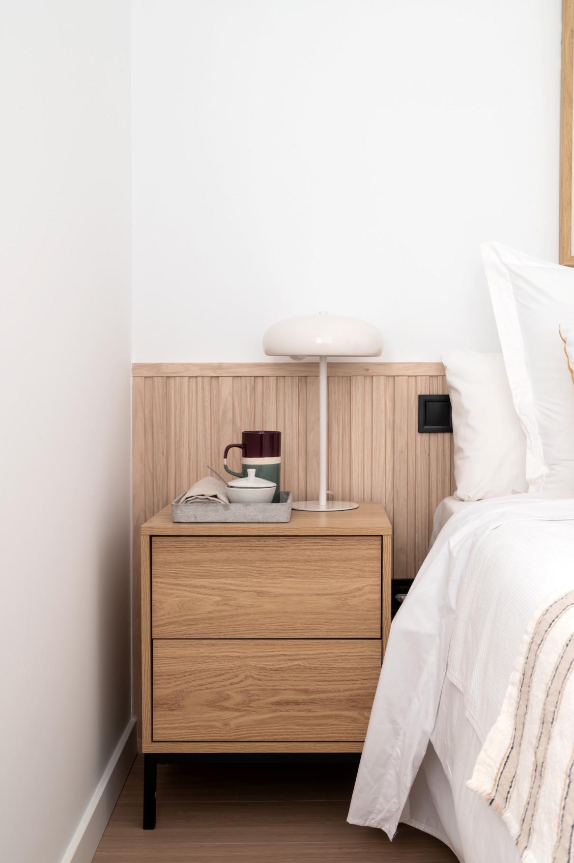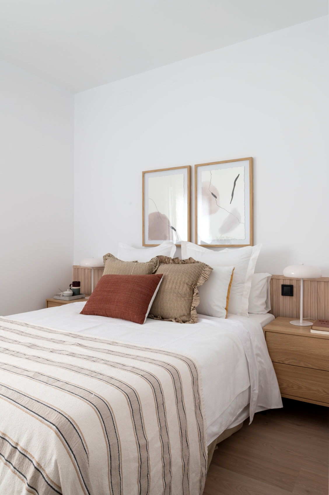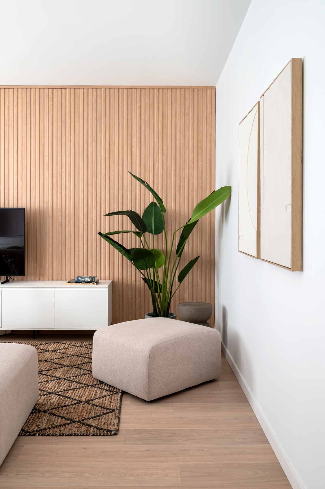 The living room stands out for its elegant wooden paneling on the main wall, providing great warmth to the space. Harmoniously integrated into the living area, we find a modern kitchen with clean lines in white. This space has been designed to maximize both aesthetics and functionality, offering a large storage capacity and a comfortable adjoining dining area with capacity for 6 people. It is equipped with large and small appliances and a varied and complete kitchenware.