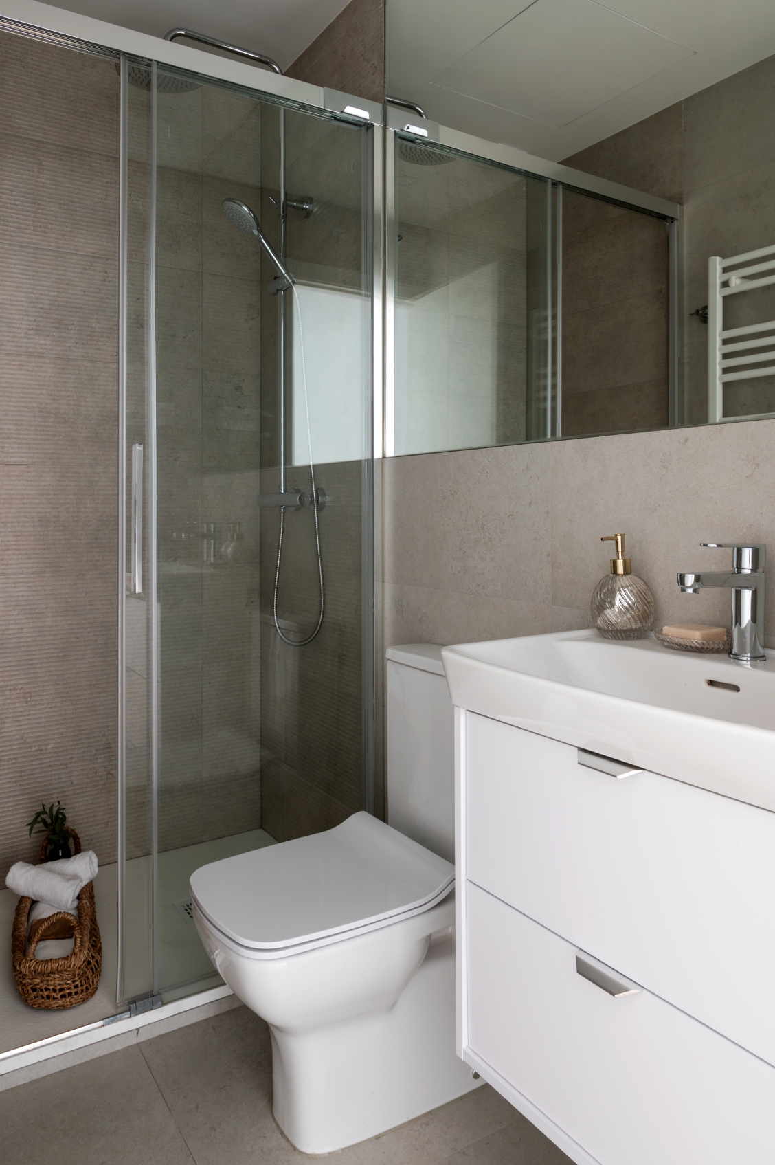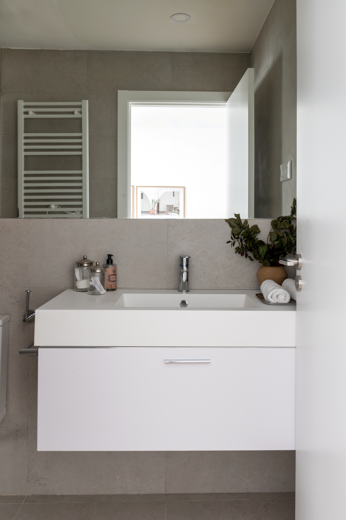 The master bedroom, conceived as a private suite, has a full ensuite bathroom, while the other two bedrooms share a second full bathroom with access from the hallway, which also serves visitors.