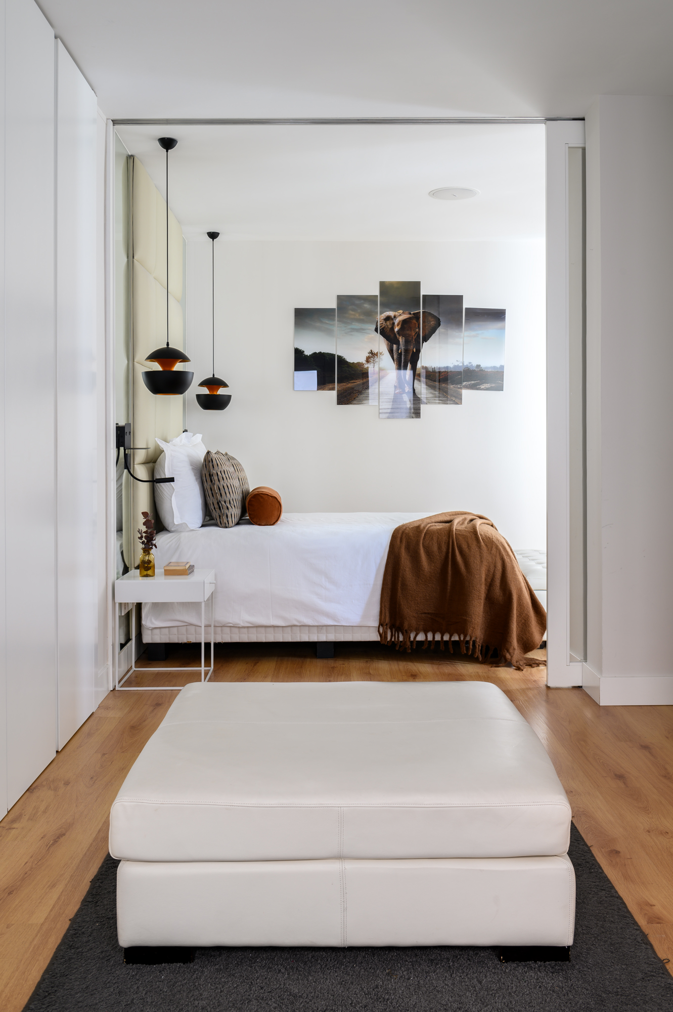 Al acceder a la vivienda, nos encontramos con la zona privada, donde descansan los dos dormitorios dobles. El dormitorio principal está equipado con una amplia cama de matrimonio, un espacioso vestidor y un cuarto baño en suite con doble lavabo, ducha y bañera. A continuación, el segundo dormitorio, también con cama de matrimonio y armarios empotrados, se sitúa junto a un baño completo que da servicio tanto a esta estancia como a las visitas.
